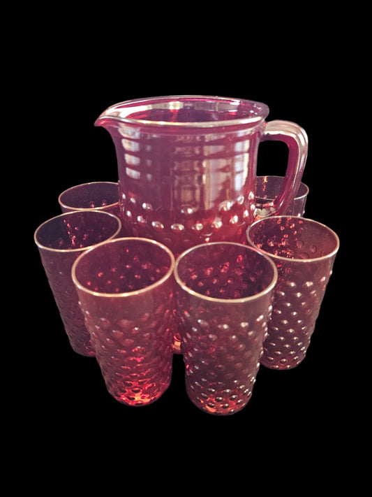 Set - Ruby Red Anchor Hocking Pitcher with 6 Glasses, Hobnail Pattern, MCM
