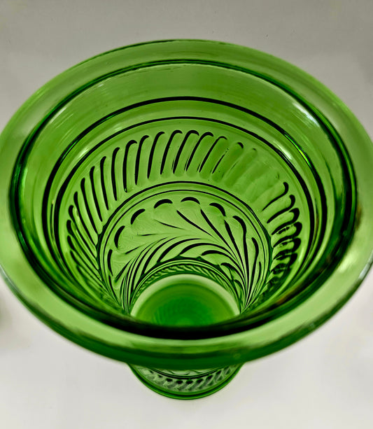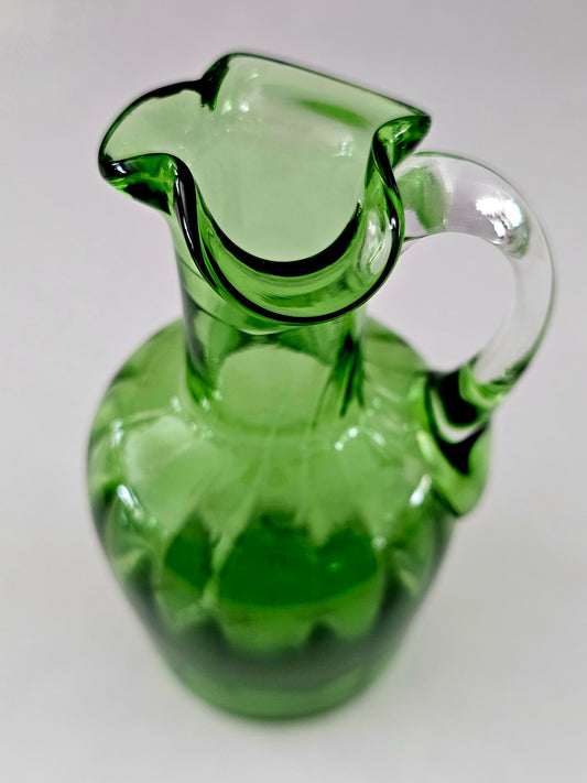 Pilgrim House Hand Blown Glass Bud Vase, Cruet, Olive Green with Applied Clear Handle