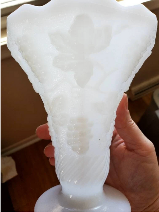 Anchor Hocking Footed Milk Glass Vase with Grapes and Grape Leaves