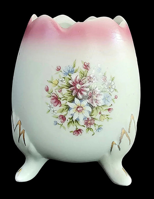 Hand Painted Cracked Egg Vase, Pink and White with Flowers and Gold Accents in a Matte Finish, made in Japan. Small Chip.