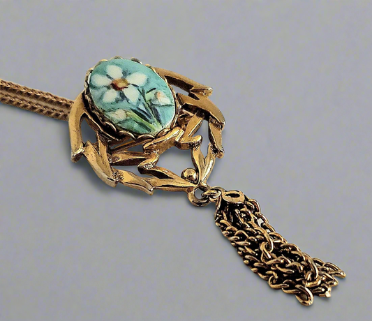 24" Victorian Style Pendant Necklace and Broach with White Flower on Blue Background and Metal Tassel