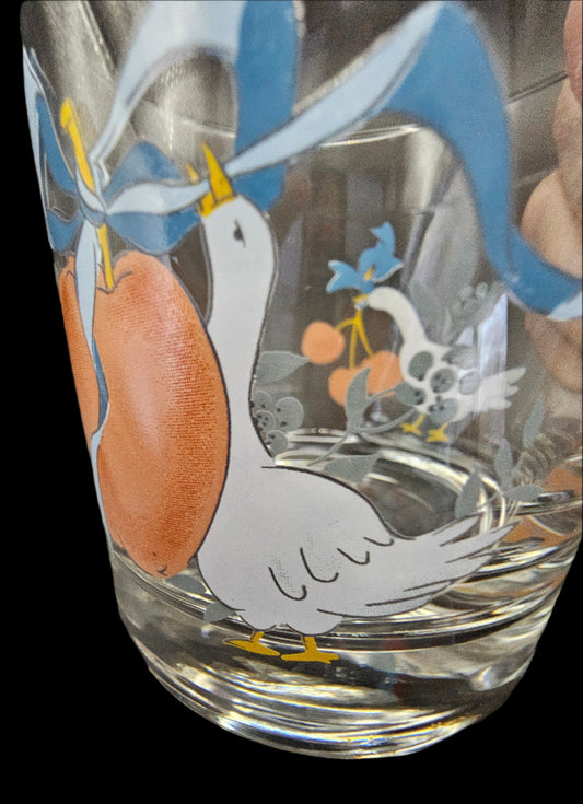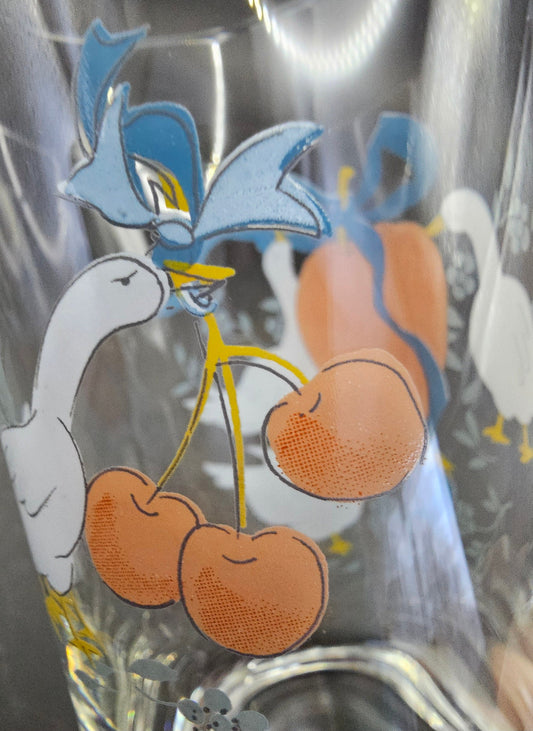 Marmalade 12 oz Tumbler/Water Glass from International Tableworks (1980s). Speckled Cream Stoneware w/ Geese, Fruits Motif in Red and Blue.
