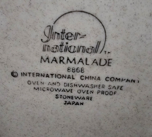 Marmalade Dinner Plate from International Tableworks-Vintage (1980s). Speckled Cream Stoneware with Geese and Fruits Motif in Red and Blue.