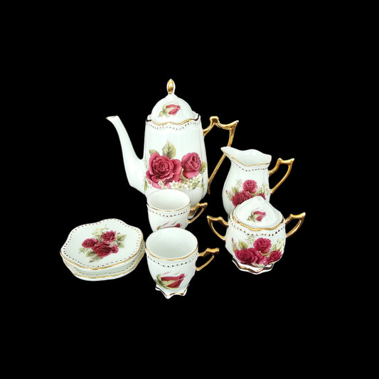 Miniature Porcelain Tea Set with Red Roses and Gilt Accents