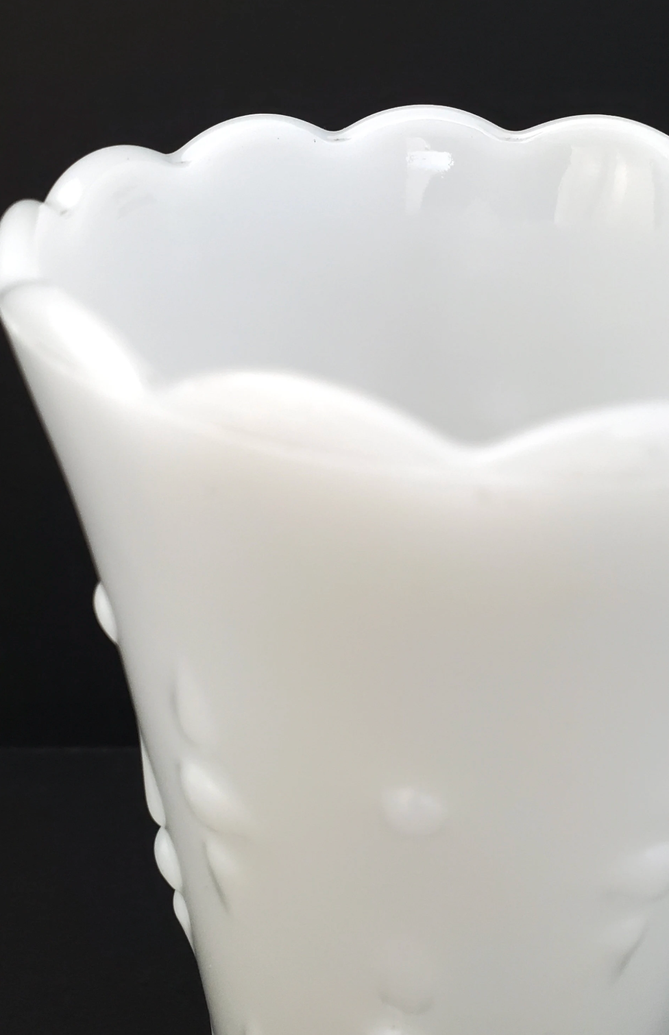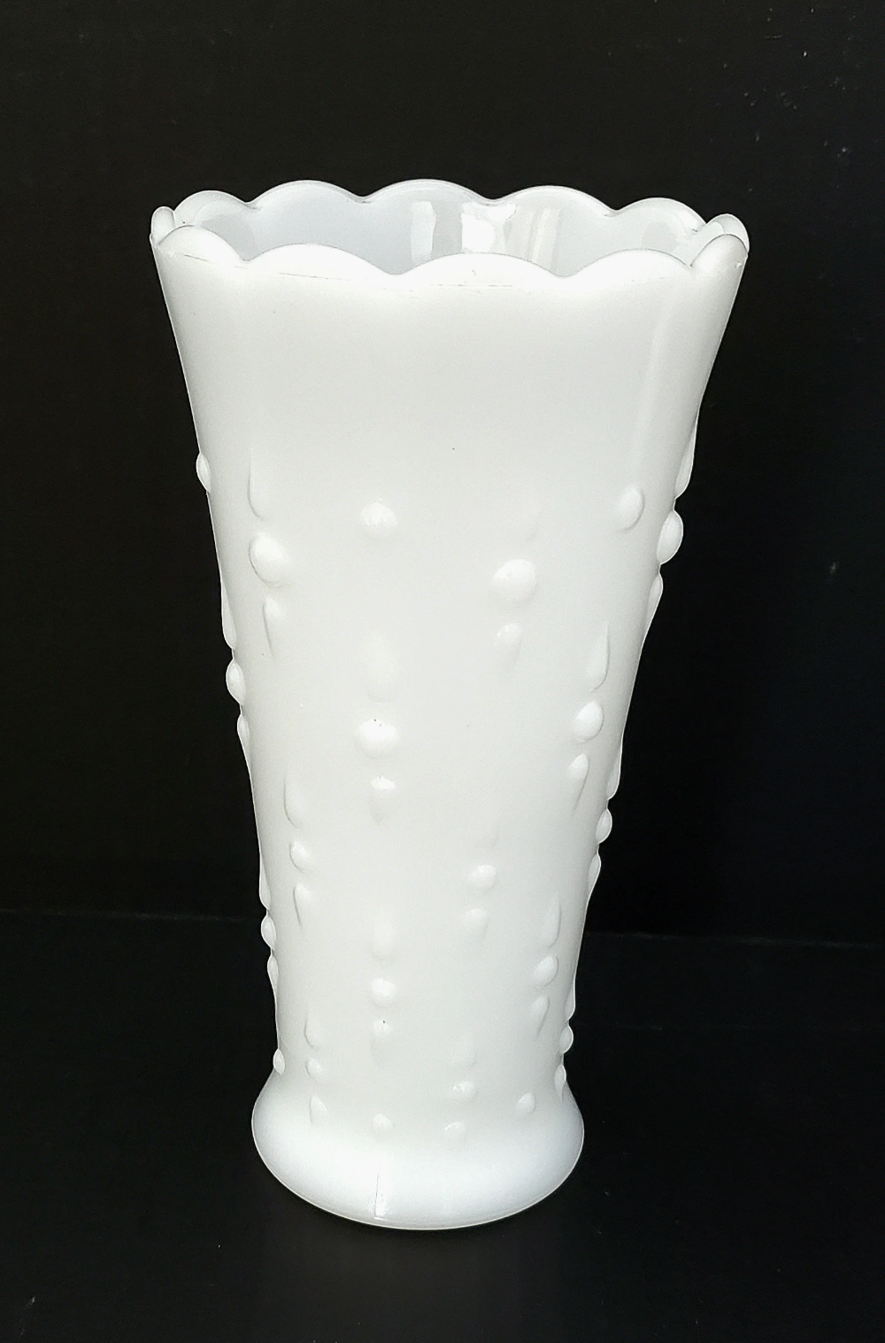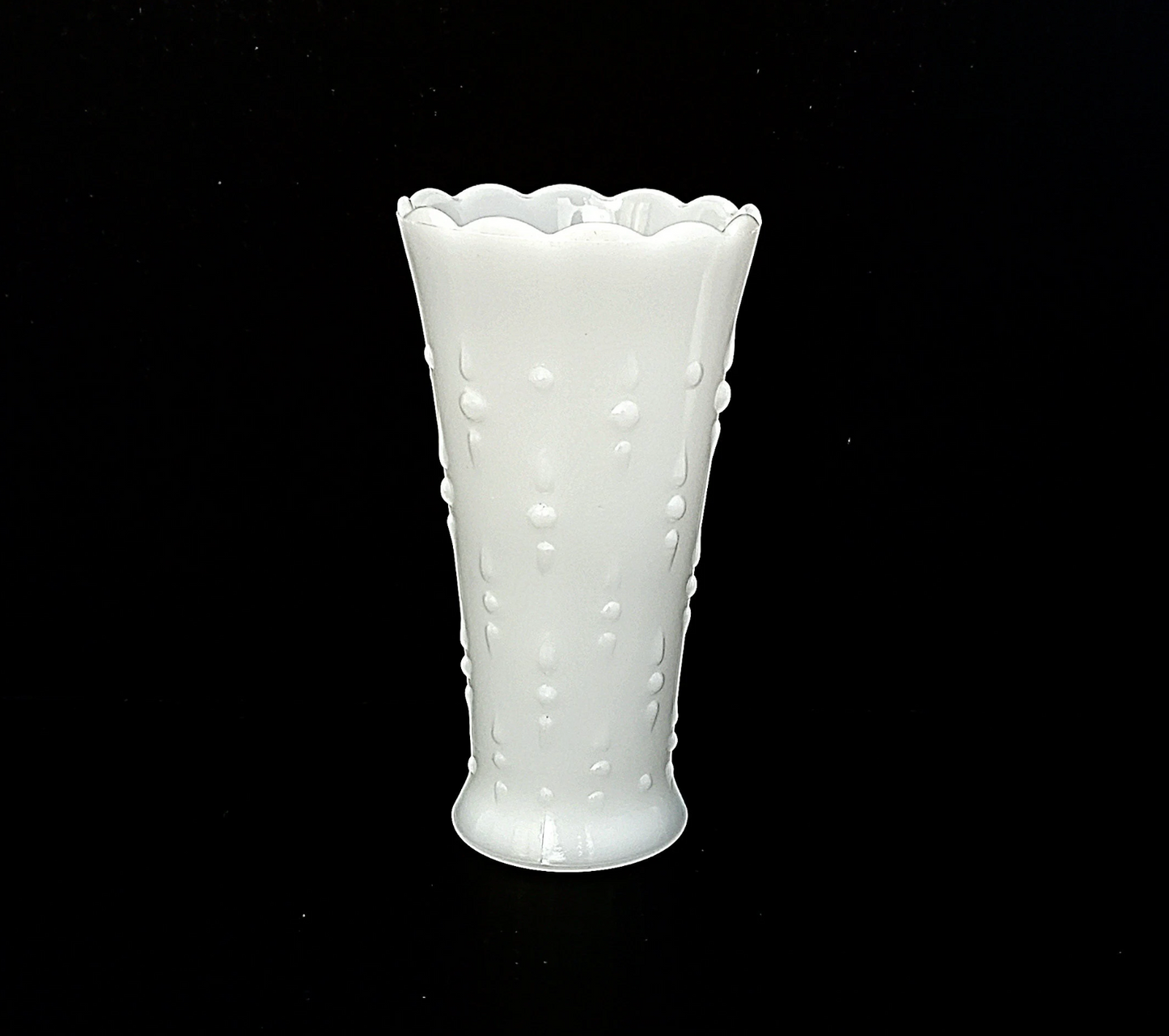 This milk glass vase from Anchor Hocking is graced with the teardrop and pearl pattern, which makes it look quite elegant. It stands 7" tall and is 3 3/4" wide at the mouth.
