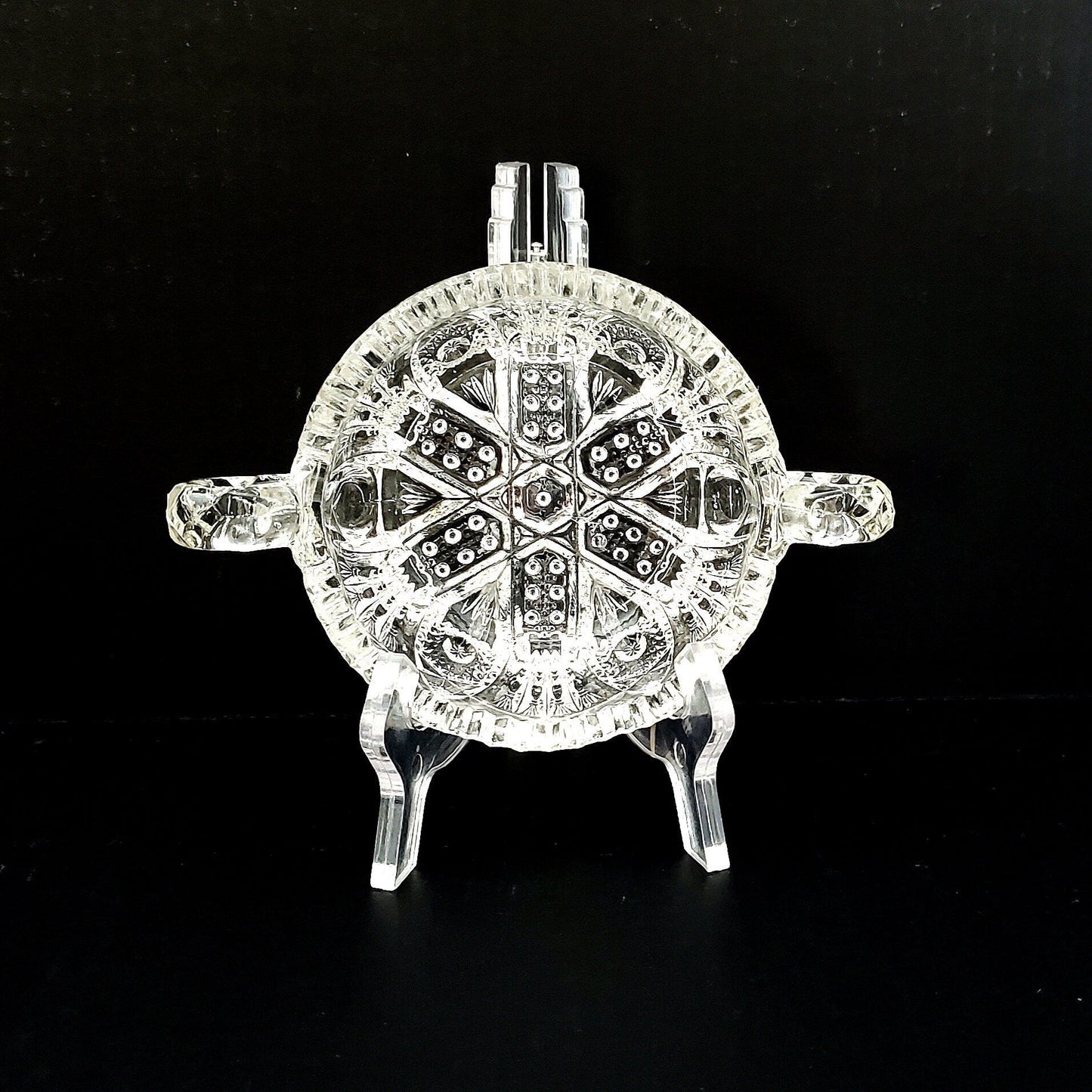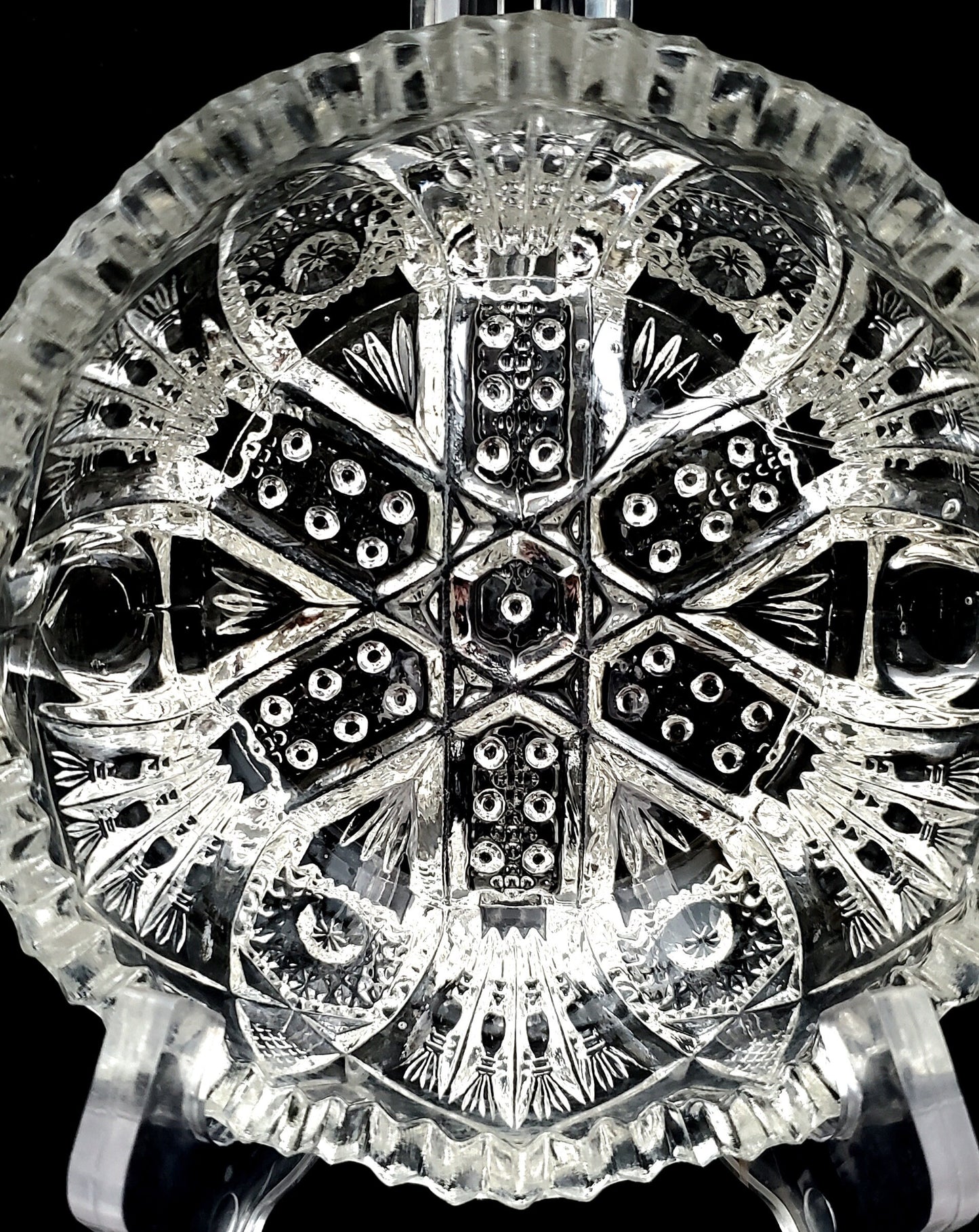 This piece of American brilliant period cut glass is absolutely *stunning*. This little dish is a two-handled nappy - it has two handles and a scalloped edges with cut glass "teeth" surrounding. It has a number of different patterns throughout, including wheat and button patterns. It stands just under 2" high and is 7" across at the widest point (handles).
