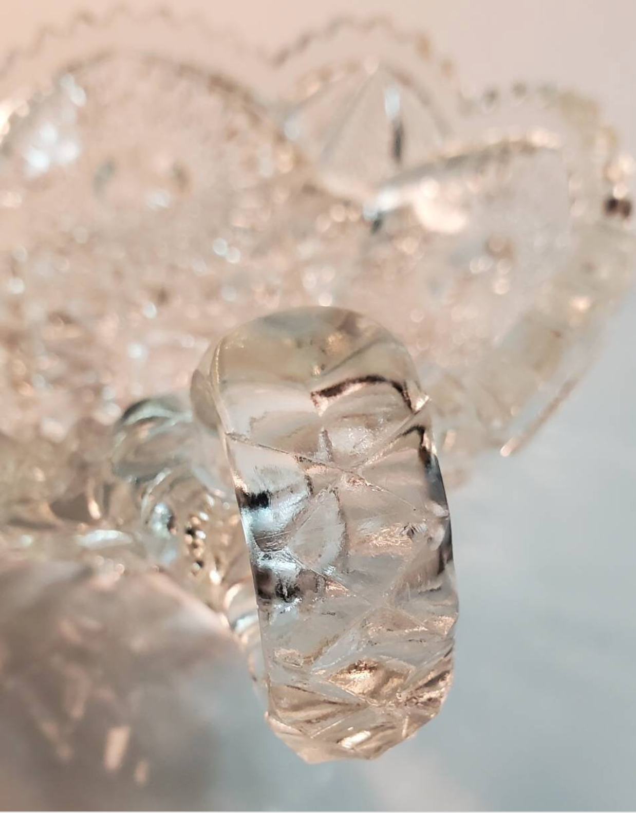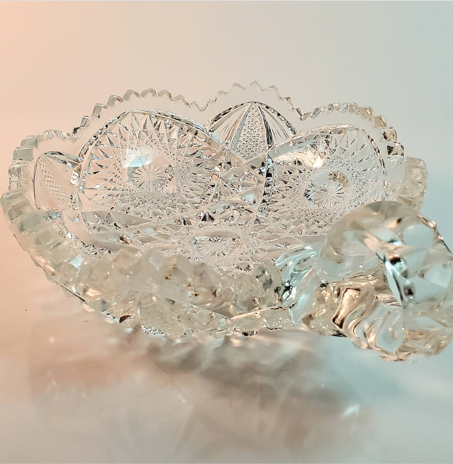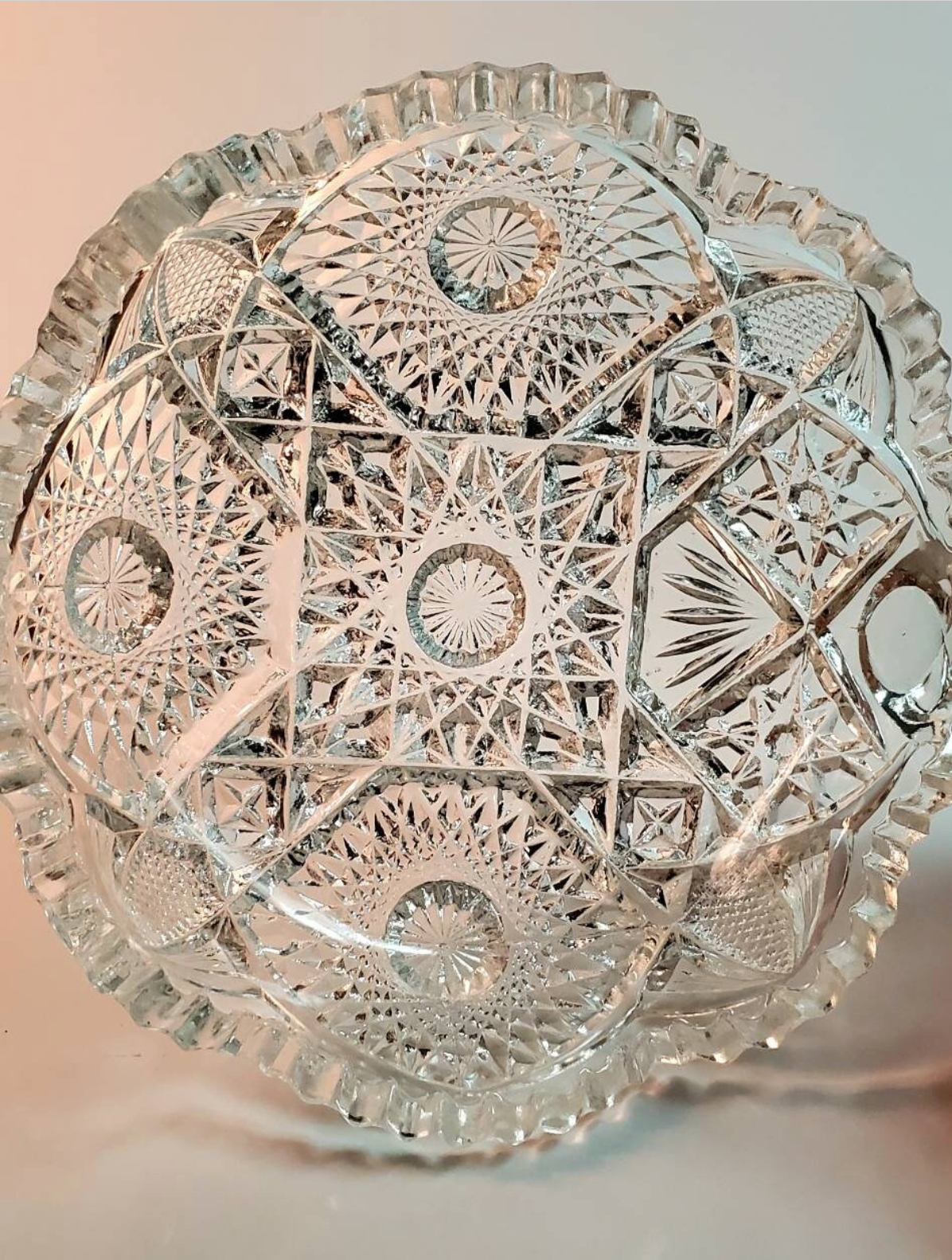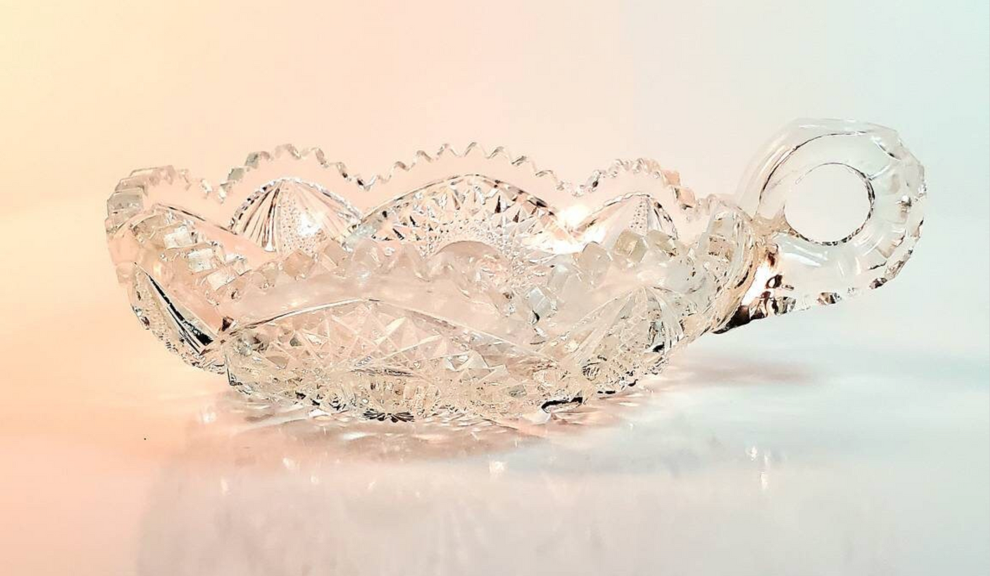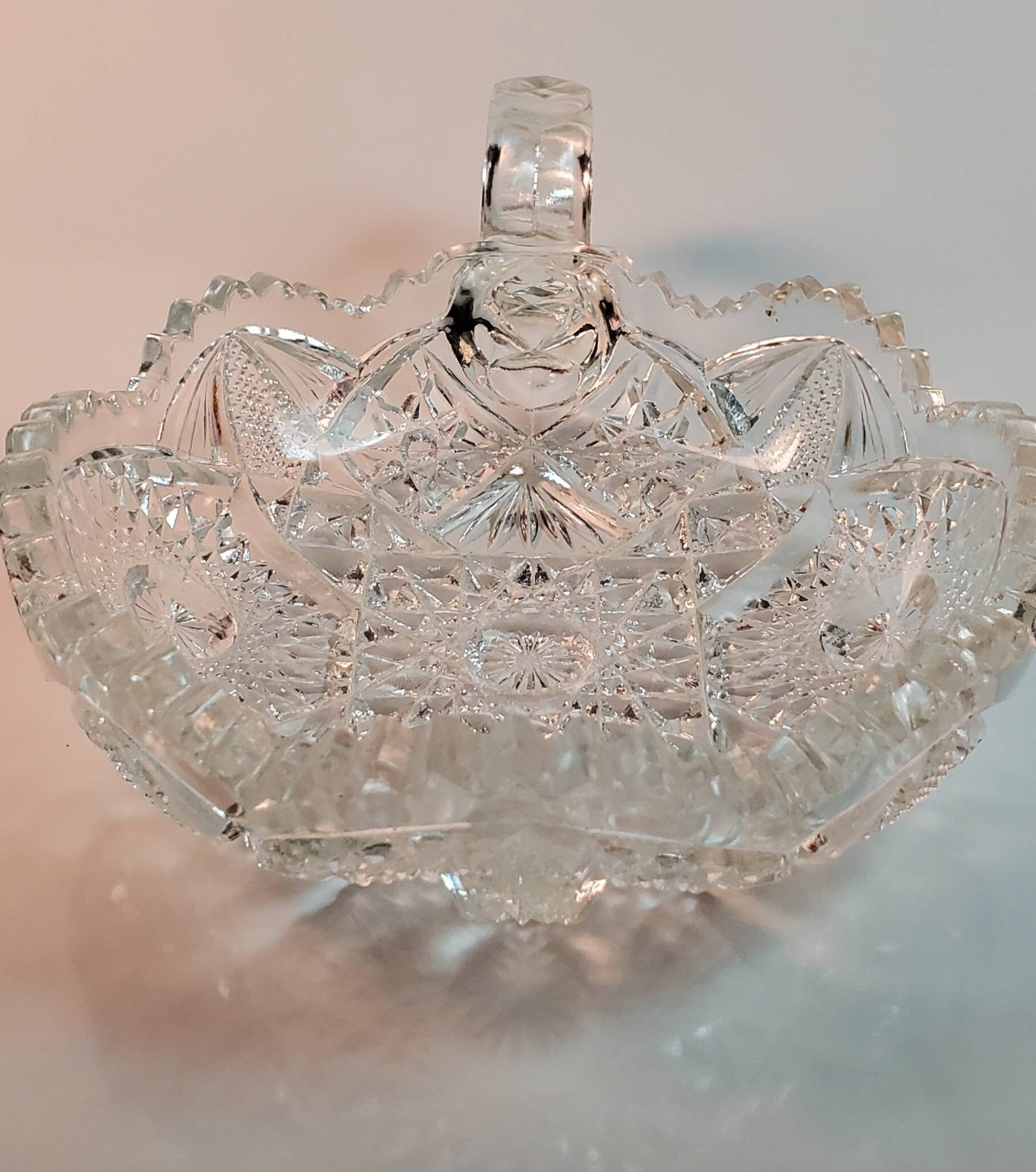 This little dish is from the early 1900's, from the American Brilliant Period. It's cut glass, with multiple designs cut into the exterior that create gorgeous faceting and light refraction. It has a scalloped edge with cut glass teeth all around. It has a handle on one side.