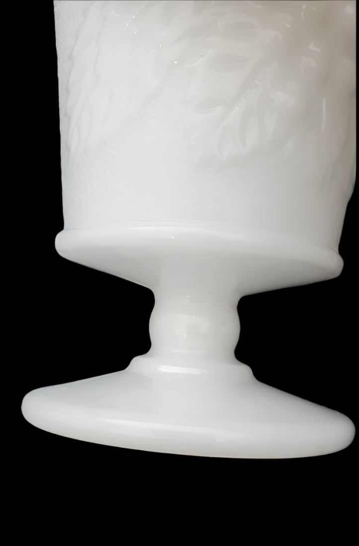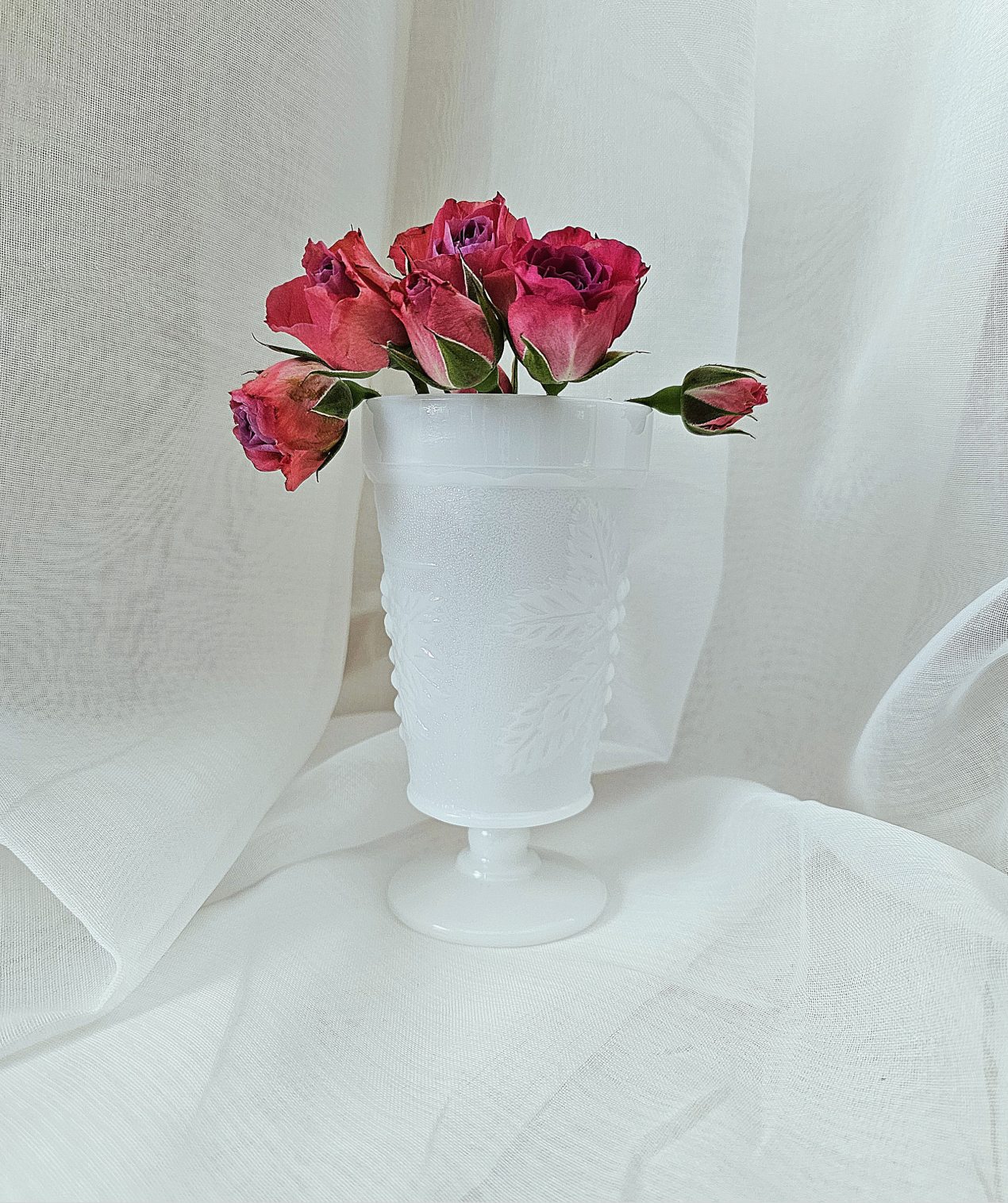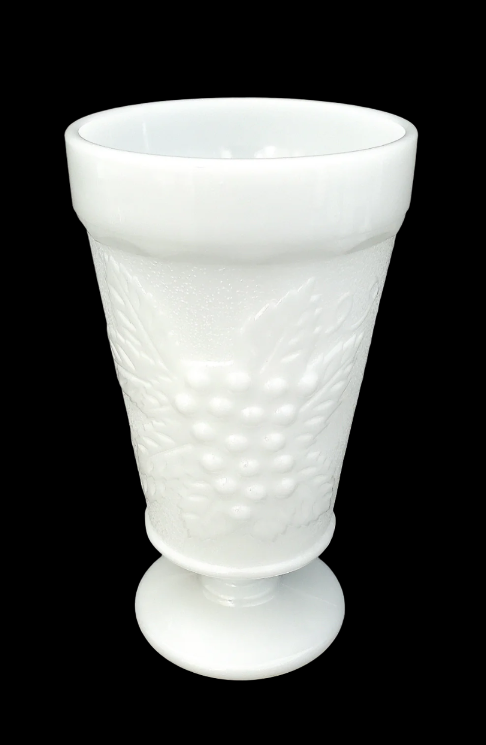 This footed goblet by Anchor Hocking is embossed with the Harvest Grapes pattern, with grapes and grape leaves in relief on the bowl. It stands just under 6" tall and just over 3" wide at the top. As milk glass, it is collectable. This goblet would look great with cottage, cottage core, shabby chic, or boho decor, and makes a cute flower vase.
