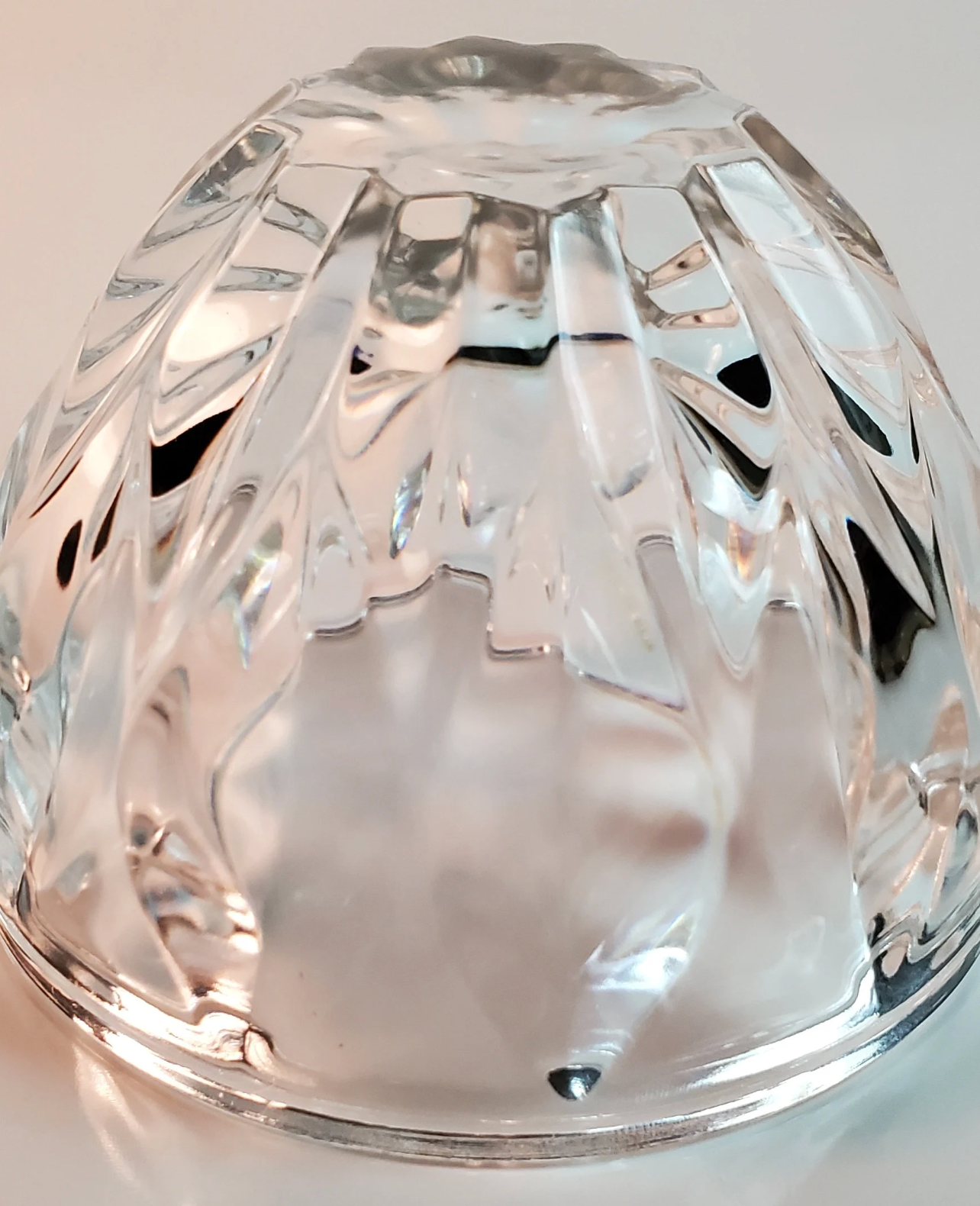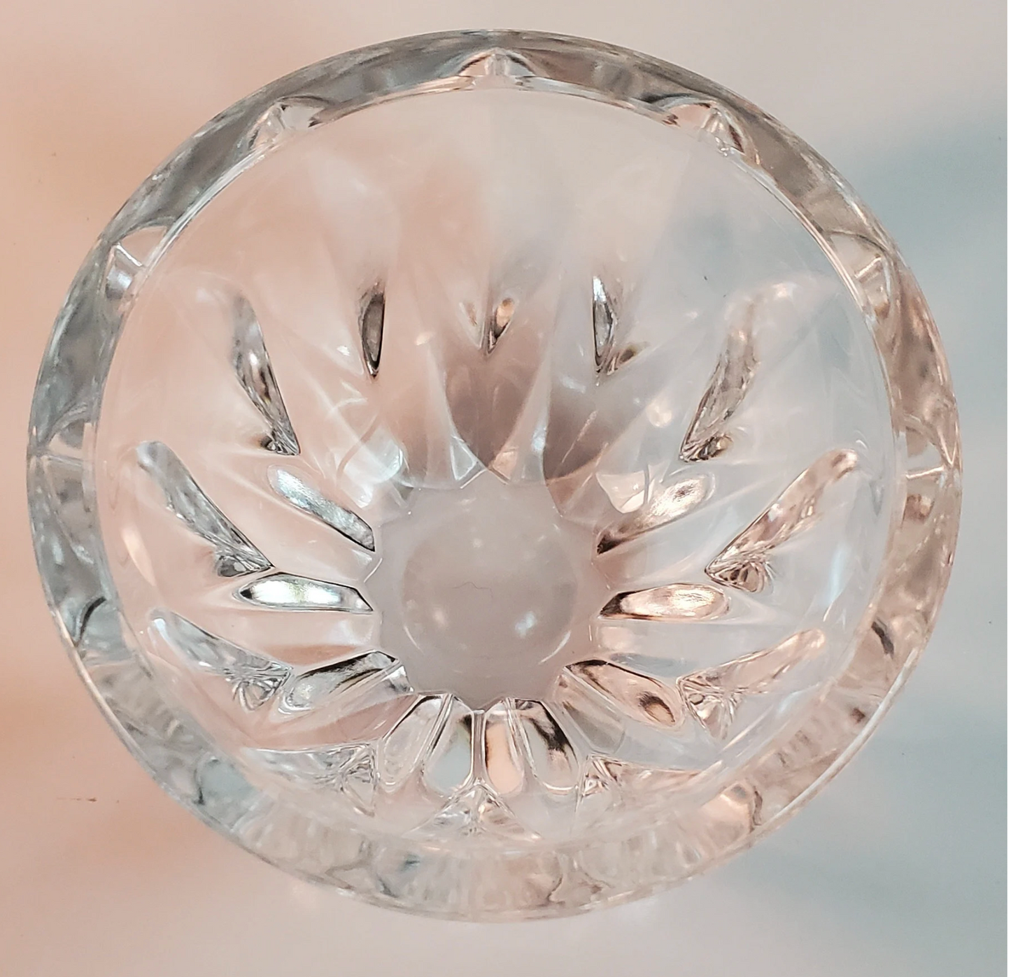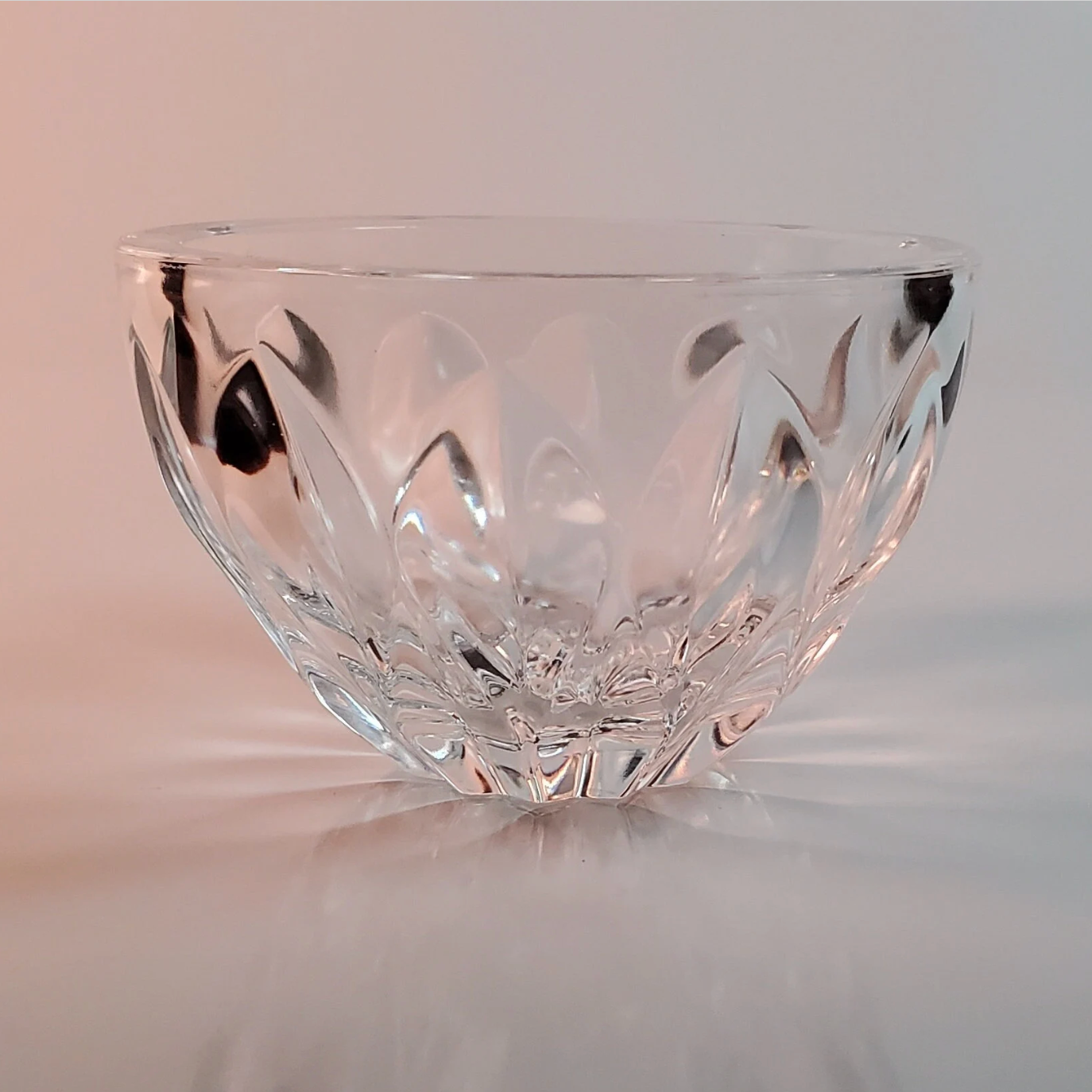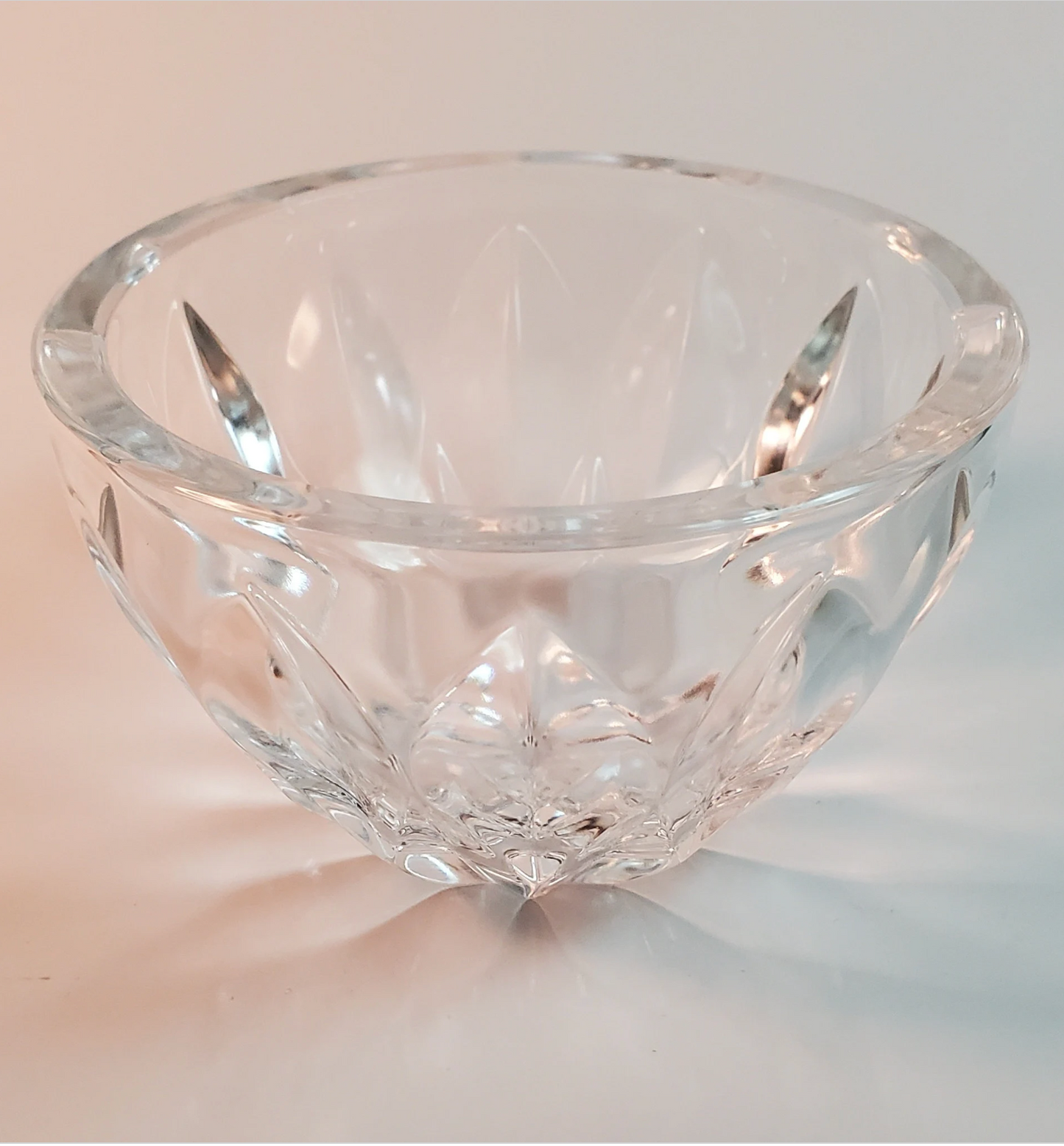 Thick walls and a beautifully simple, yet elegant design make this little bowl a stunning piece. Approximately 3" high and 4 1/2" from rim to rim, this bowl would make a lovely addition to your crystal collection, or gift it to someone else.