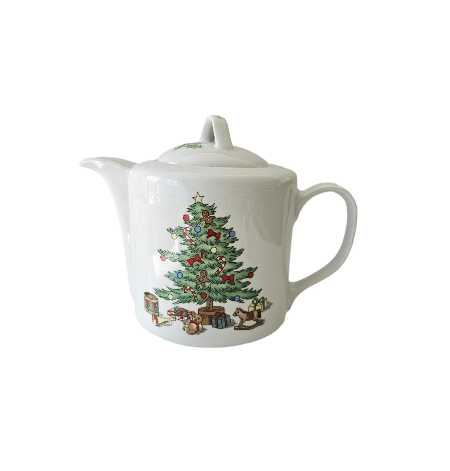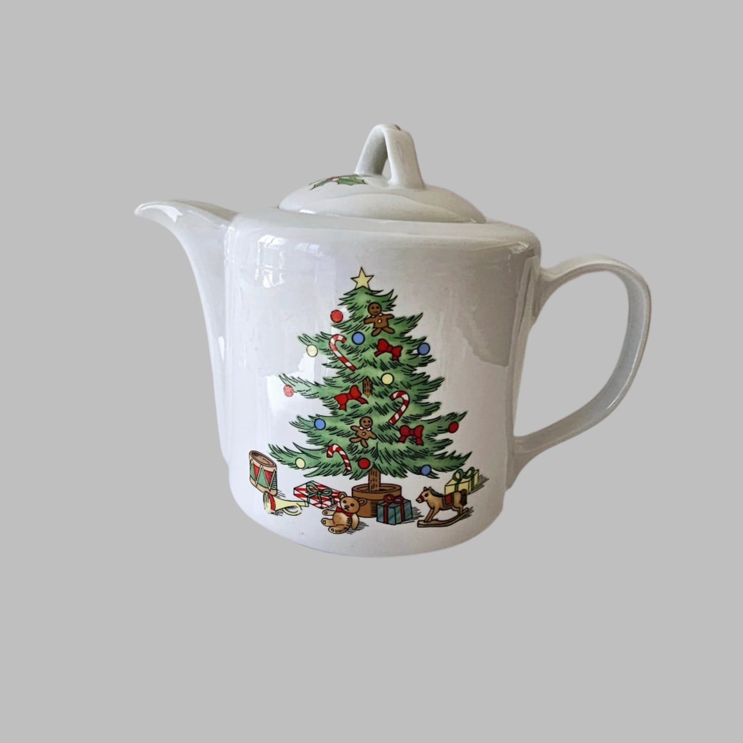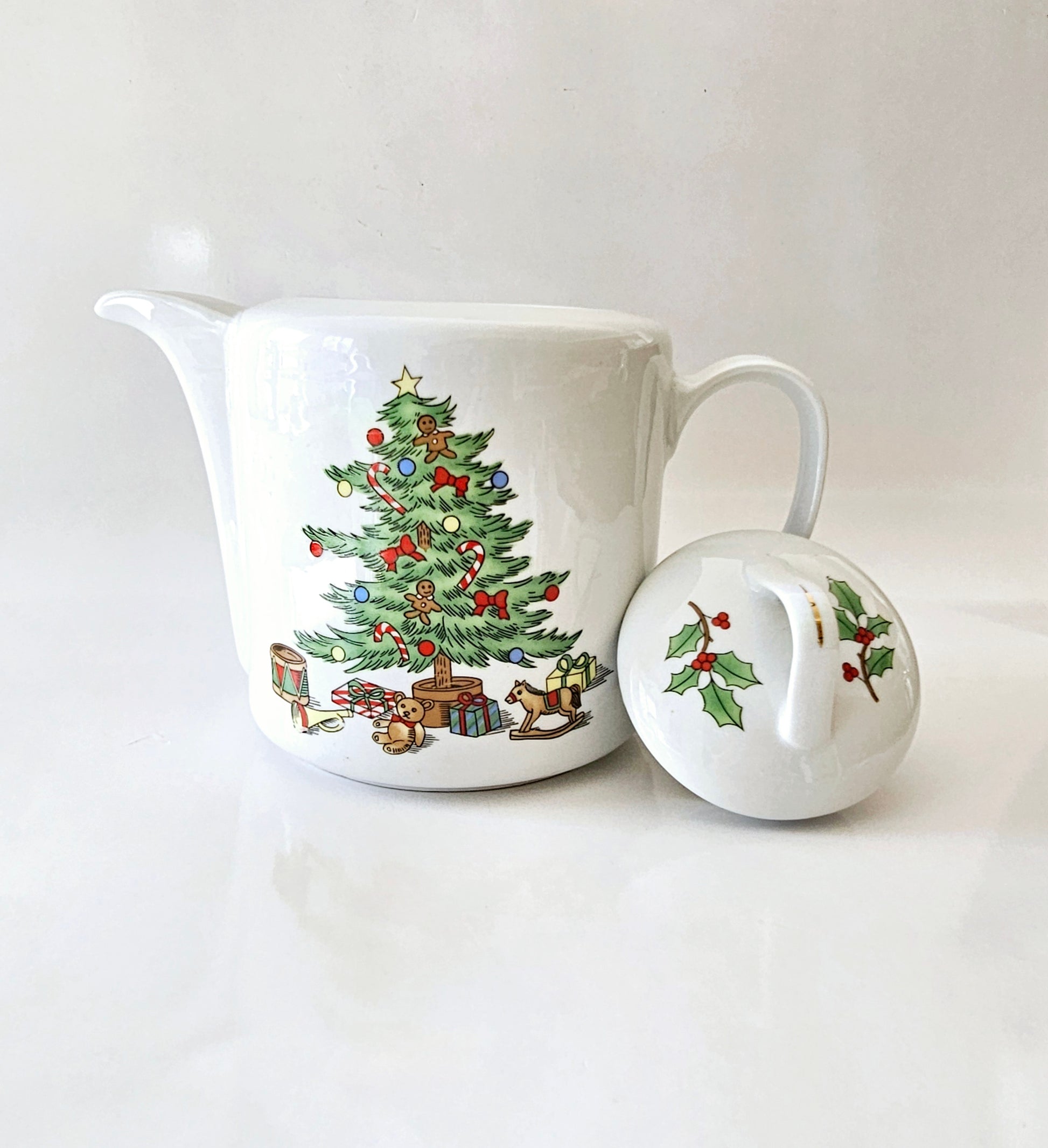 Holiday Hostess Collection 5 Cup Christmas Tea Pot manufactured in Taiwan, Japan, or China for Tienshan. This piece is part of a much larger holiday collection that has been discontinued. It is 6 5/8" tall.