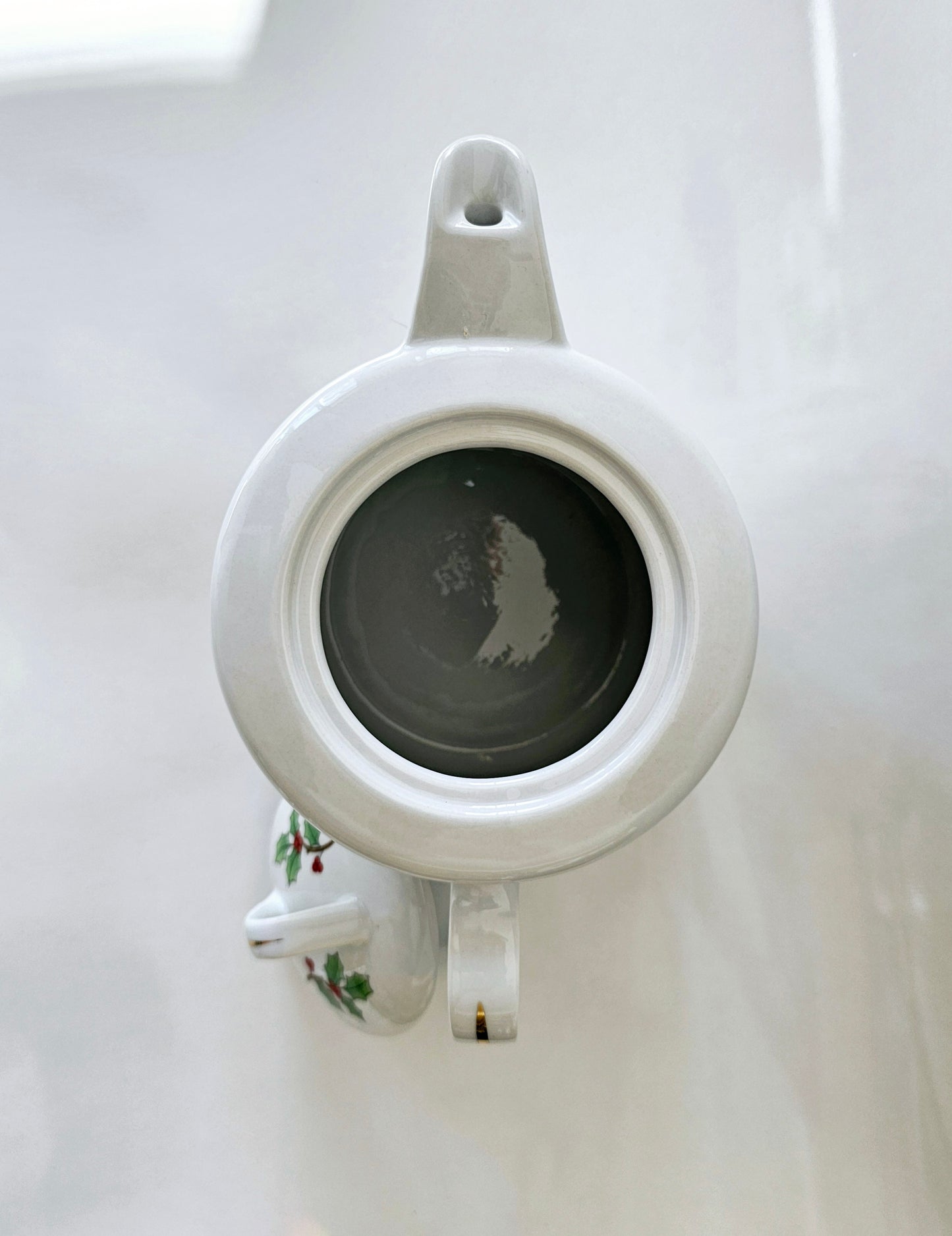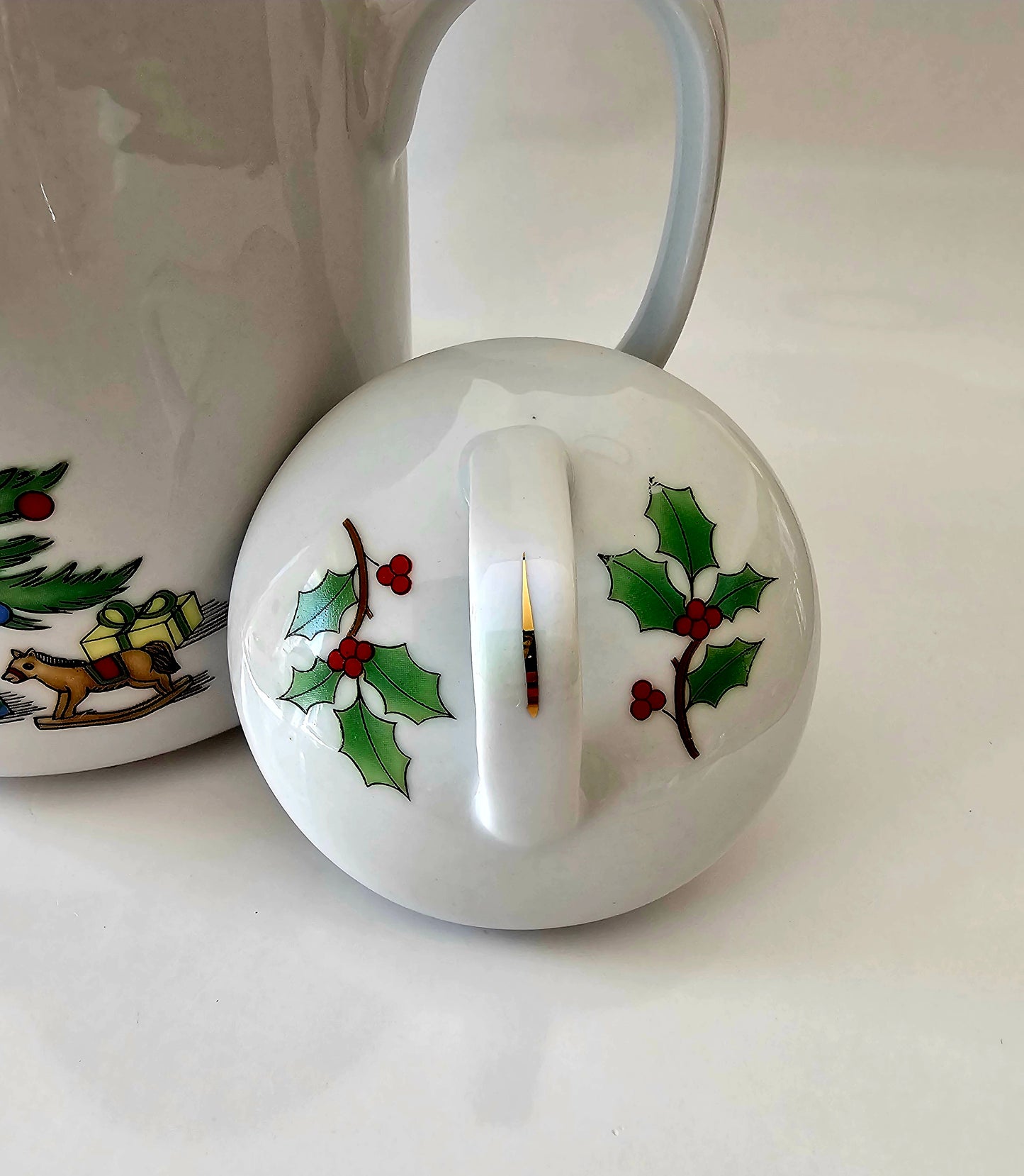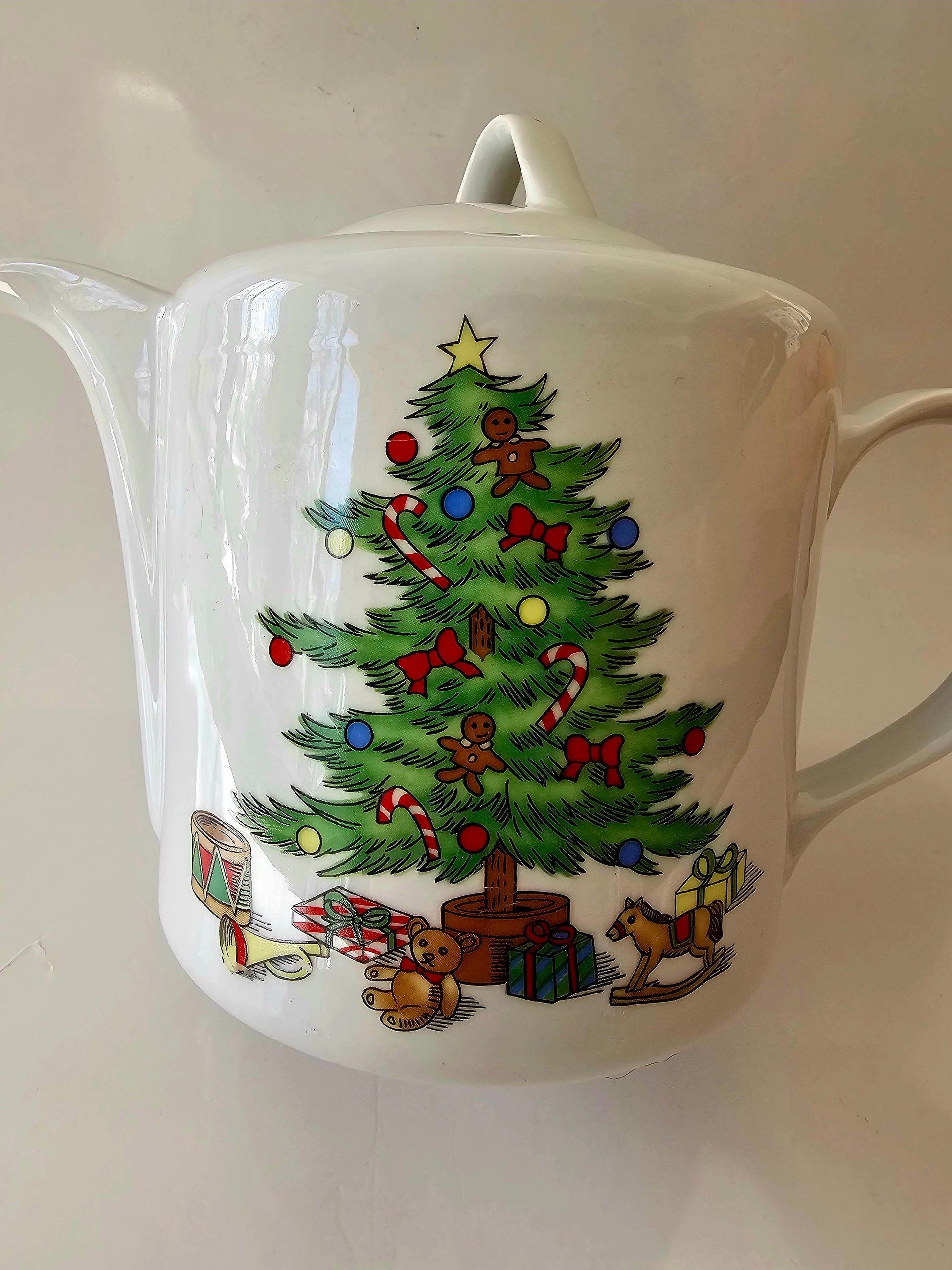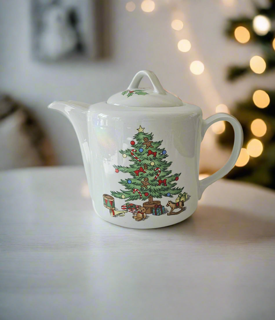 Holiday Hostess Collection 5 Cup Christmas Tea Pot manufactured in Taiwan, Japan, or China for Tienshan. This piece is part of a much larger holiday collection that has been discontinued. It is 6 5/8" tall.