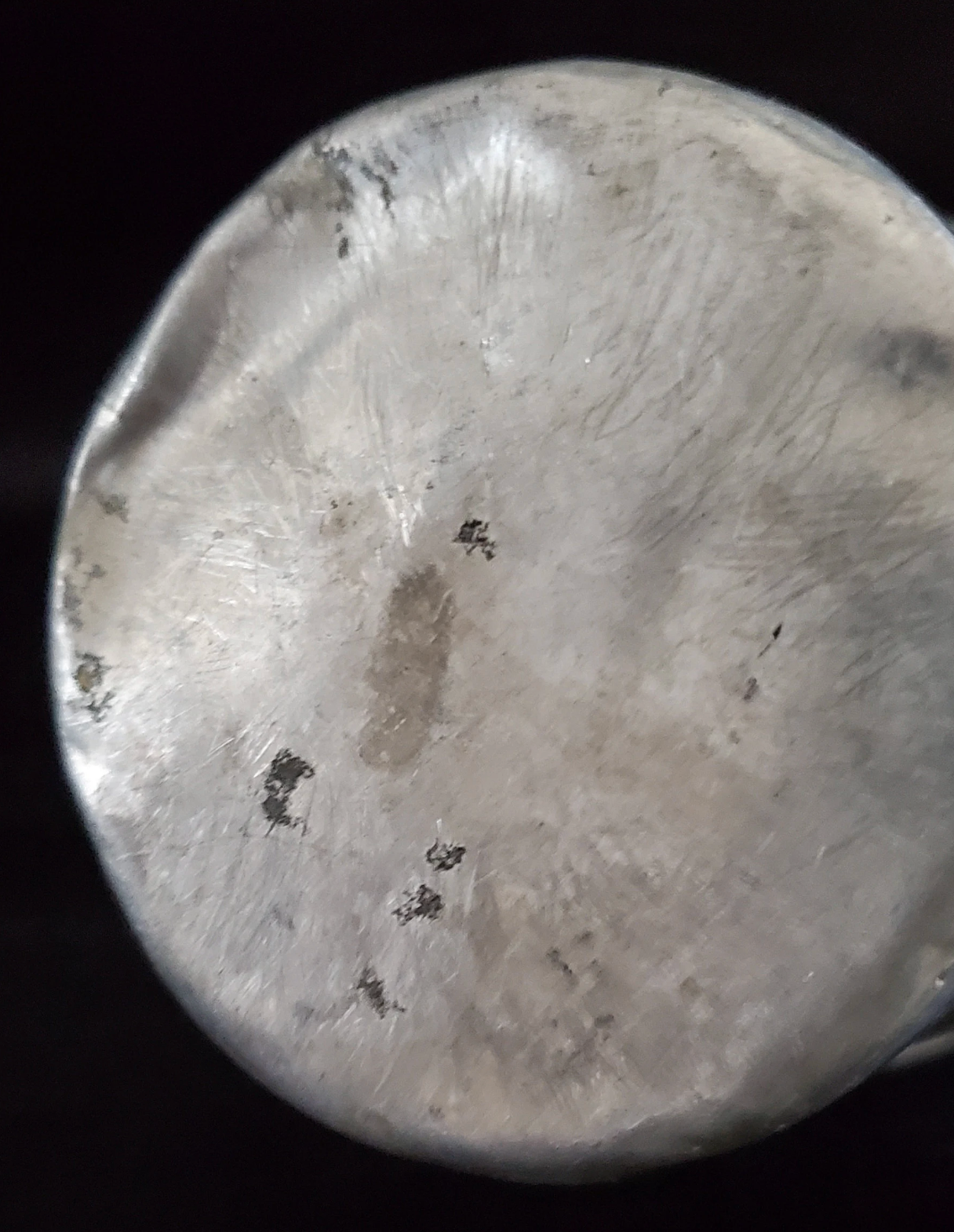 Condition: This piece has been well-loved and shows signs of wear. It has scratching around the bottom edge, and the bottom is dented. It has been priced accordingly.