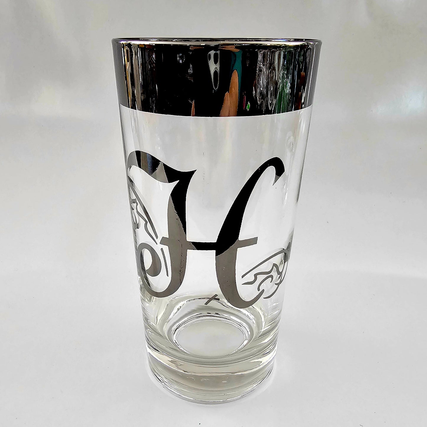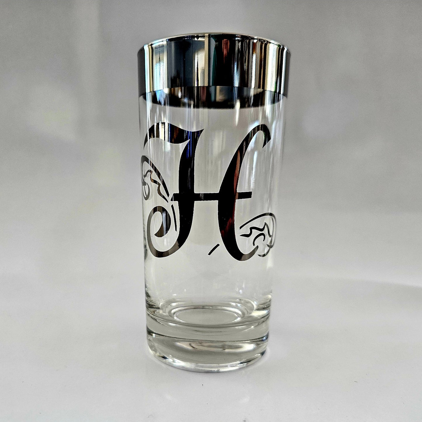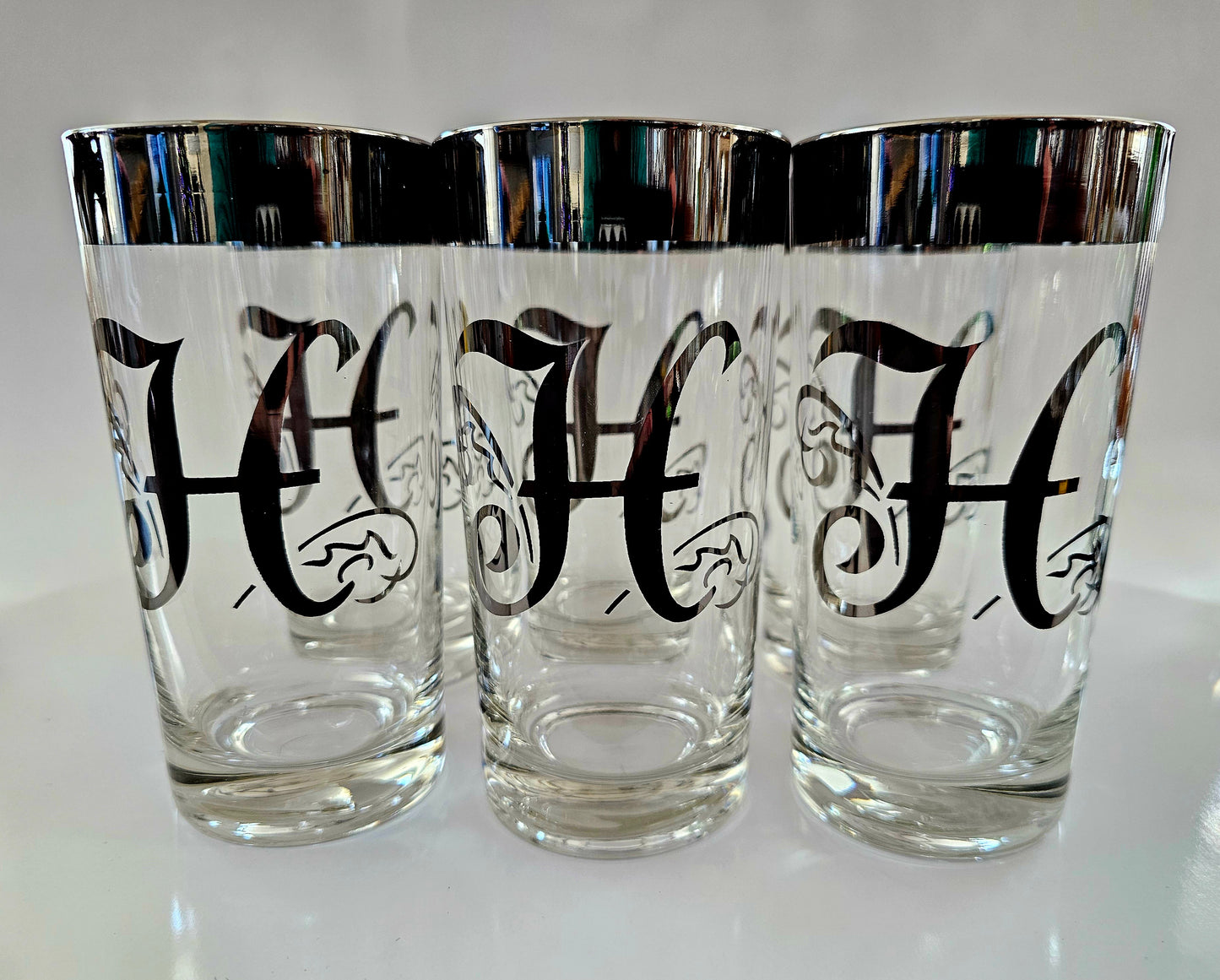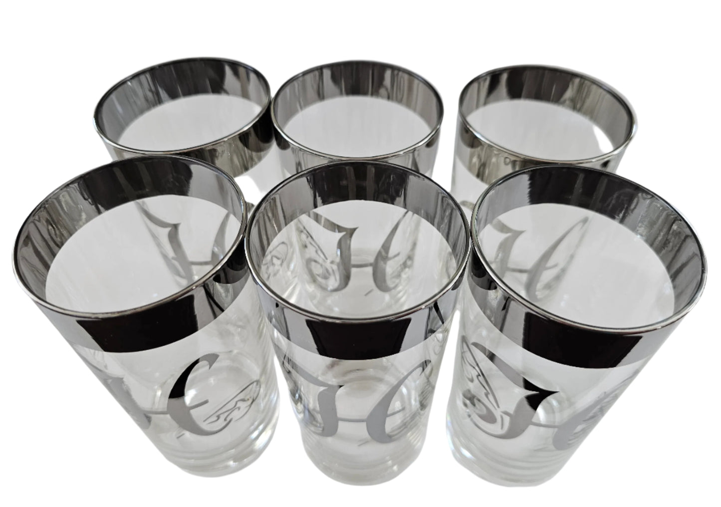 These Dorothy Thorpe highball glasses are in excellent condition. They are clear glass with wide silver plated rims and a silver-plated letter on the side. The plated areas appear to be sealed.