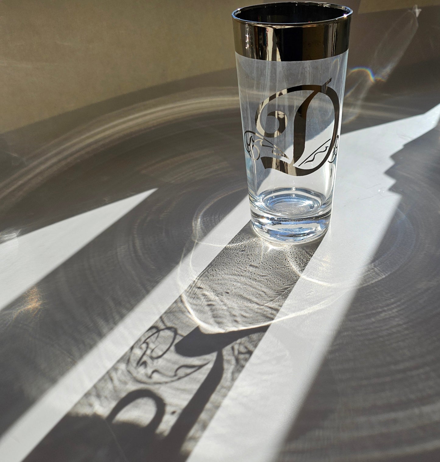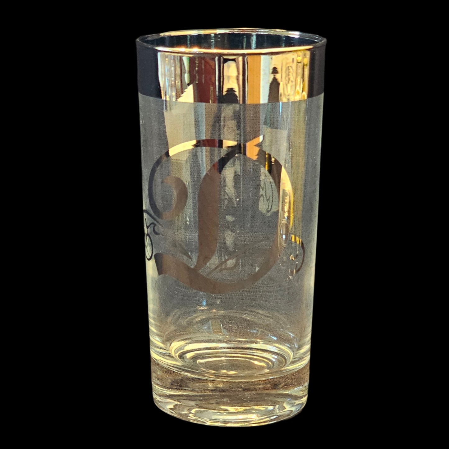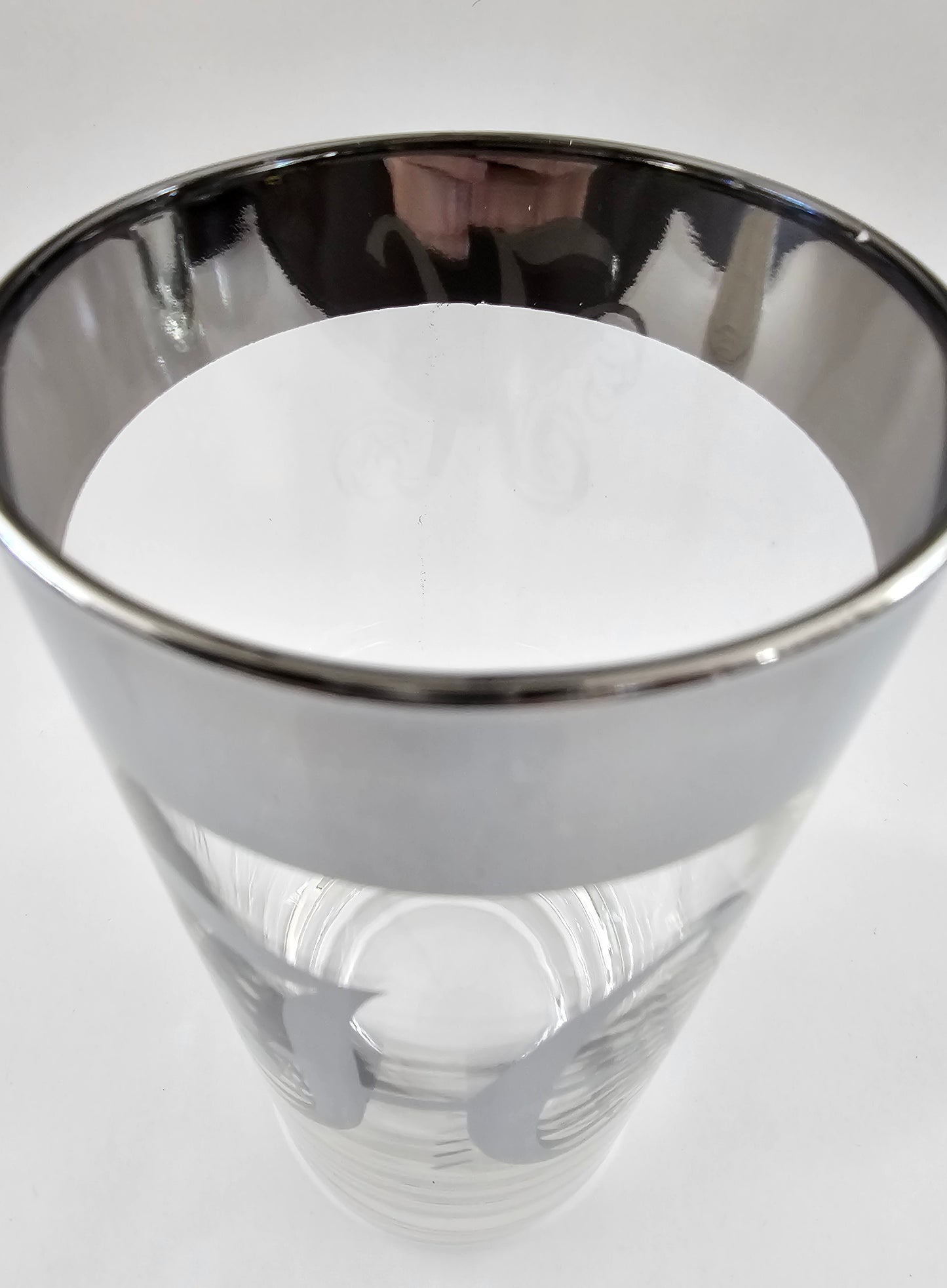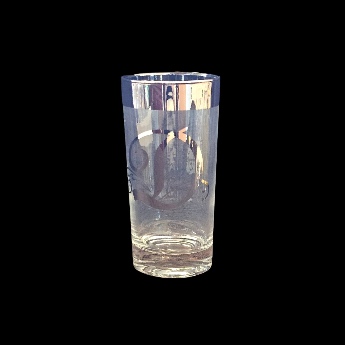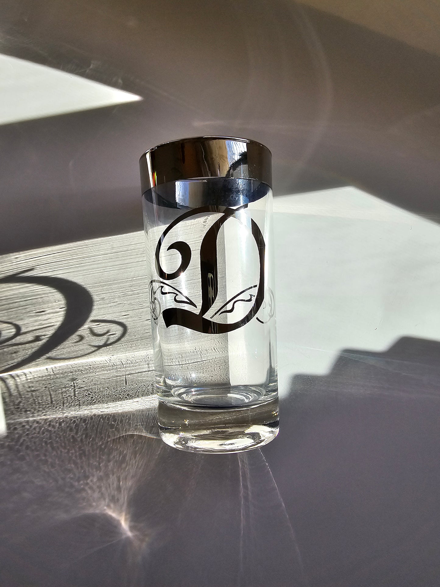 These Dorothy Thorpe highball glasses are in excellent condition. They are clear glass with wide silver plated rims and a silver-plated letter on the side. The plated areas appear to be sealed.