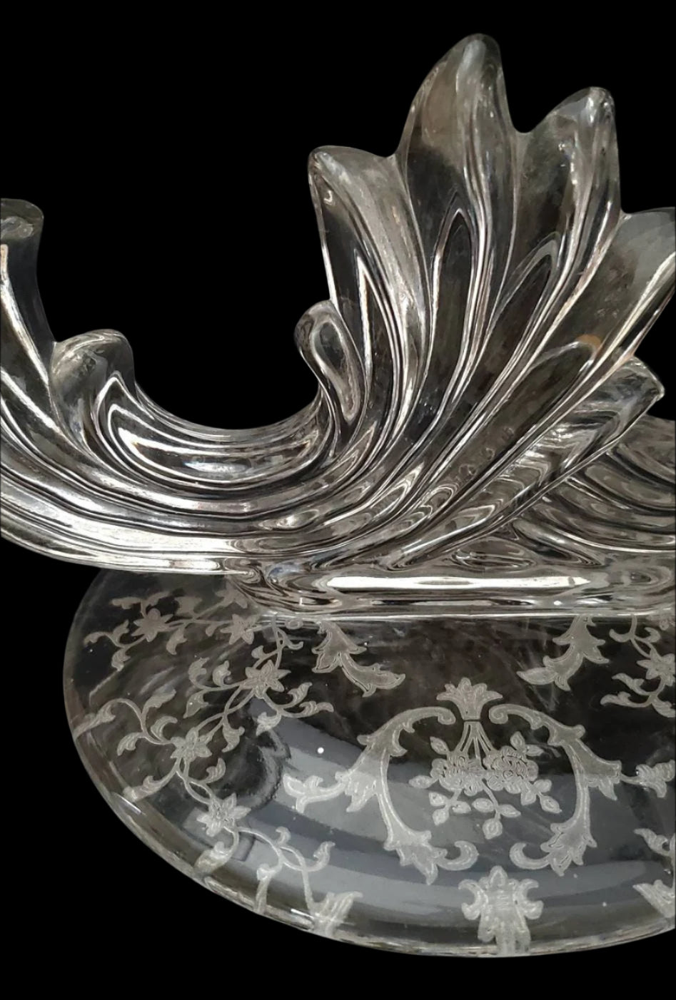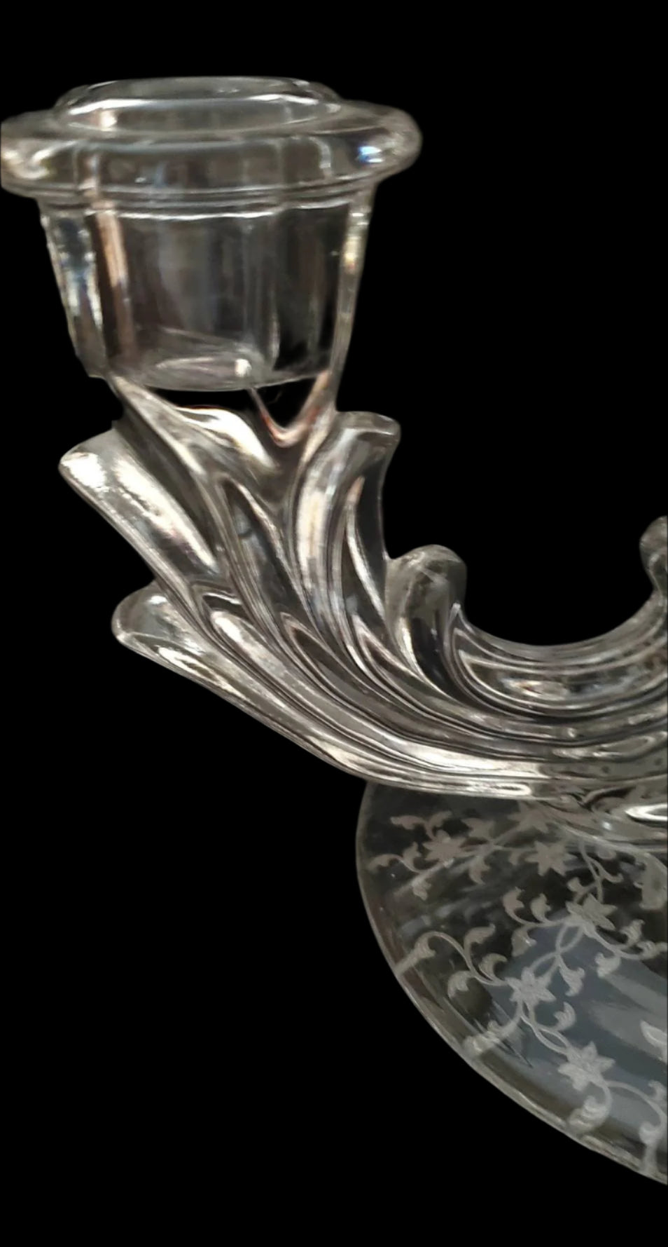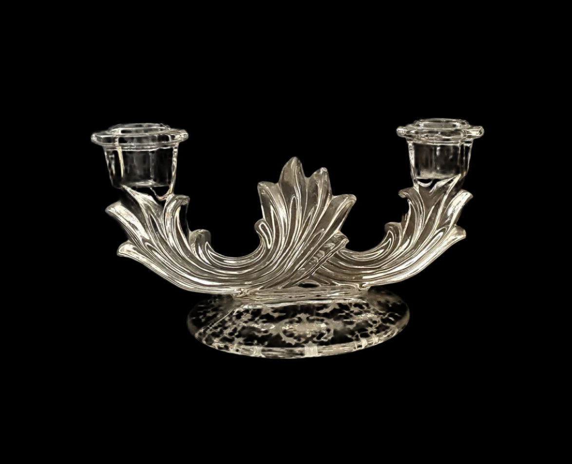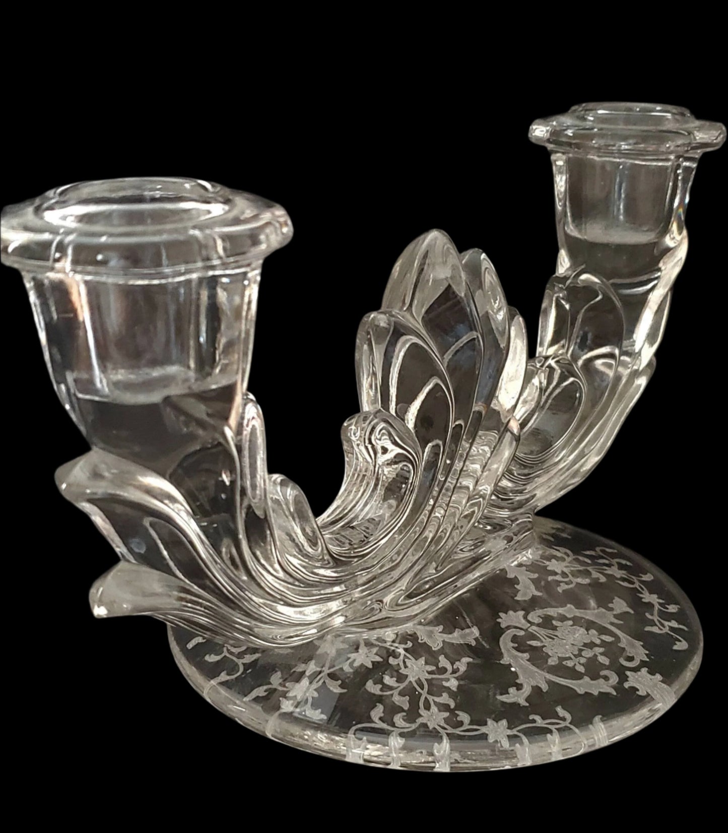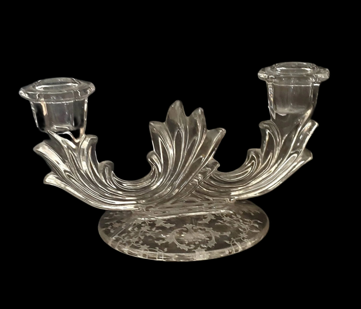 This double-light taper holder from Fostoria is in the Baroque style, with two arms surrounding a decorative center. The base is beautifully etched with flowers, vines, and embellishments.