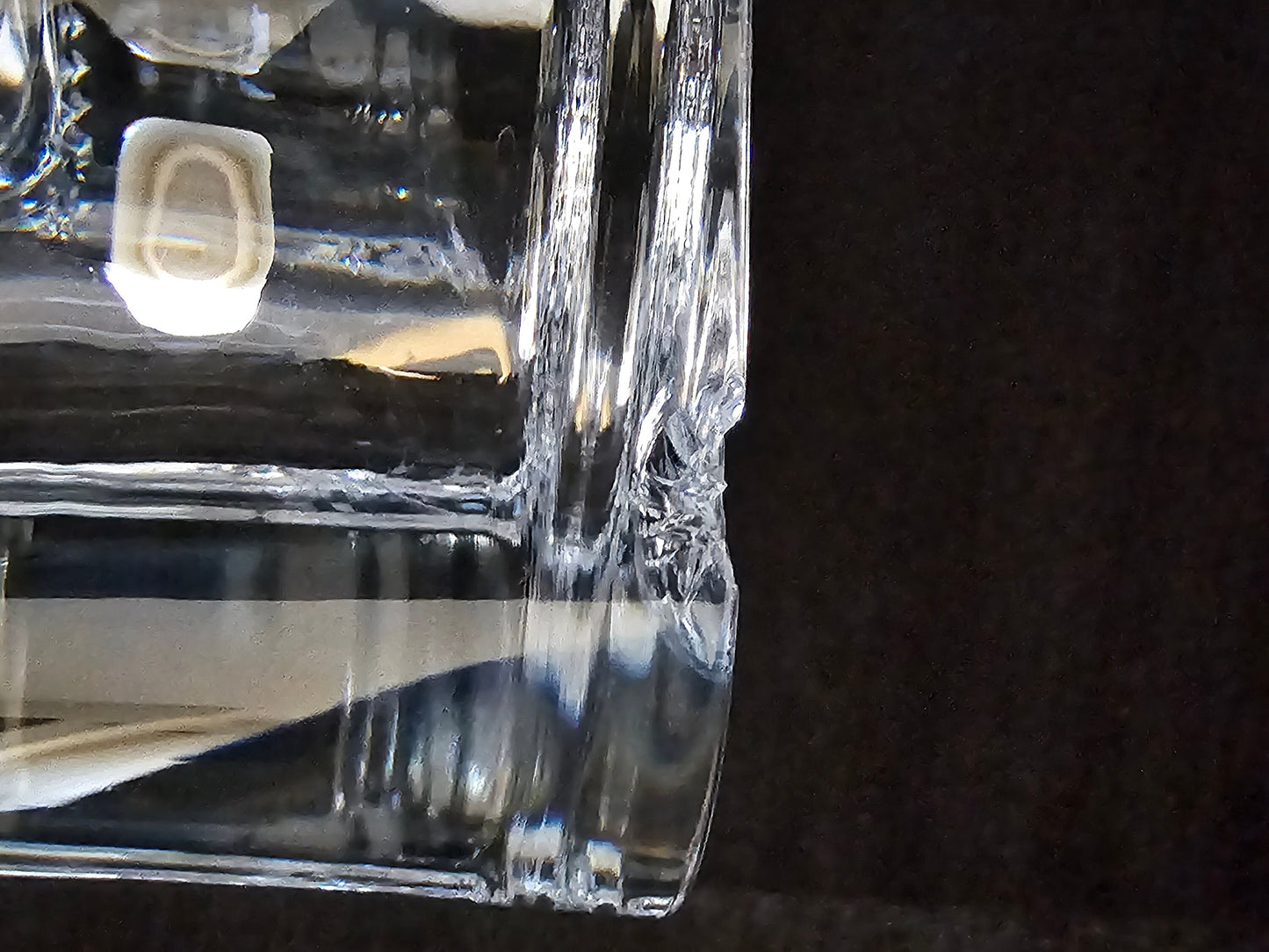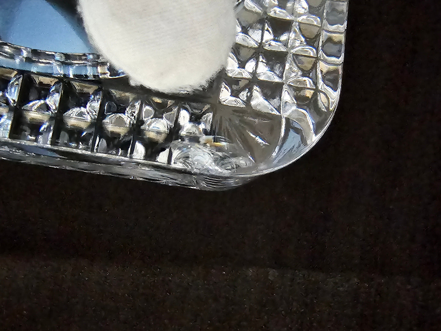 The body of this candle holder is crystal clear, but the bottom is cut with a diamond patter and flares at the corners. The result is that the pattern is magnified and shows through at different angles.