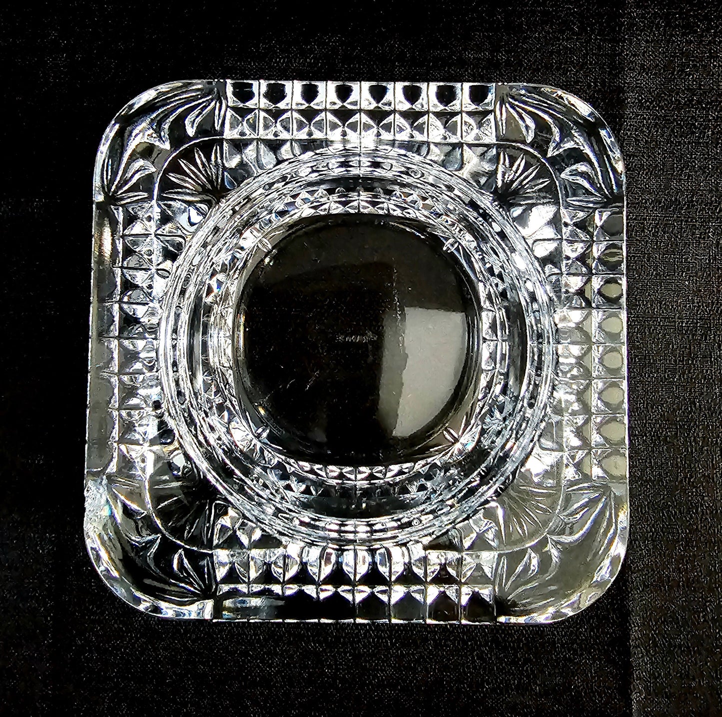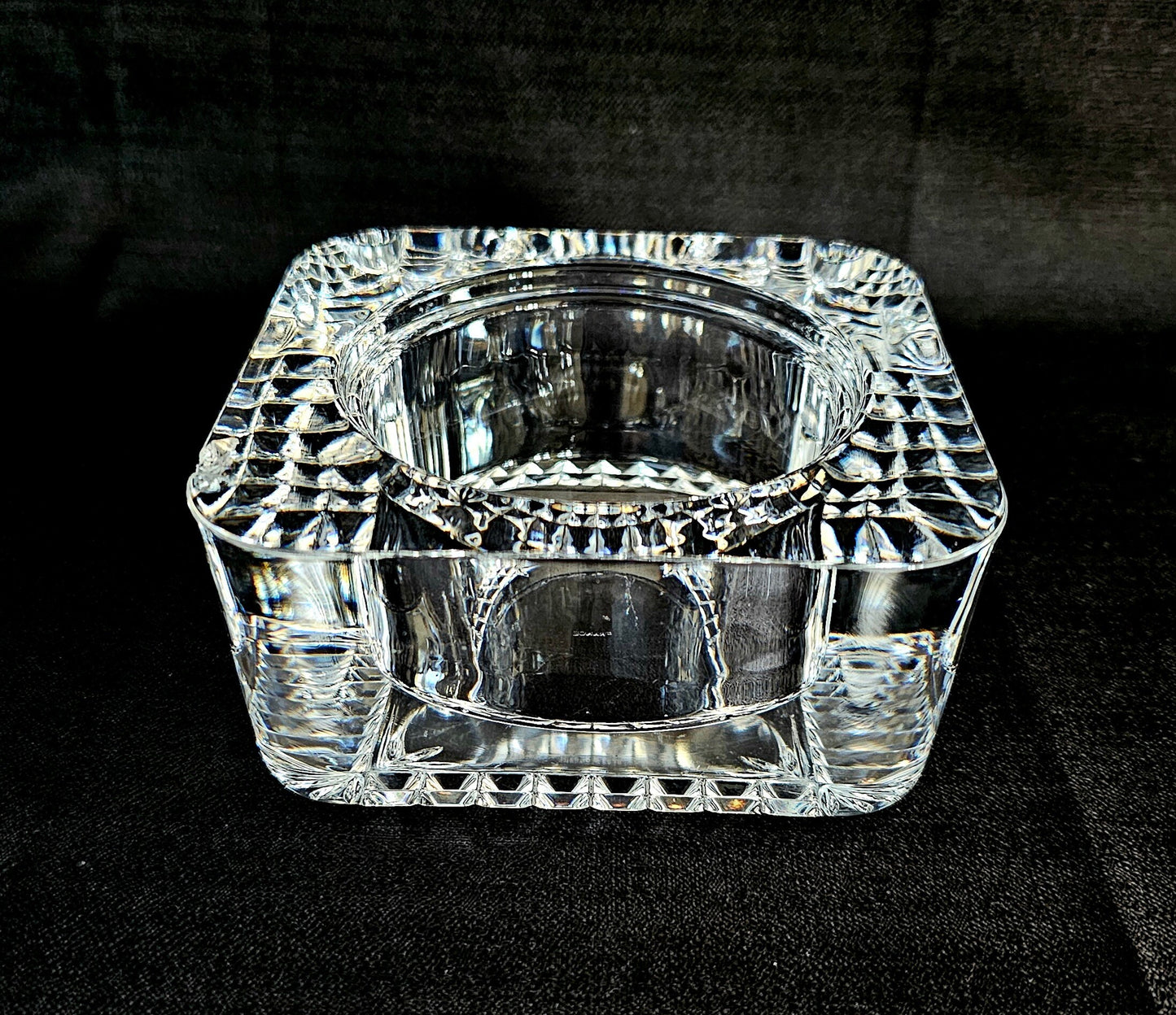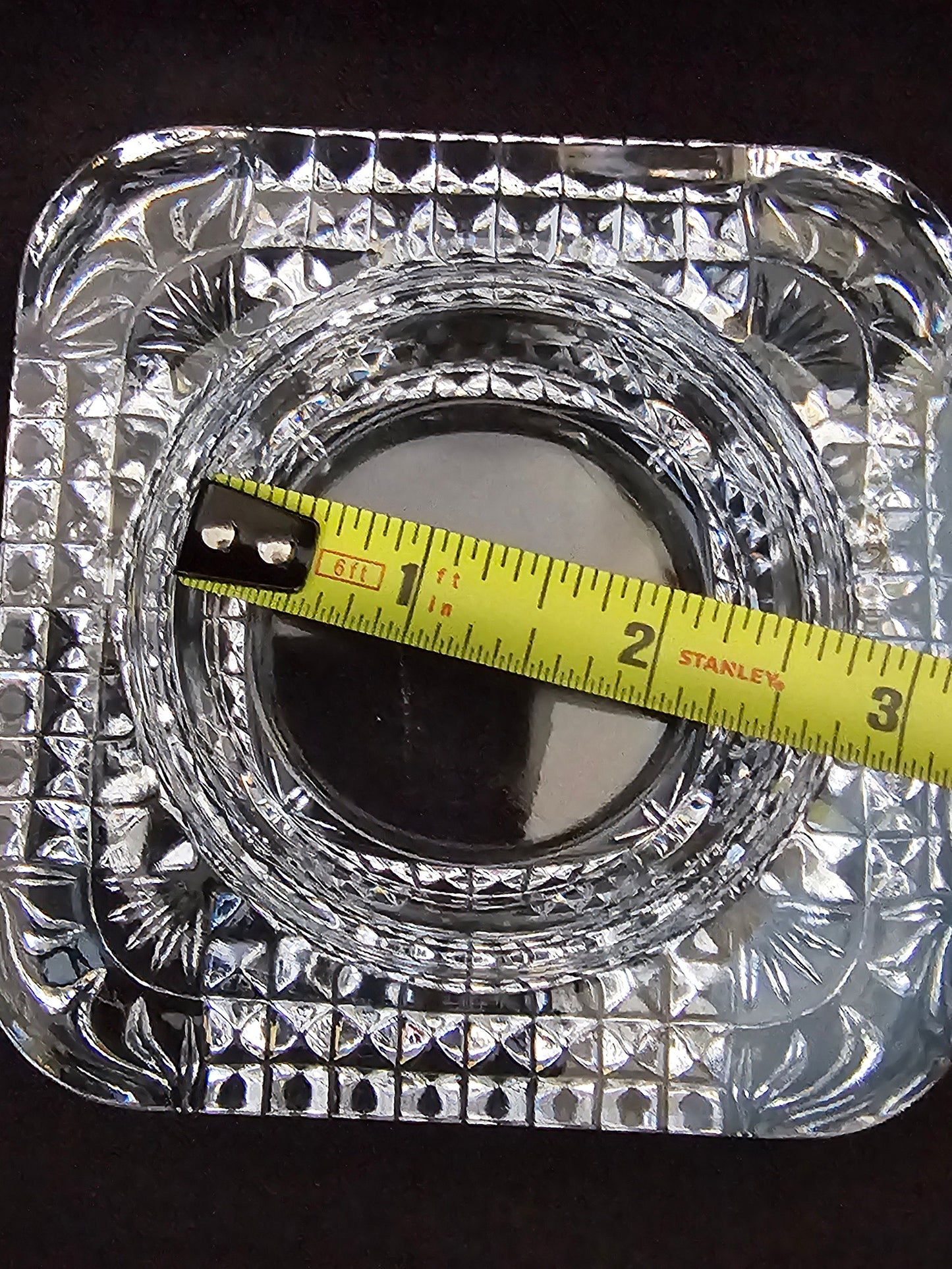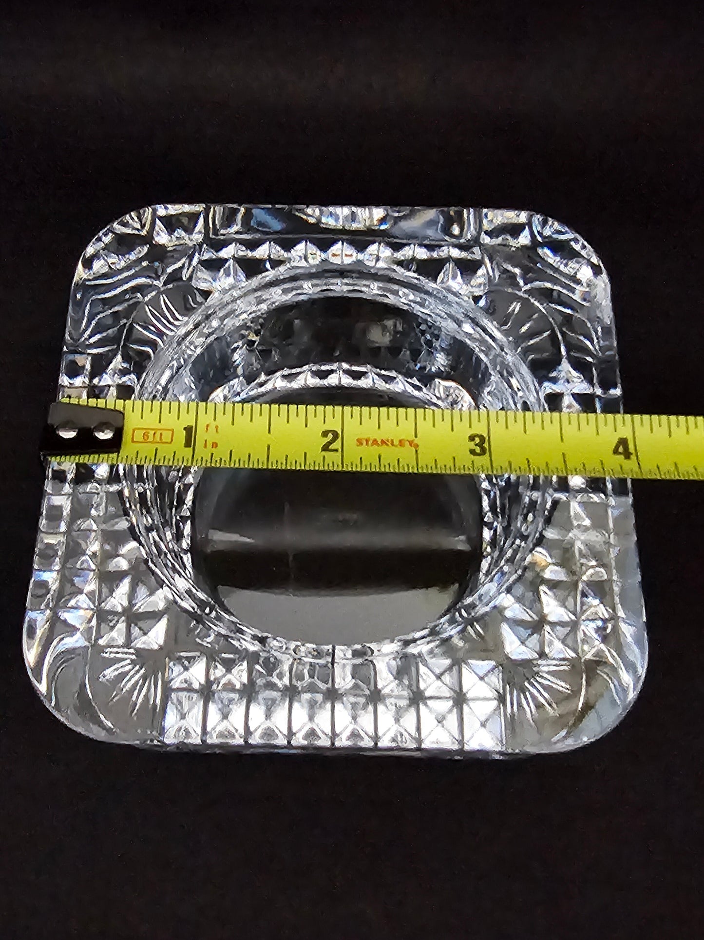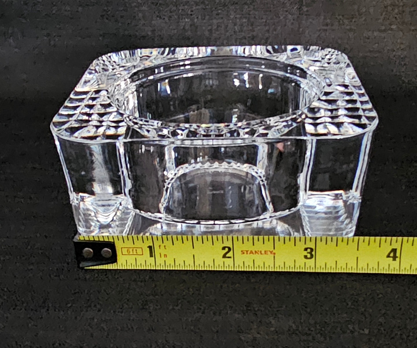 Four inches square, with rounded corners, and 1 3/4" high, this is a serious candle holder from Crystal D'Arques. The center cutout will hold a candle up to 2 1/2" in diameter.