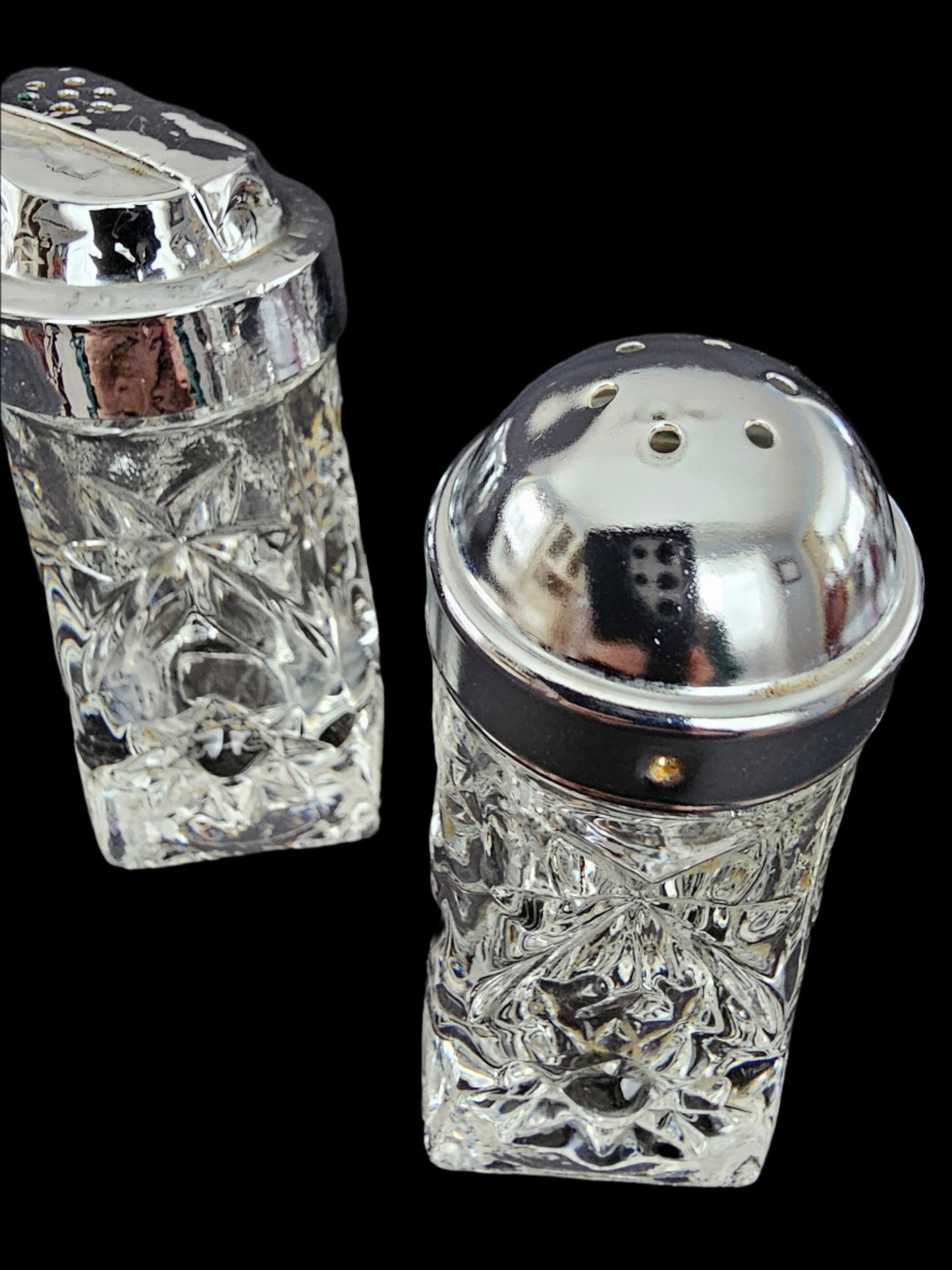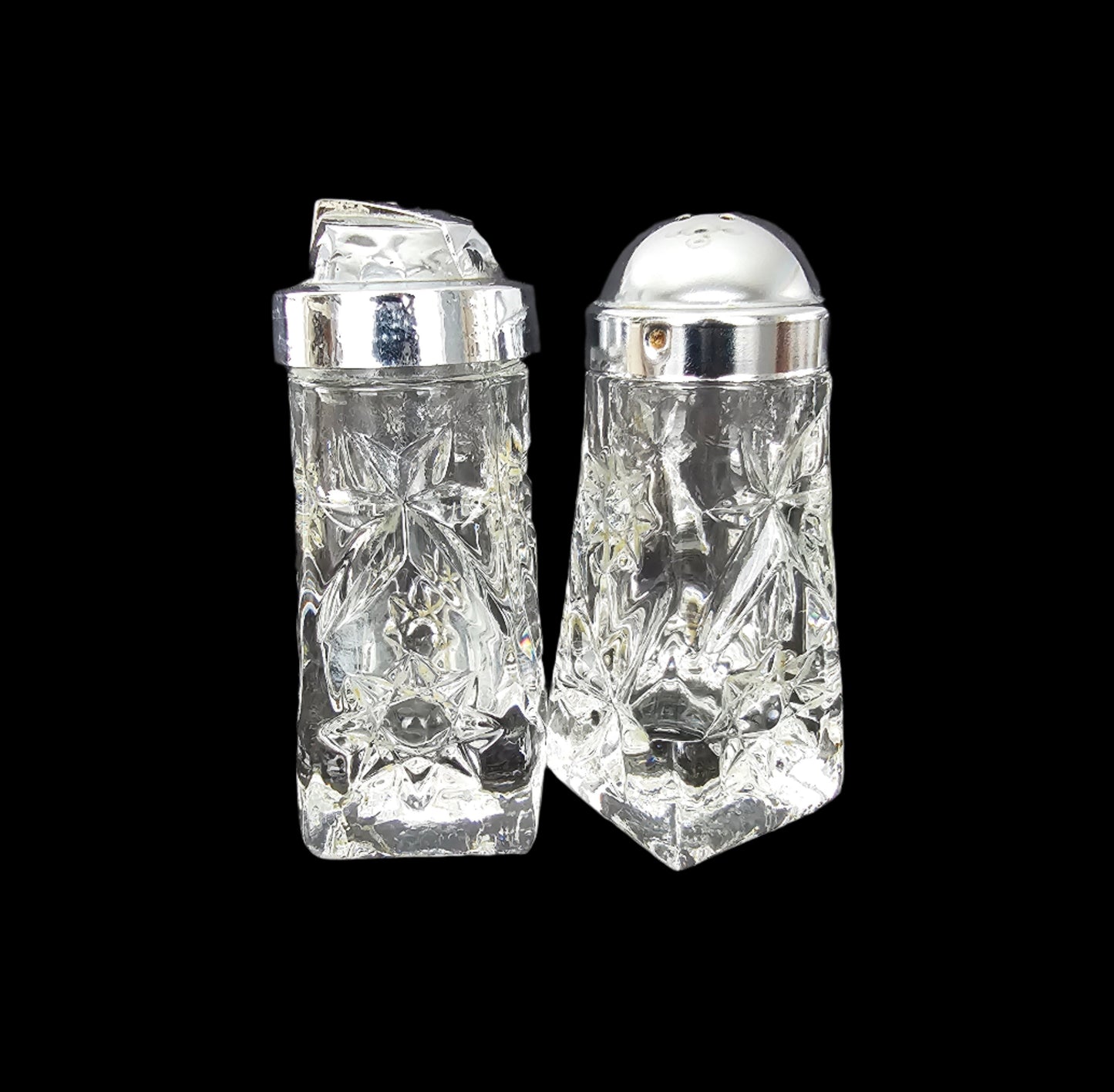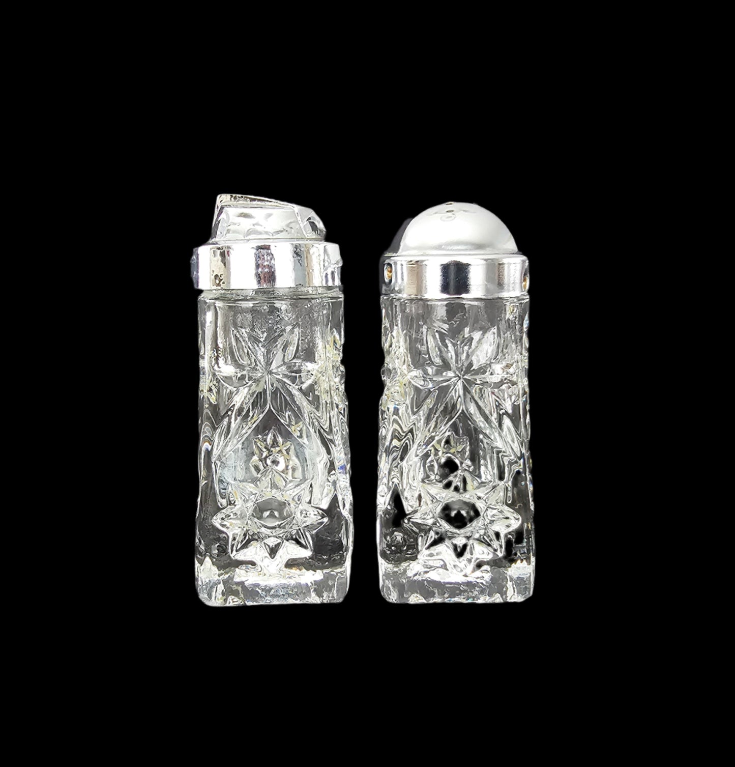 Pressed Glass salt and pepper shaker set with starburst and star pattern and dome lids. One of these has a replacement lid that may be plastic; this is reflected in the price. These were made in the United States. The pattern is discontinued.