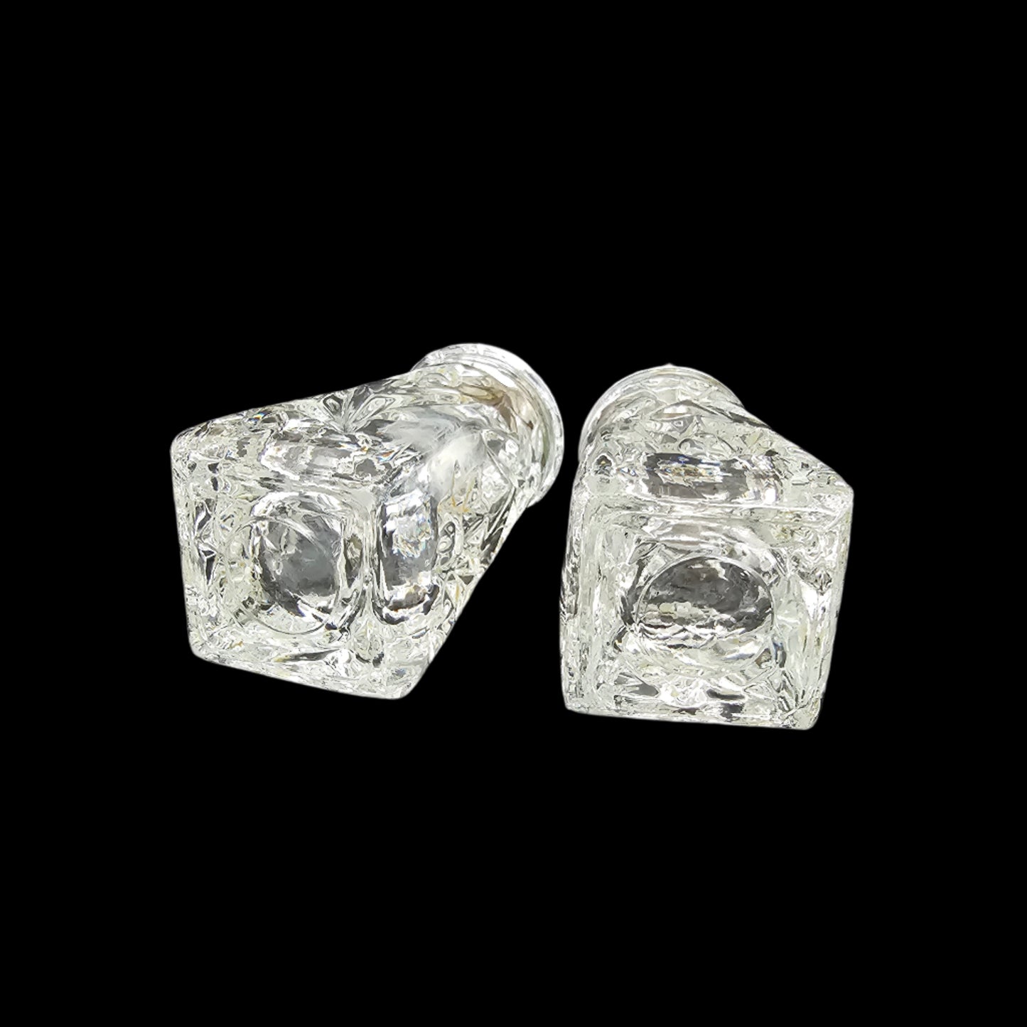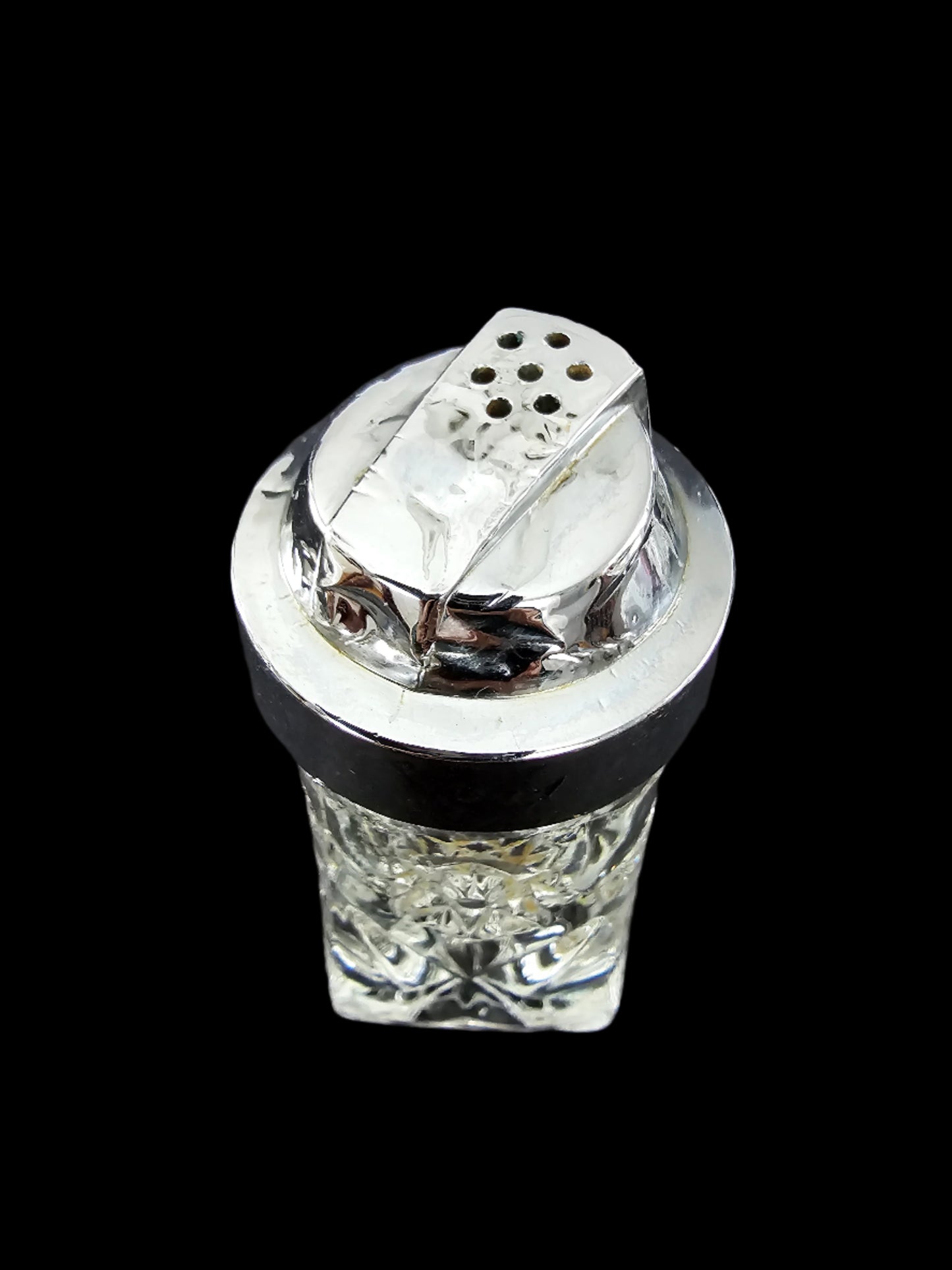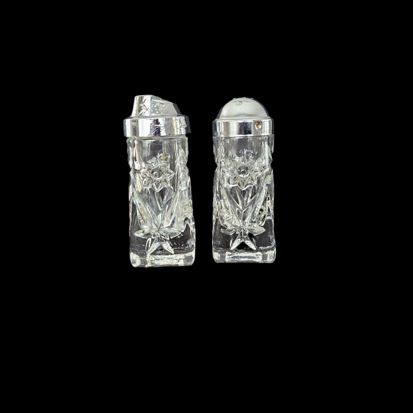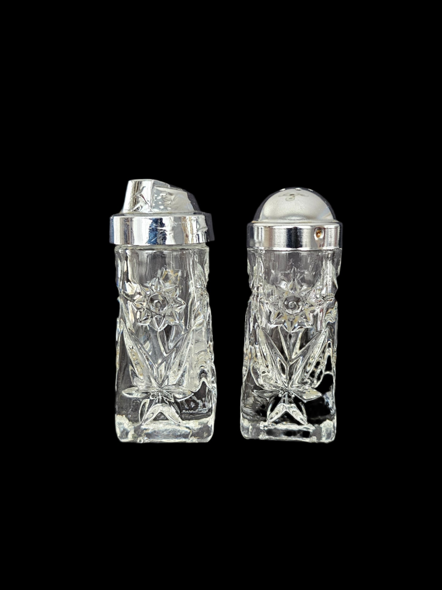 Pressed Glass salt and pepper shaker set with starburst and star pattern and dome lids. One of these has a replacement lid that may be plastic; this is reflected in the price. These were made in the United States. The pattern is discontinued.