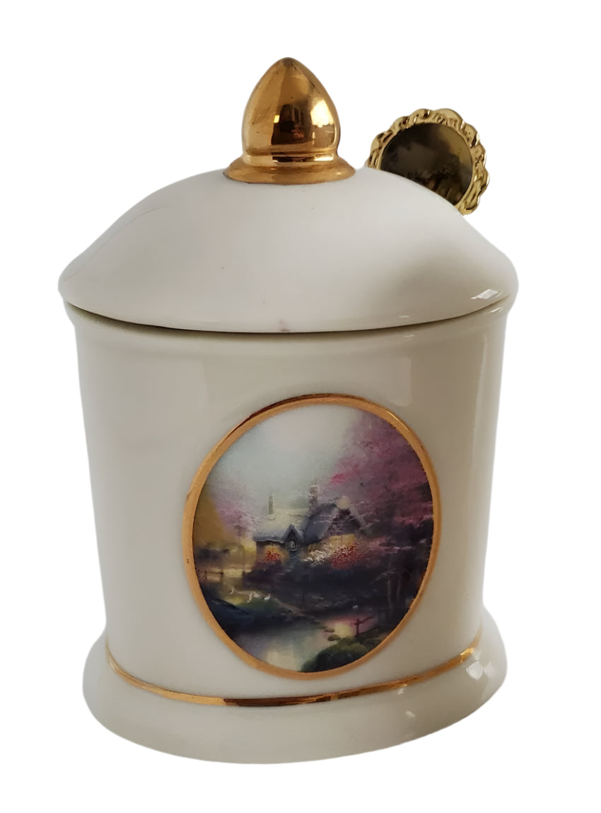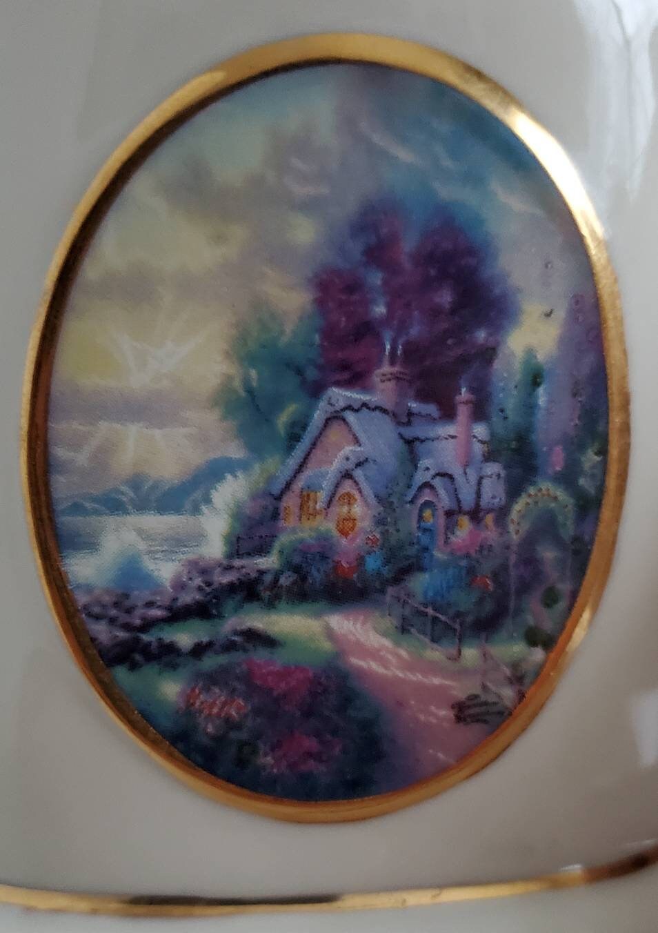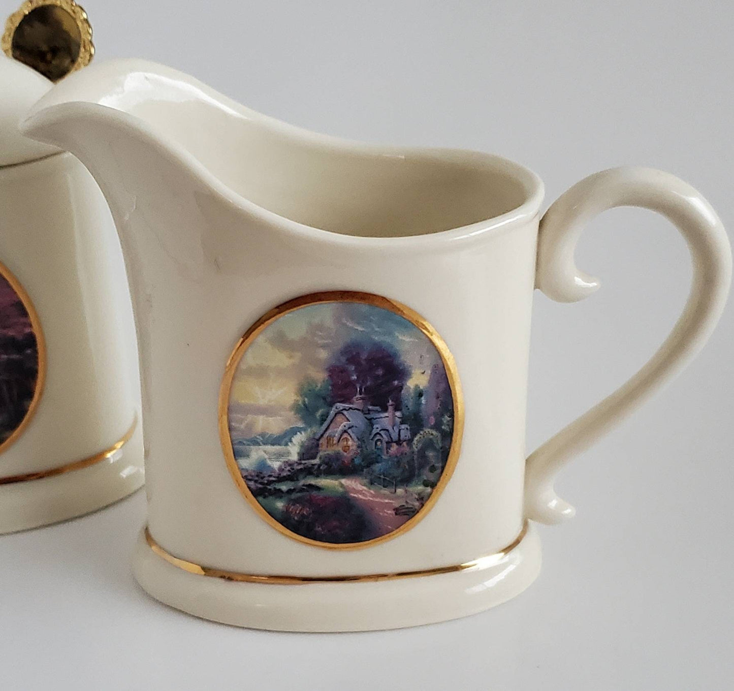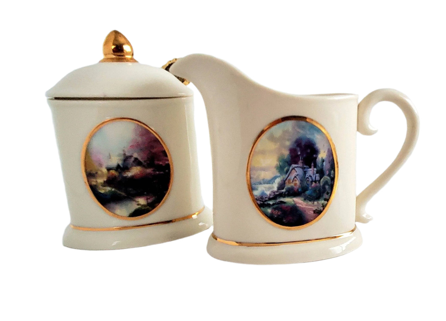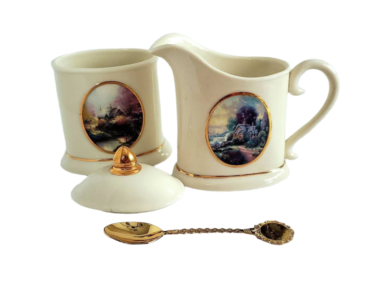 Thomas Kinkade Sugar and Creamer Set with Spoon, by Avon China, "Stepping Stone Cottage," "New Day Dawning"