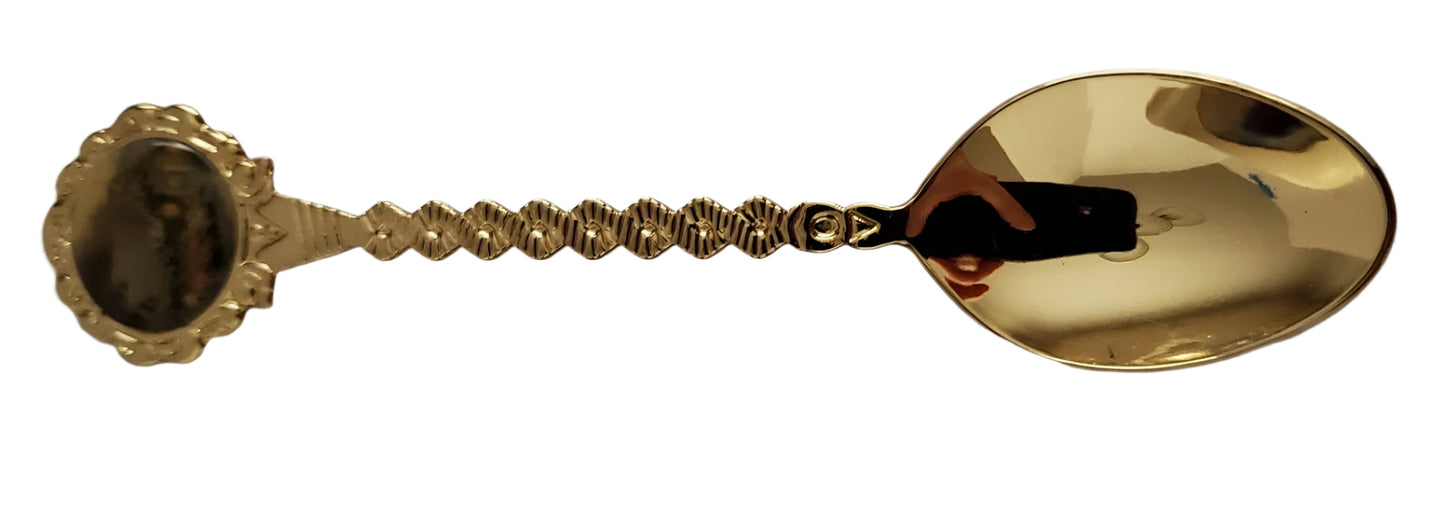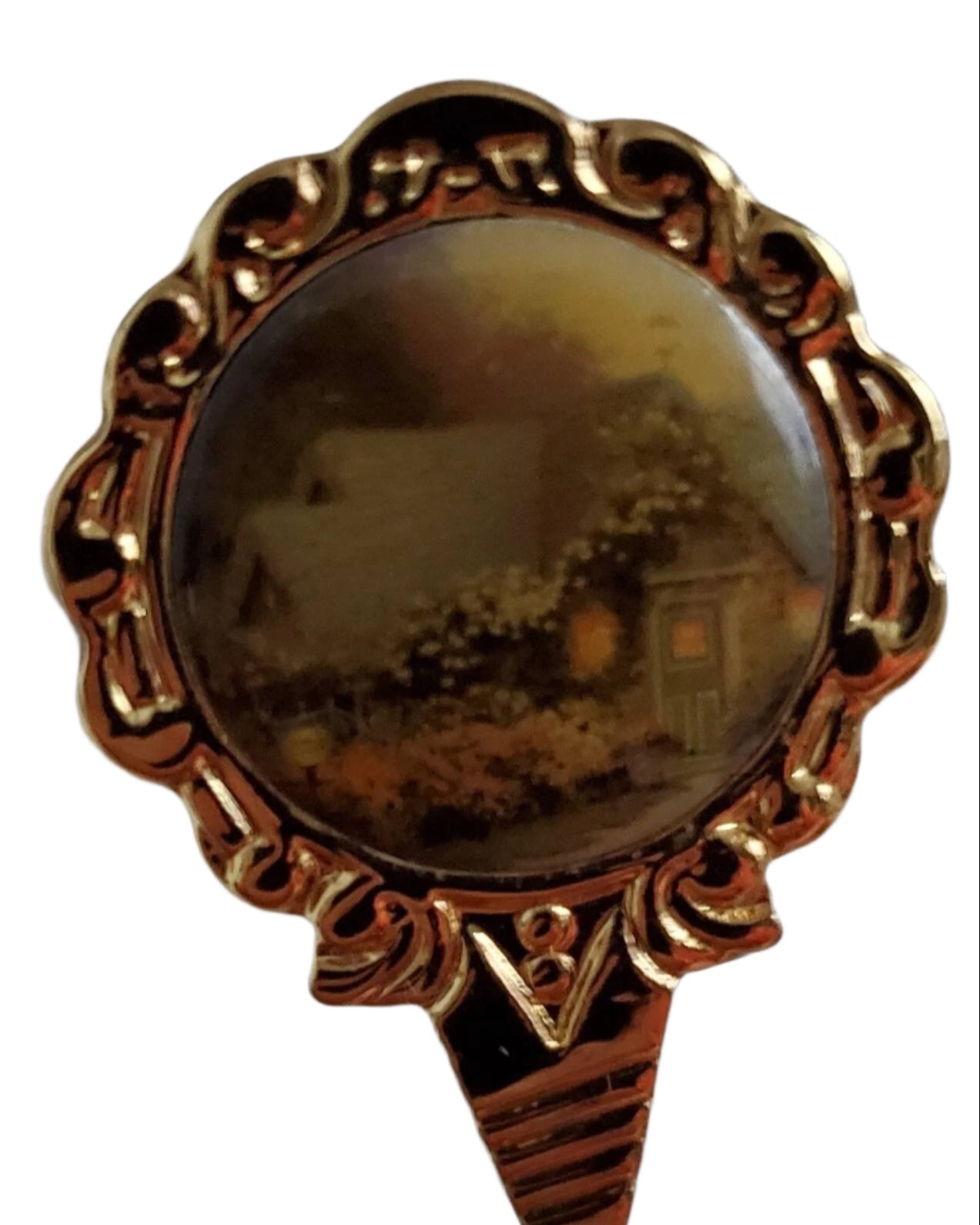 These pieces are white with gold trim. Each piece has a panel depicting a lovely cottage scene, including the gold-plated spoon. The sugar bowl is labeled "Stepping Stone Cottage," and the creamer is labeled "New Day Dawning." The spoon doesn't appear to have a label. The sugar bowl lid is also gilded on top.
