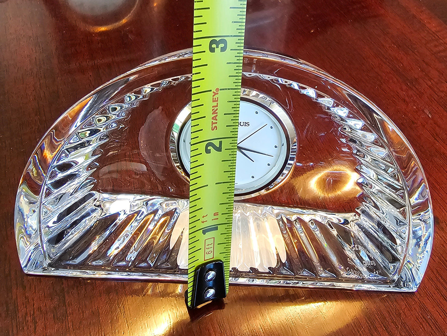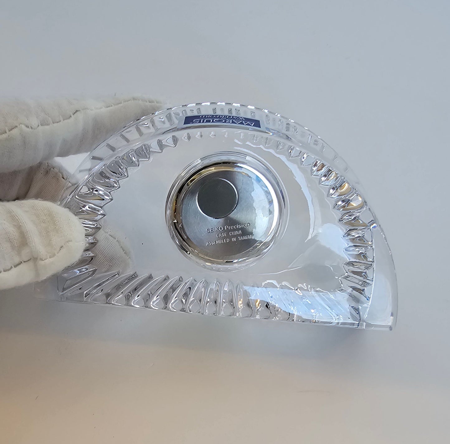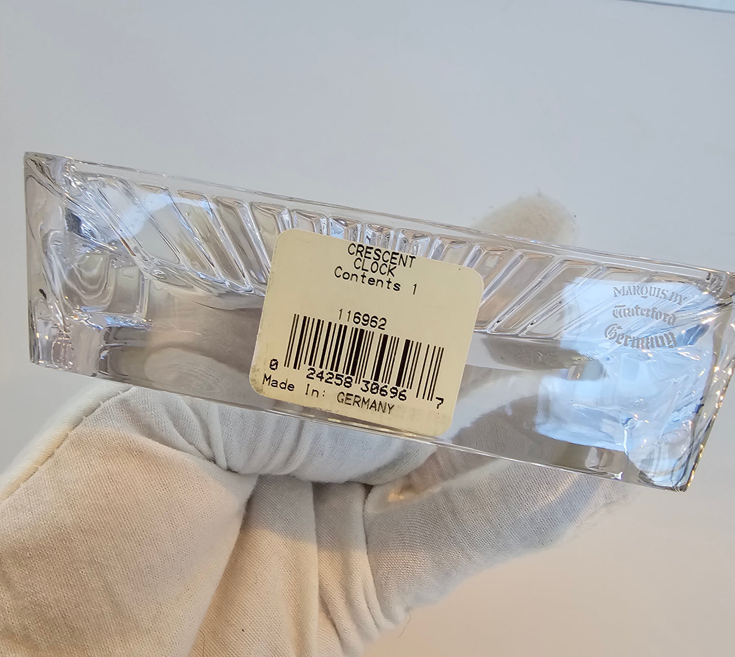 This half-moon-shaped analog crystal clock by Waterford has an Art Deco or Mid-Century look to it. The clock has a white background with a silver bezel. The clock portion fits snugly, but pulls out for battery replacement and to set the time. It uses a button battery, not included due to postal restrictions.