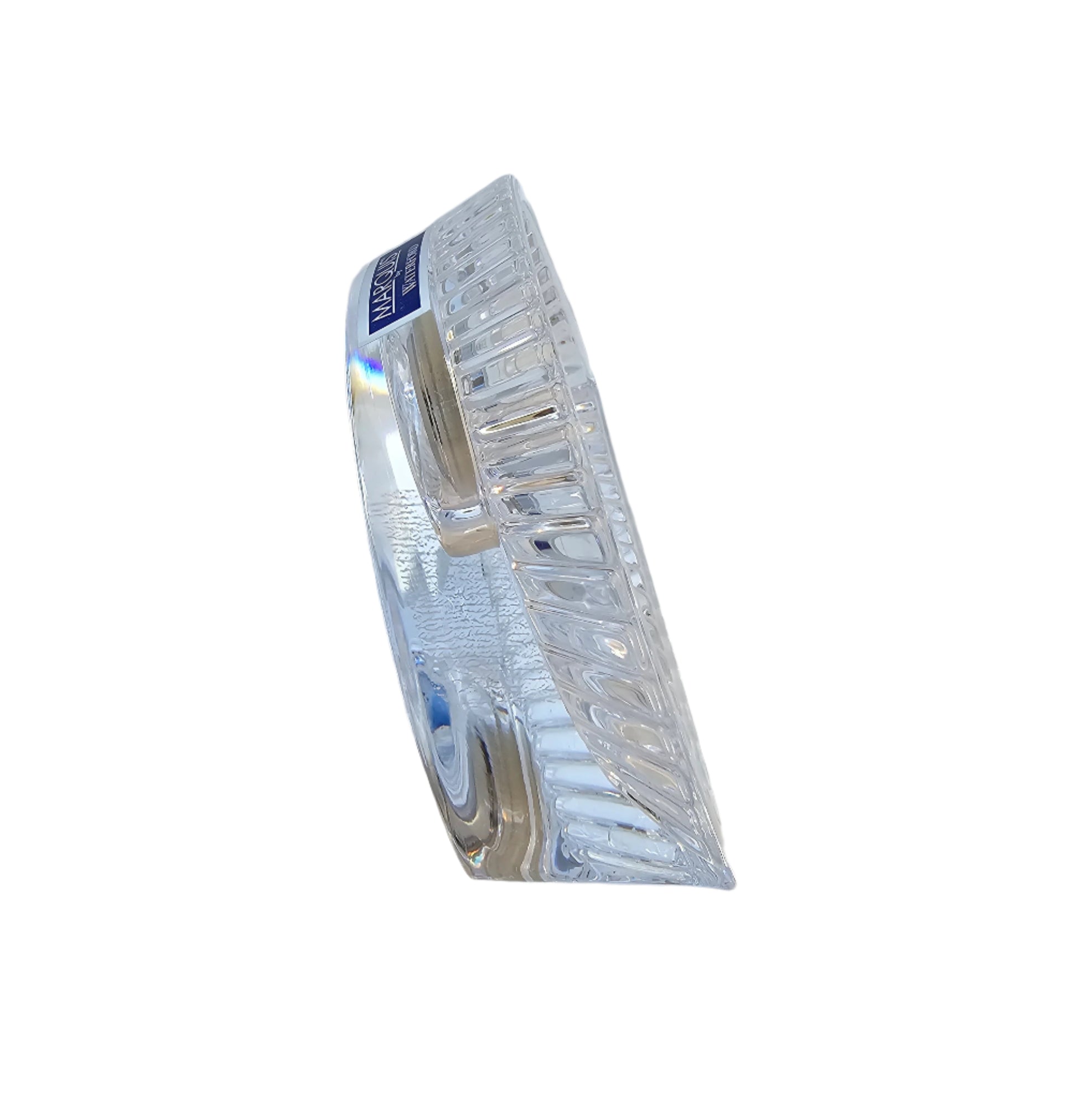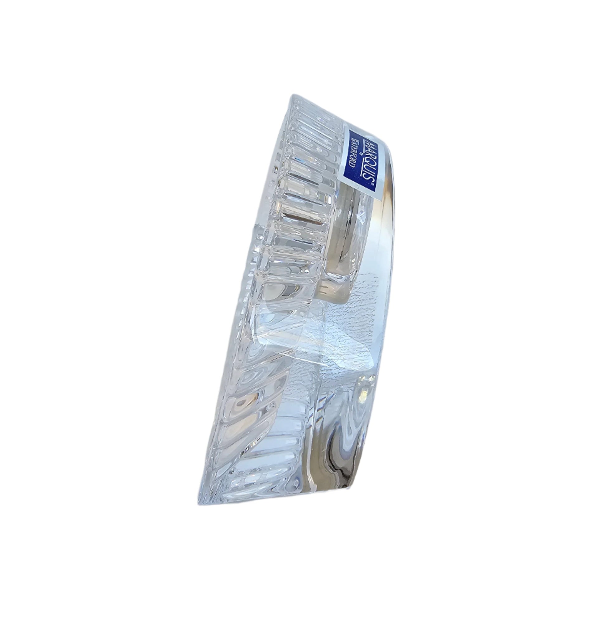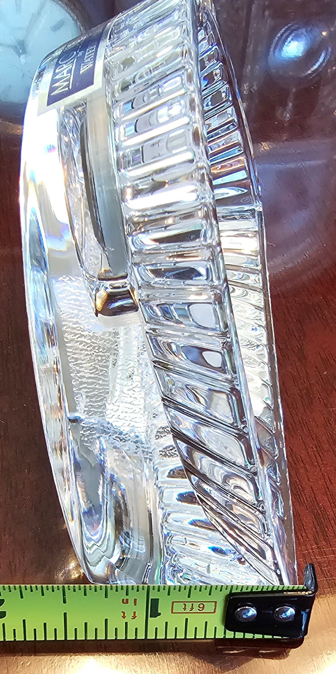This half-moon-shaped analog crystal clock by Waterford has an Art Deco or Mid-Century look to it. The clock has a white background with a silver bezel. The clock portion fits snugly, but pulls out for battery replacement and to set the time. It uses a button battery, not included due to postal restrictions.