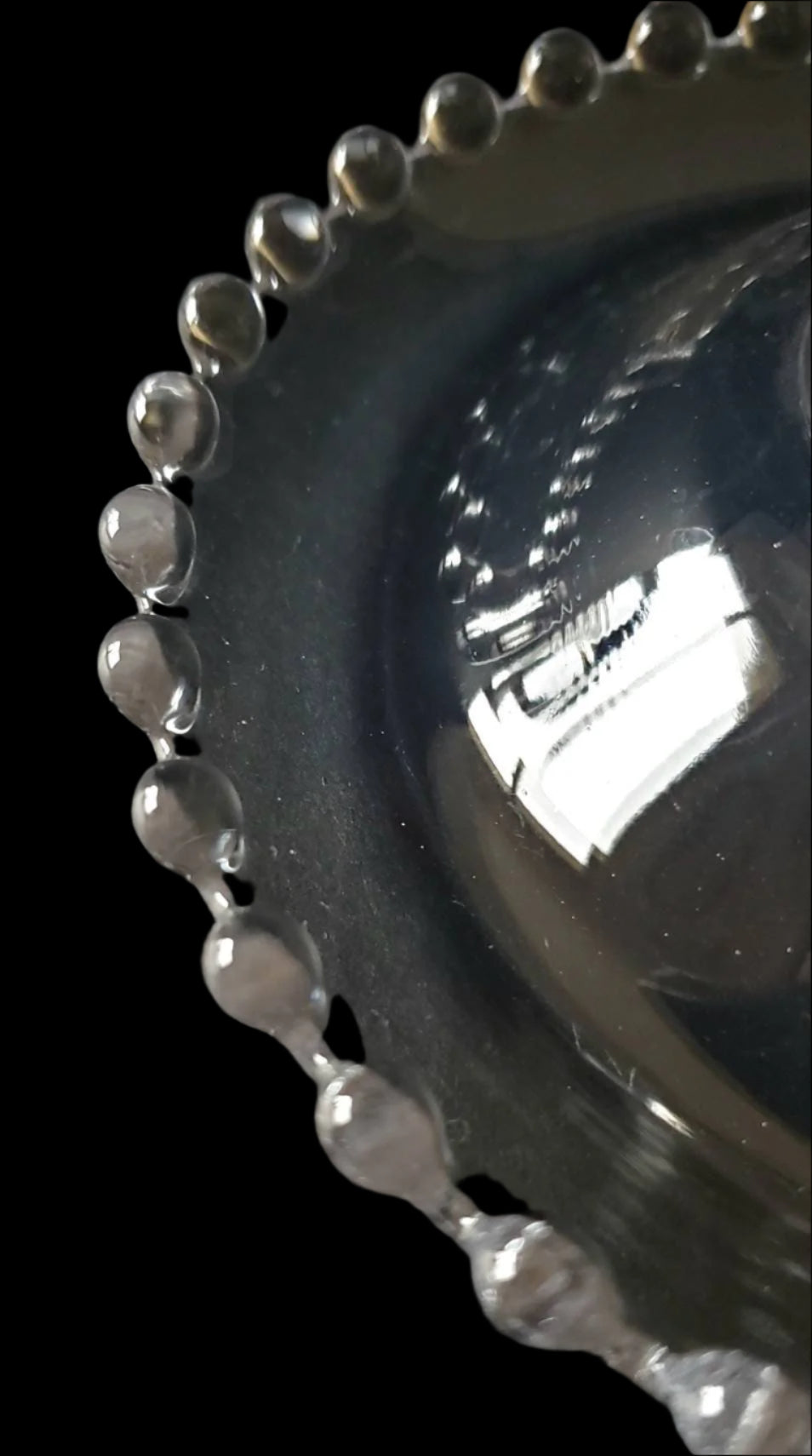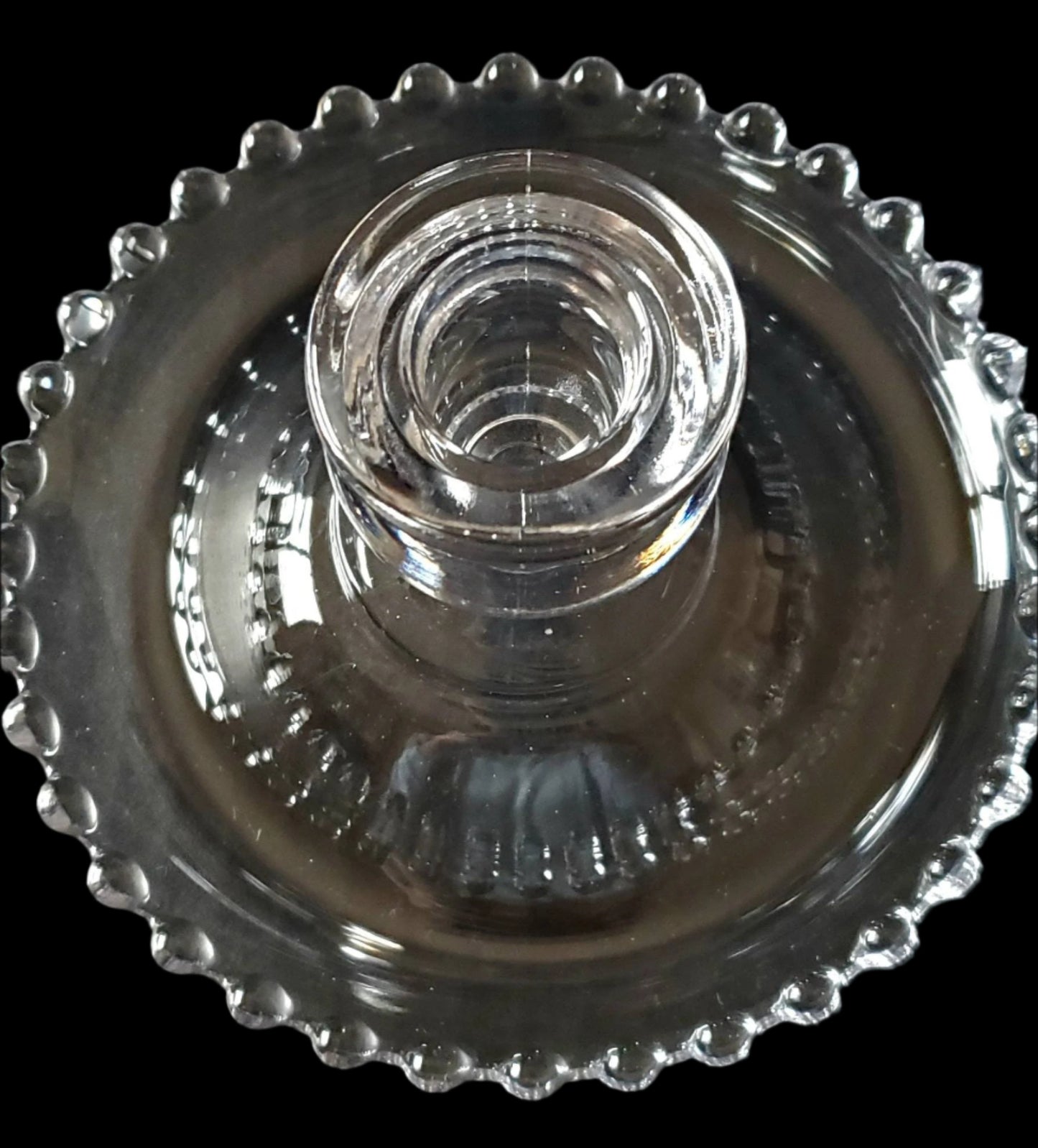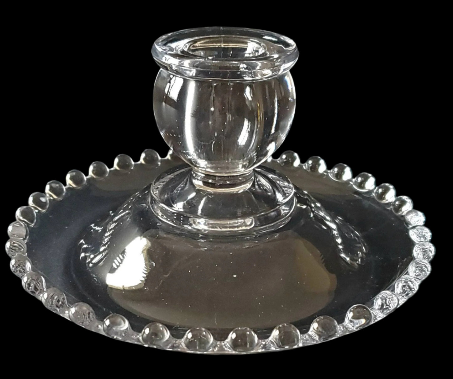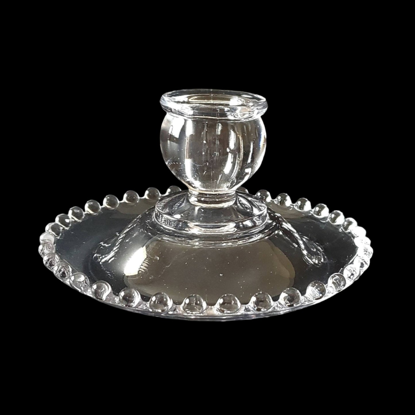 This candlestick (taper) holder is part of the stunning Imperial Glass "Candlewick" pattern, characterized by the little beads of glass around the piece.