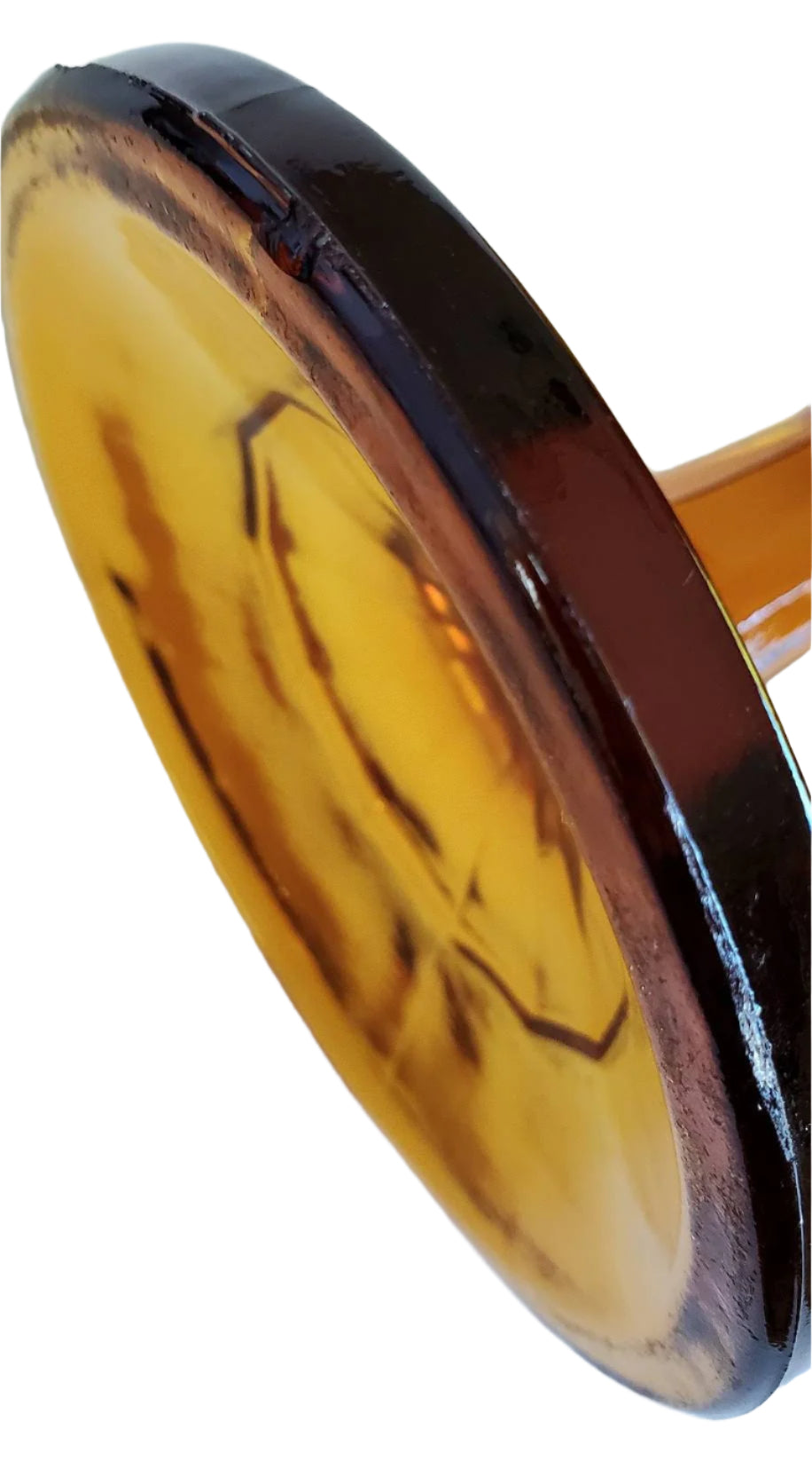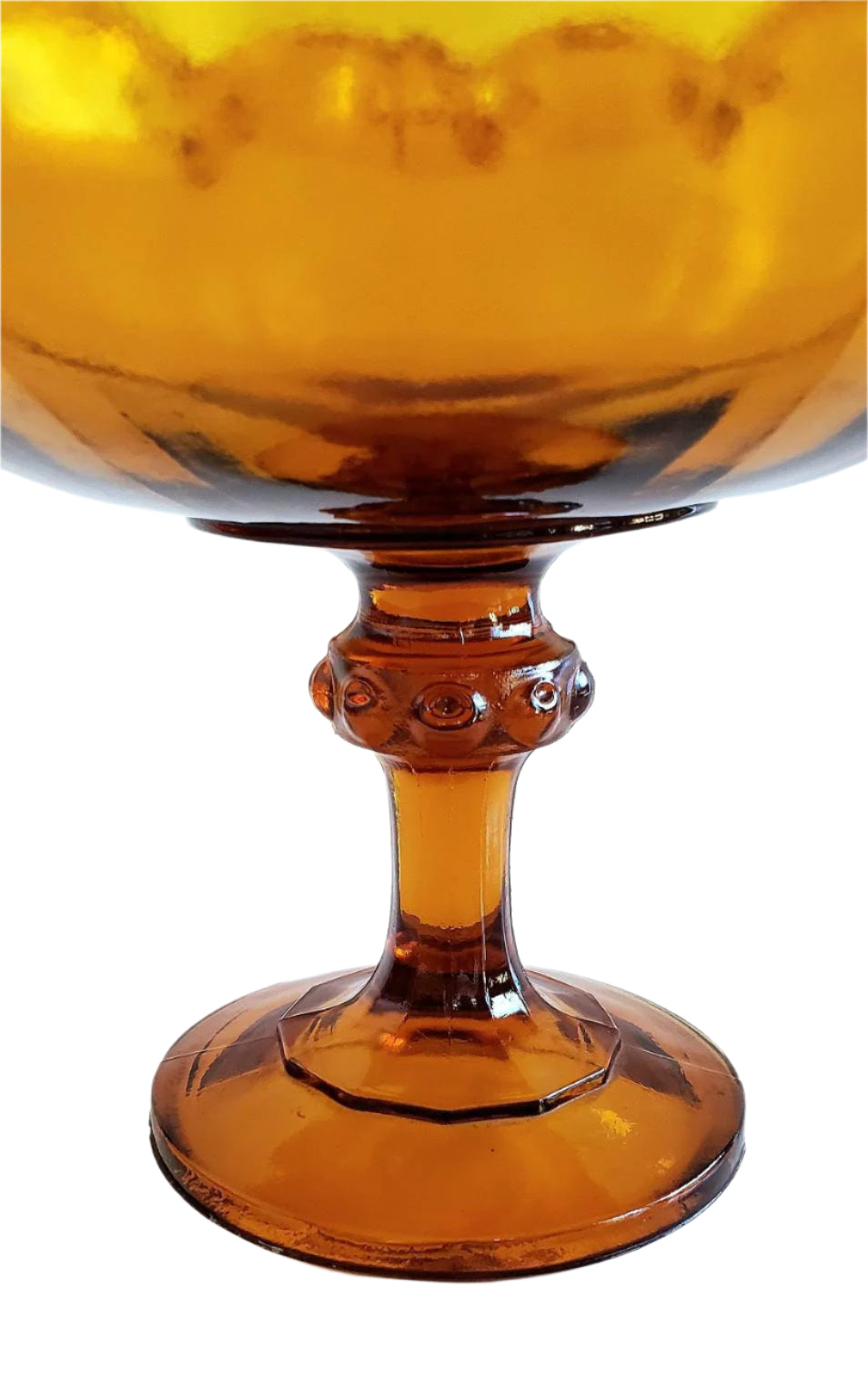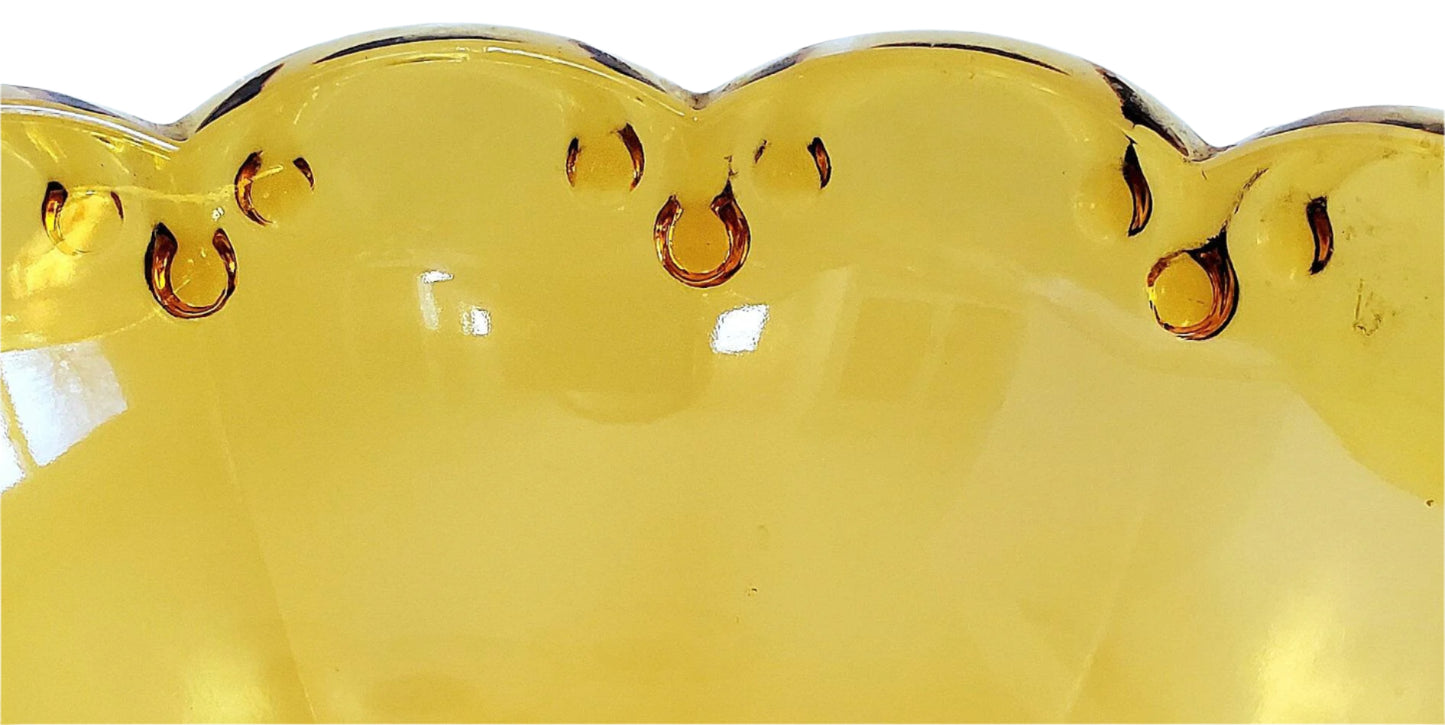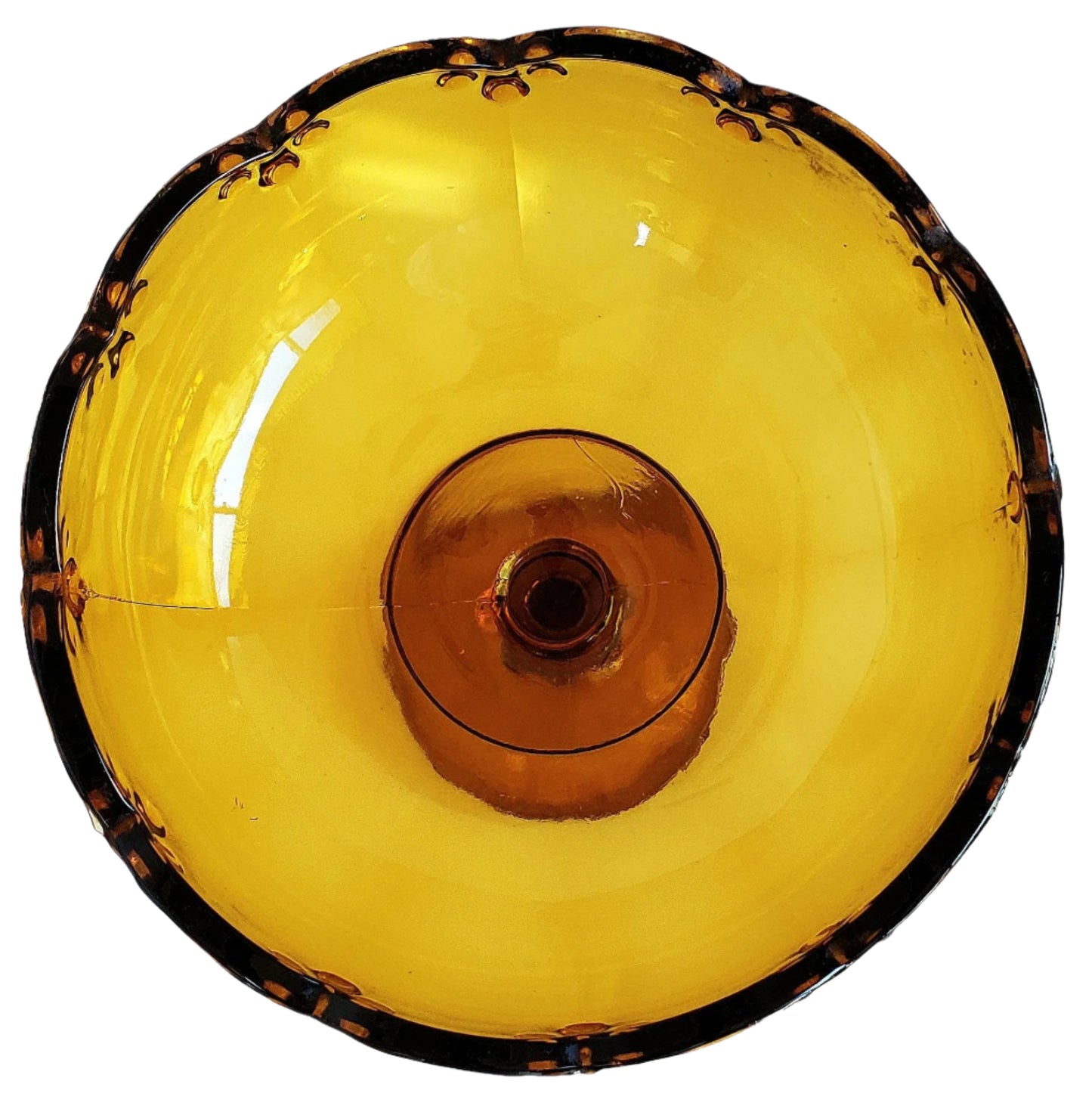 Absolutely *stunning* large footed/pedestal bowl in an amber color. This bowl has a scalloped edge with a teardrop pattern around the edge, on a heavy pedestal - very solid, durable piece.