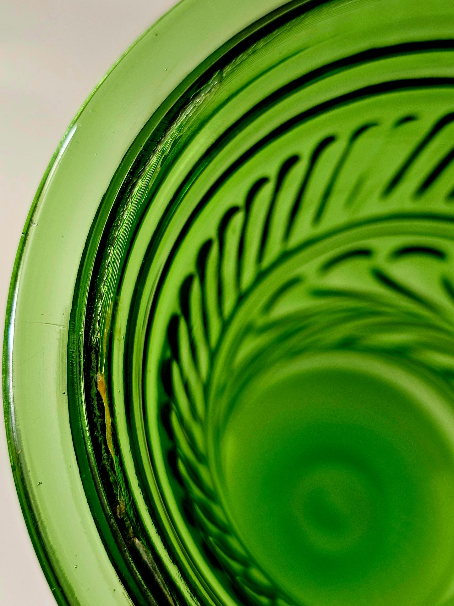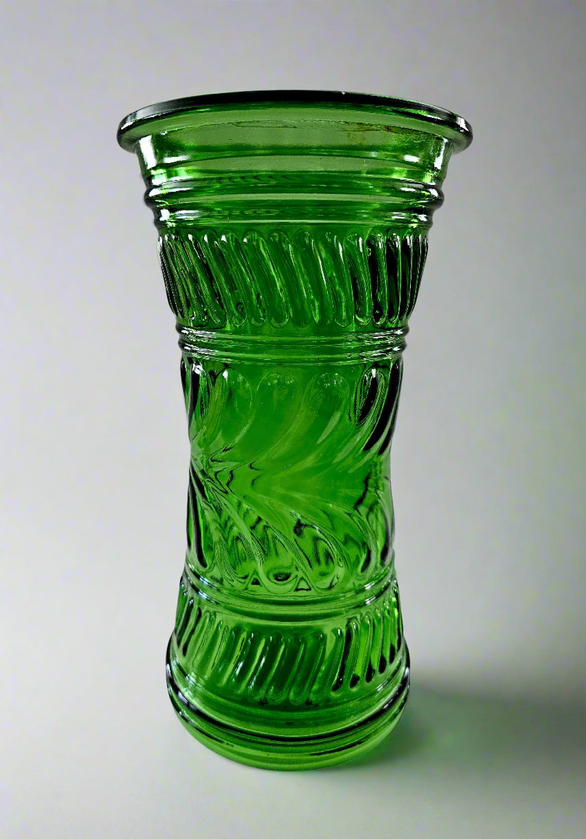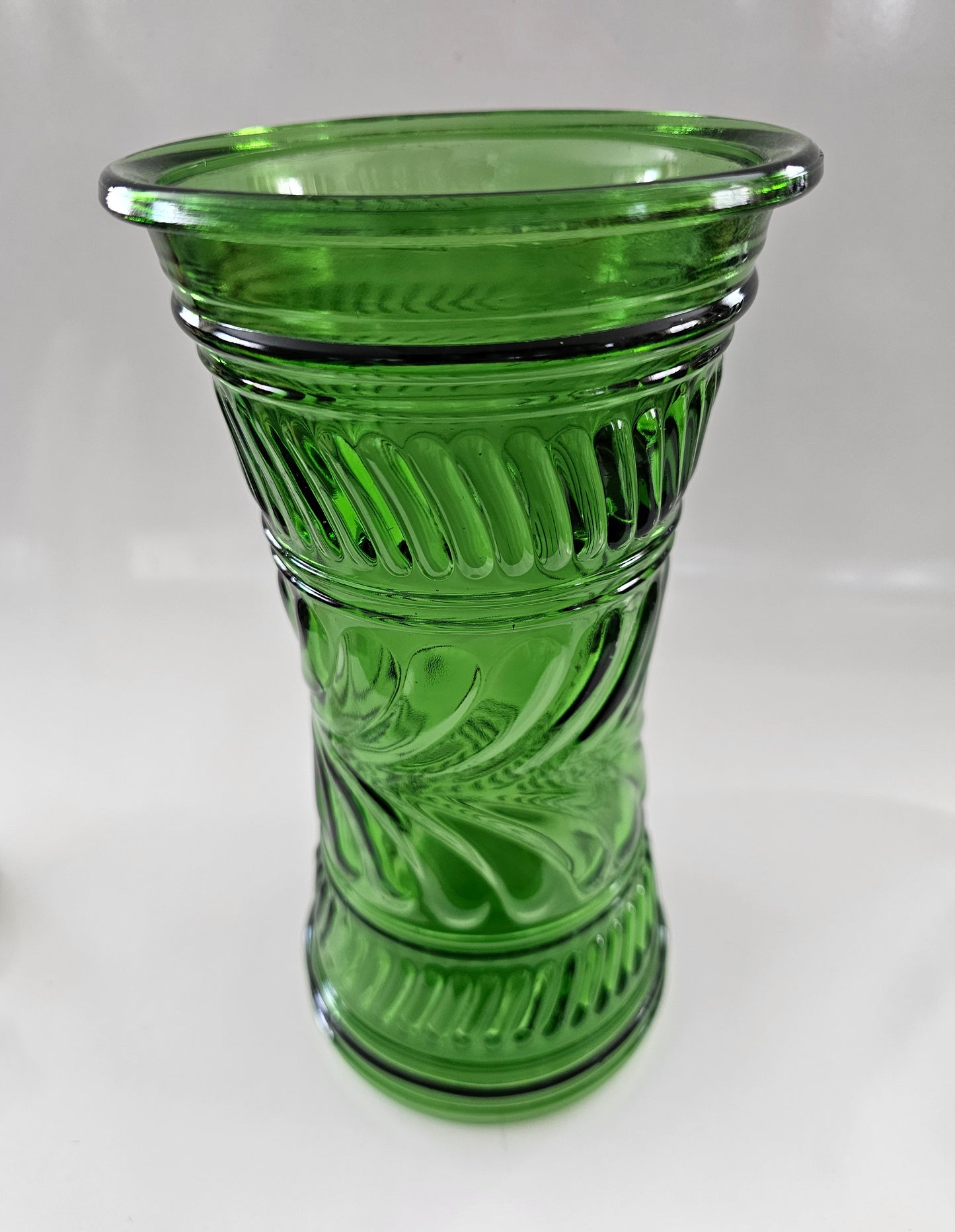 This vase is a splash of brilliant color to provide a base for beautiful blooms. It is pressed glass, and heavy, so it will be stable. The patterning on it flows in different directions to create a pleasing effect. It does have some wear around the top edge on the inside.