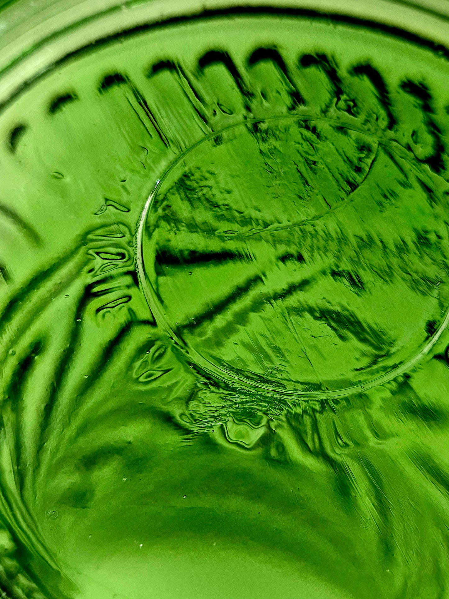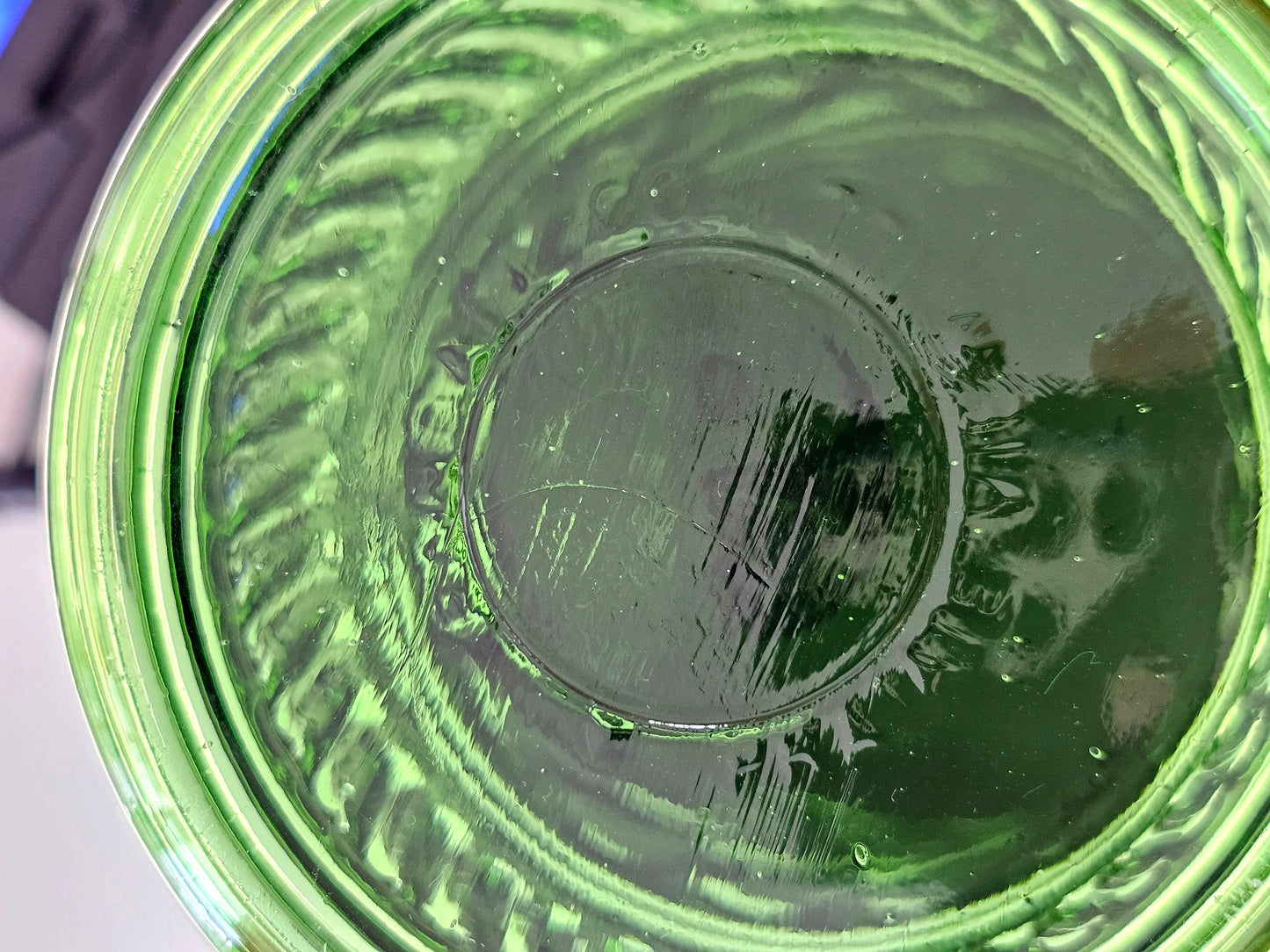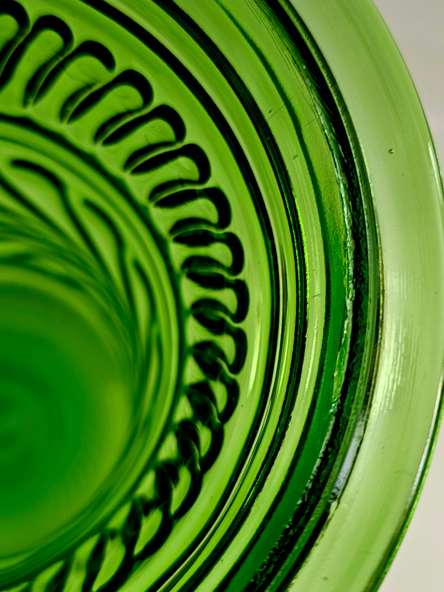 This vase is a splash of brilliant color to provide a base for beautiful blooms. It is pressed glass, and heavy, so it will be stable. The patterning on it flows in different directions to create a pleasing effect. It does have some wear around the top edge on the inside.