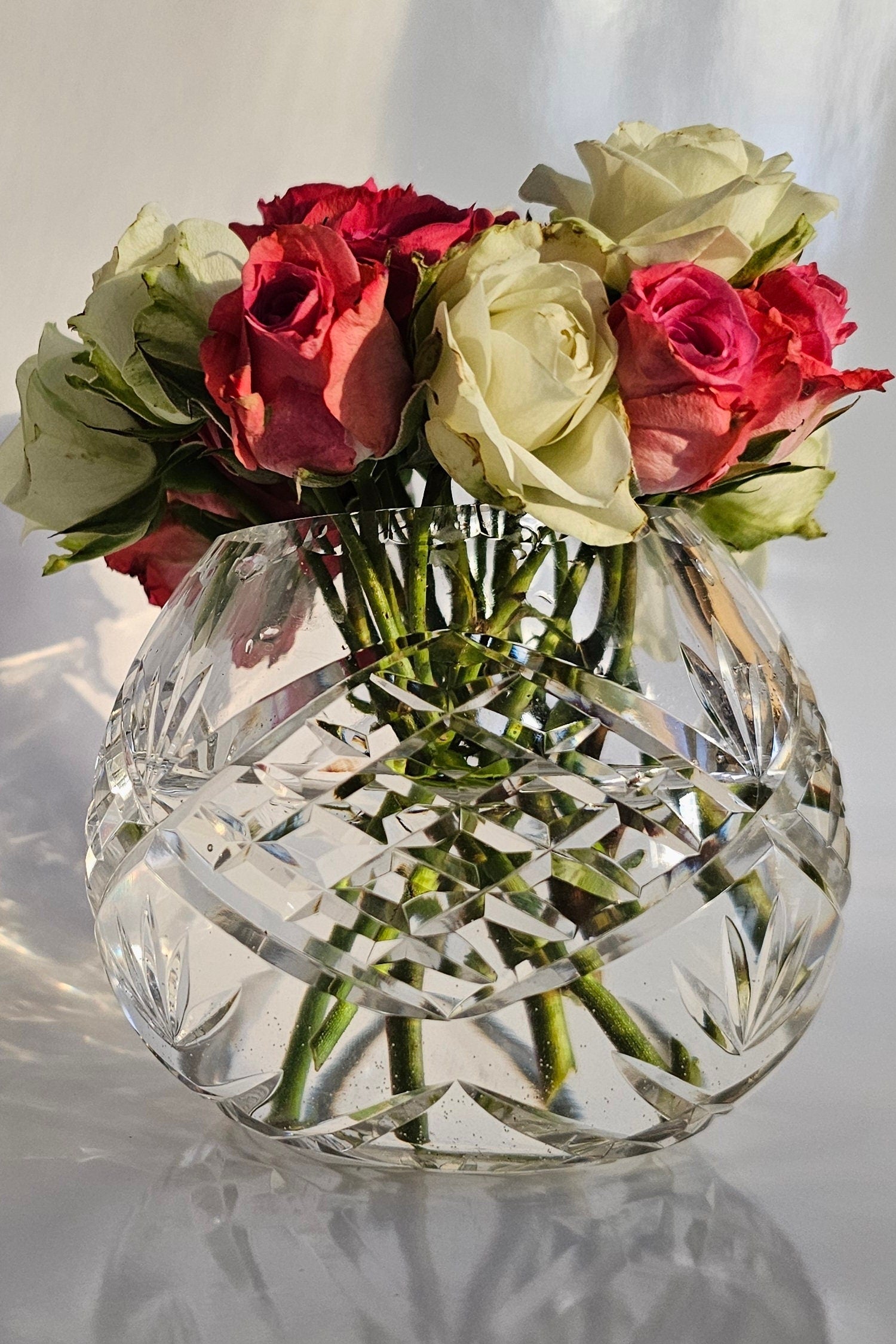 Roses are not included with this purchase, sadly - the photo is simply to show you how absolutely stunning this piece will be on your mantel, side table, dining table, and certainly anywhere the sun can stream in and catch the cut crystal!
