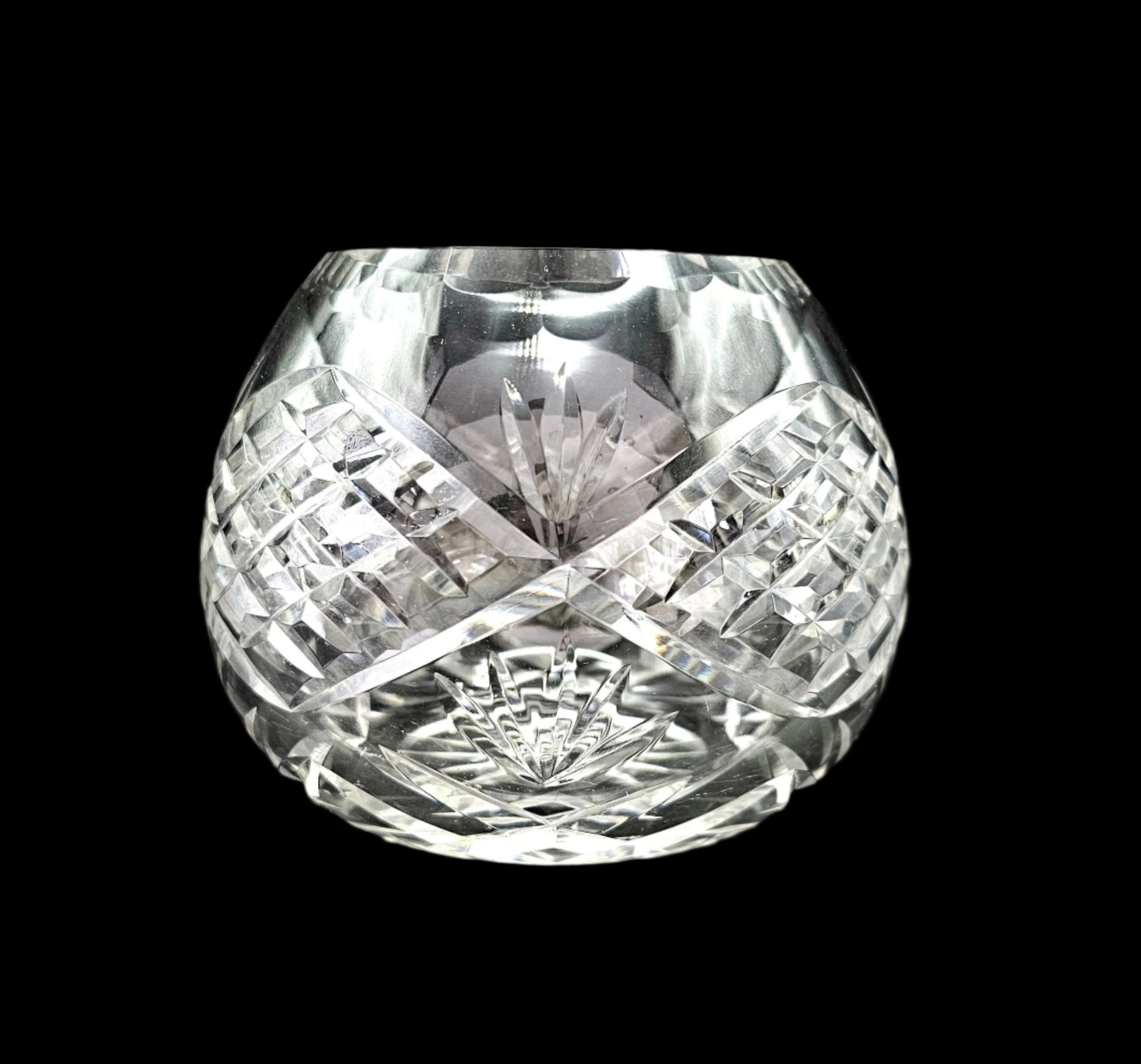 This 24% lead cut crystal rose bowl is vintage crystal from Godinger. It features repeating crosshatch patterns reminiscent of the classic pineapple style, interrupted by a cut fan pattern. Cut scallops grace the edge of the bowl, and the bottom has a starburst pattern. This dish is made to showcase a spray of roses, but would easily accommodate other blooms - your imagination is your limit! It could also grace a mantel, side table, dining table, or bedside table with potpourri, or add a candle to make it a stunning centerpiece!
