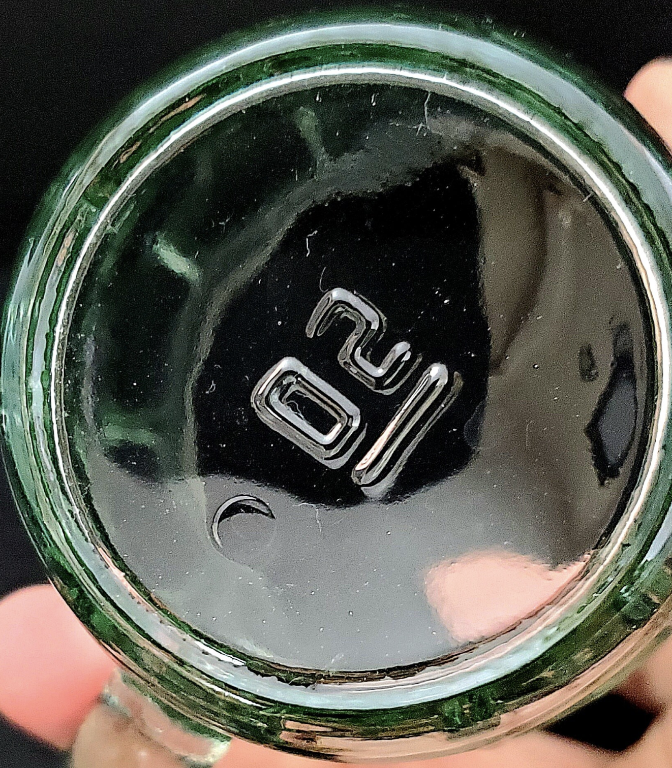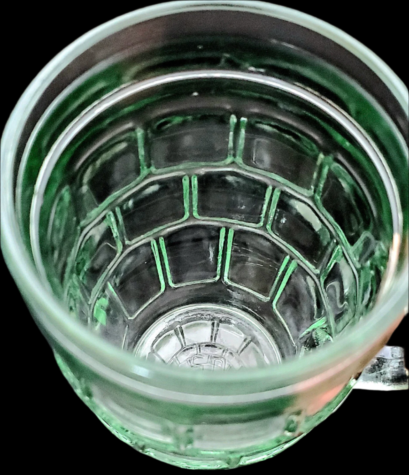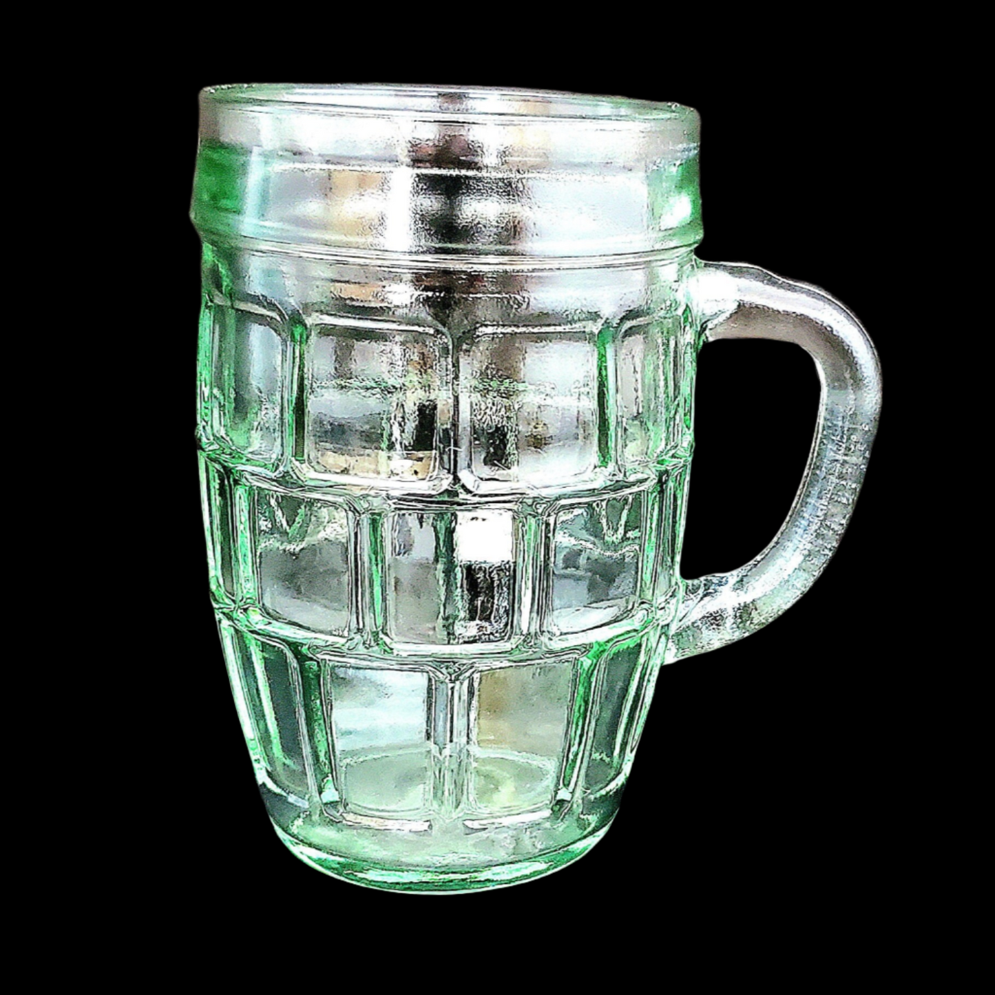These glasses are made of a pale green glass with a repeating block or thumbprint pattern. The walls of the glass are slightly bulged in the middle, giving them the root beer barrel shape. They stand 4 1/2" tall, and are just over 2 1/2" across at the rim. With the handle, the glass is 3 1/2" across. These glasses are numbered on the bottom.