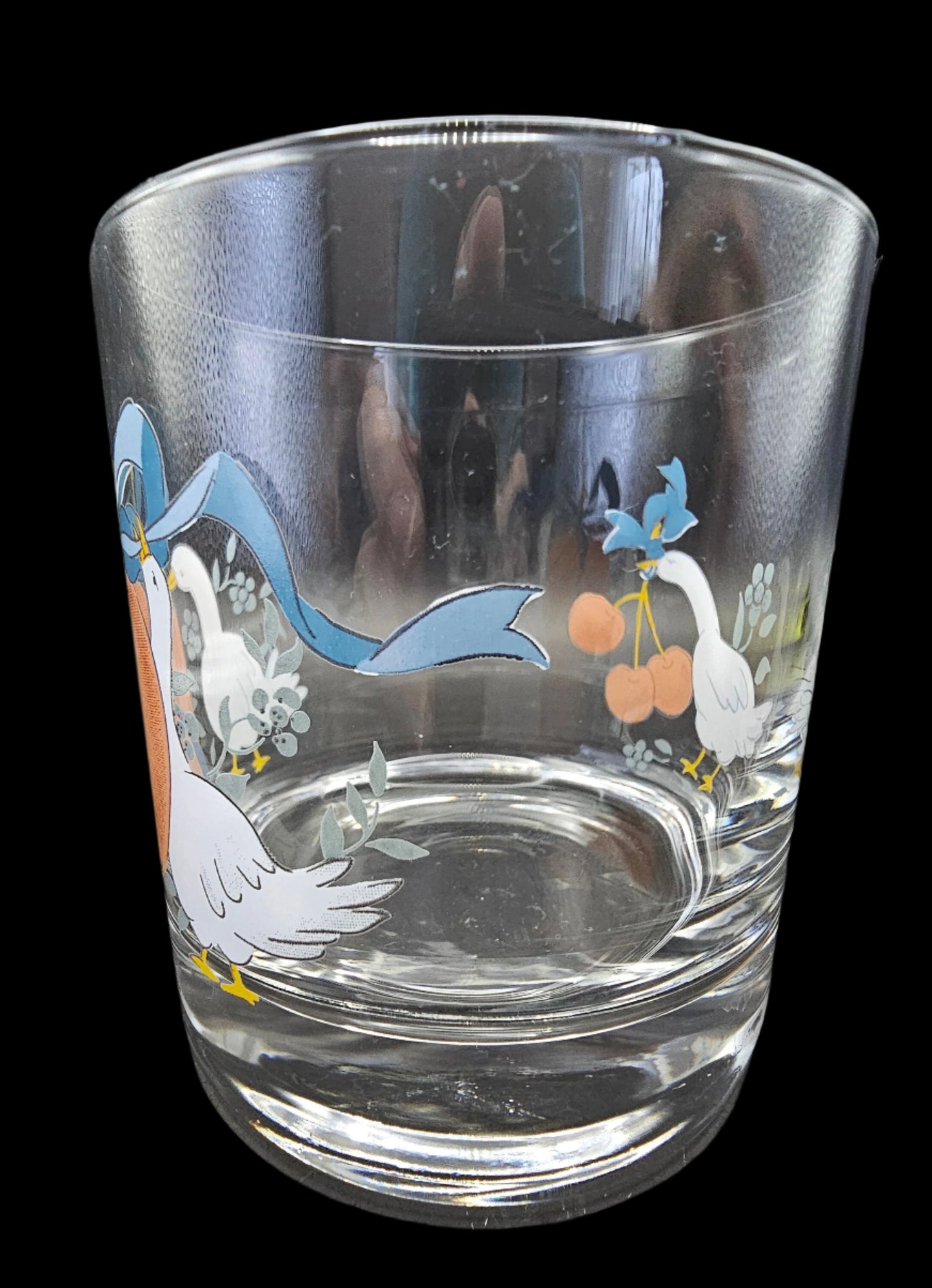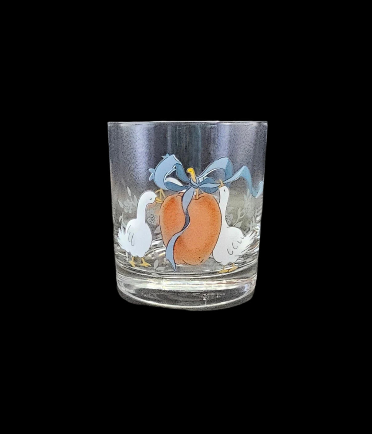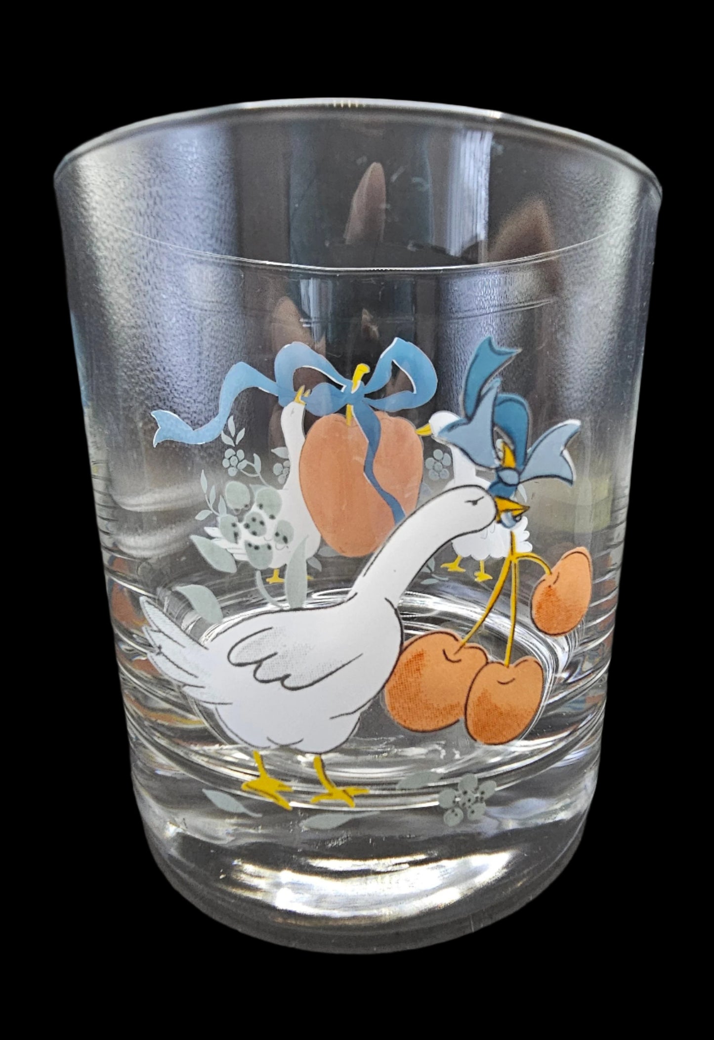 This listing is for one 8 oz Double Old-Fashioned Tumbler or juice glass, measuring 3 1/2" tall and 3 1/8" across at the mouth. The tumbler has two scenes on it: on one side, two geese frame a large apple with a blue ribbon tied into a bow. On the other side, a single goose dangles a spray of 3 red cherries from its beak. This glass is solid, with a heavy bottom. If you've ever had pets, you know the value of well-made glassware with a heavy bottom!