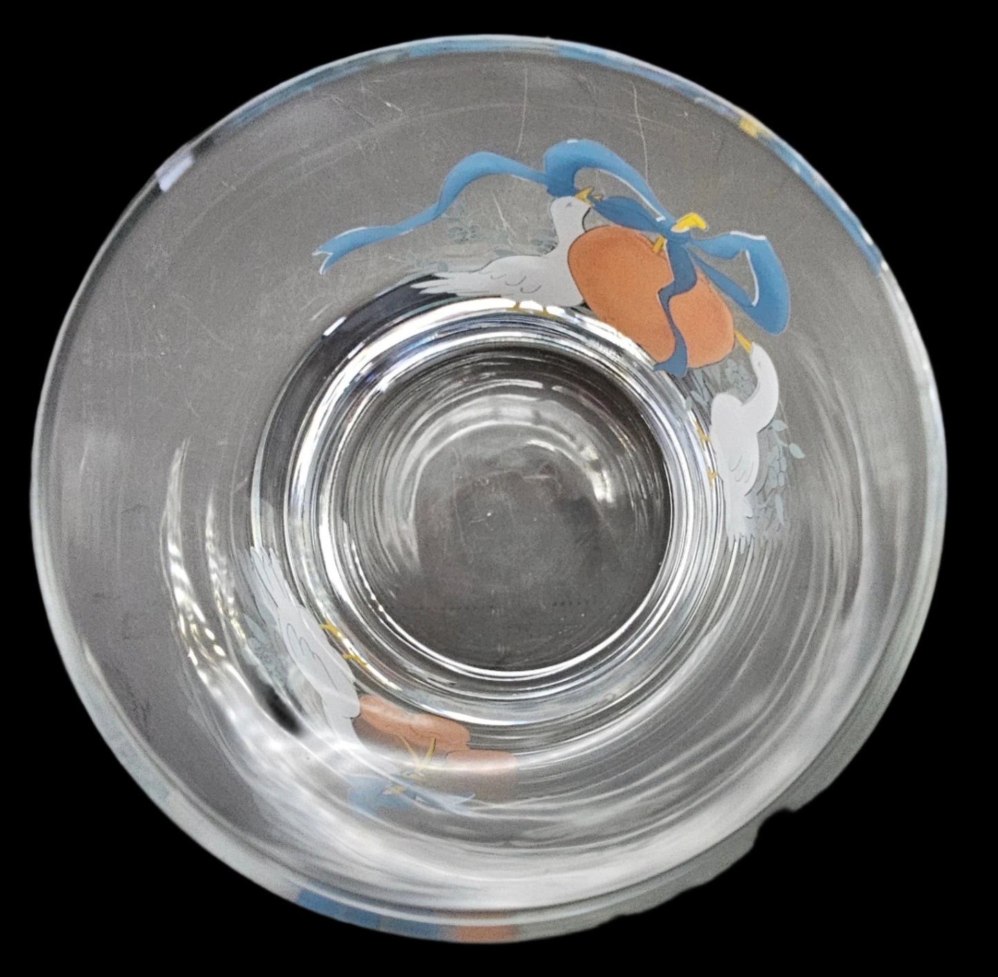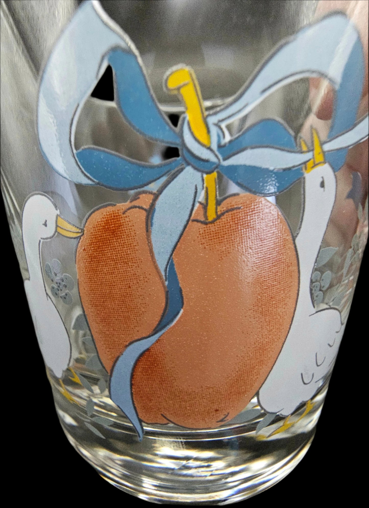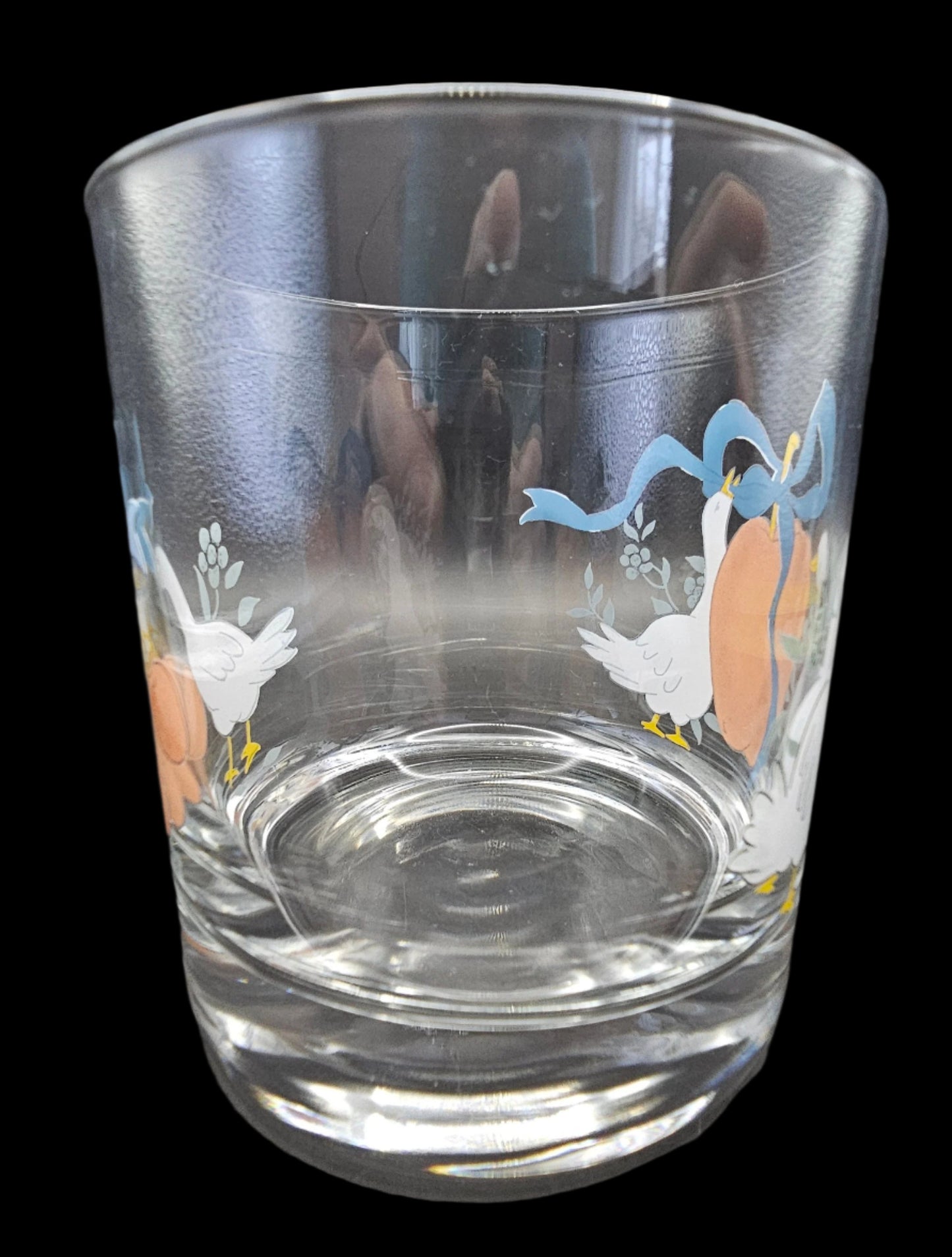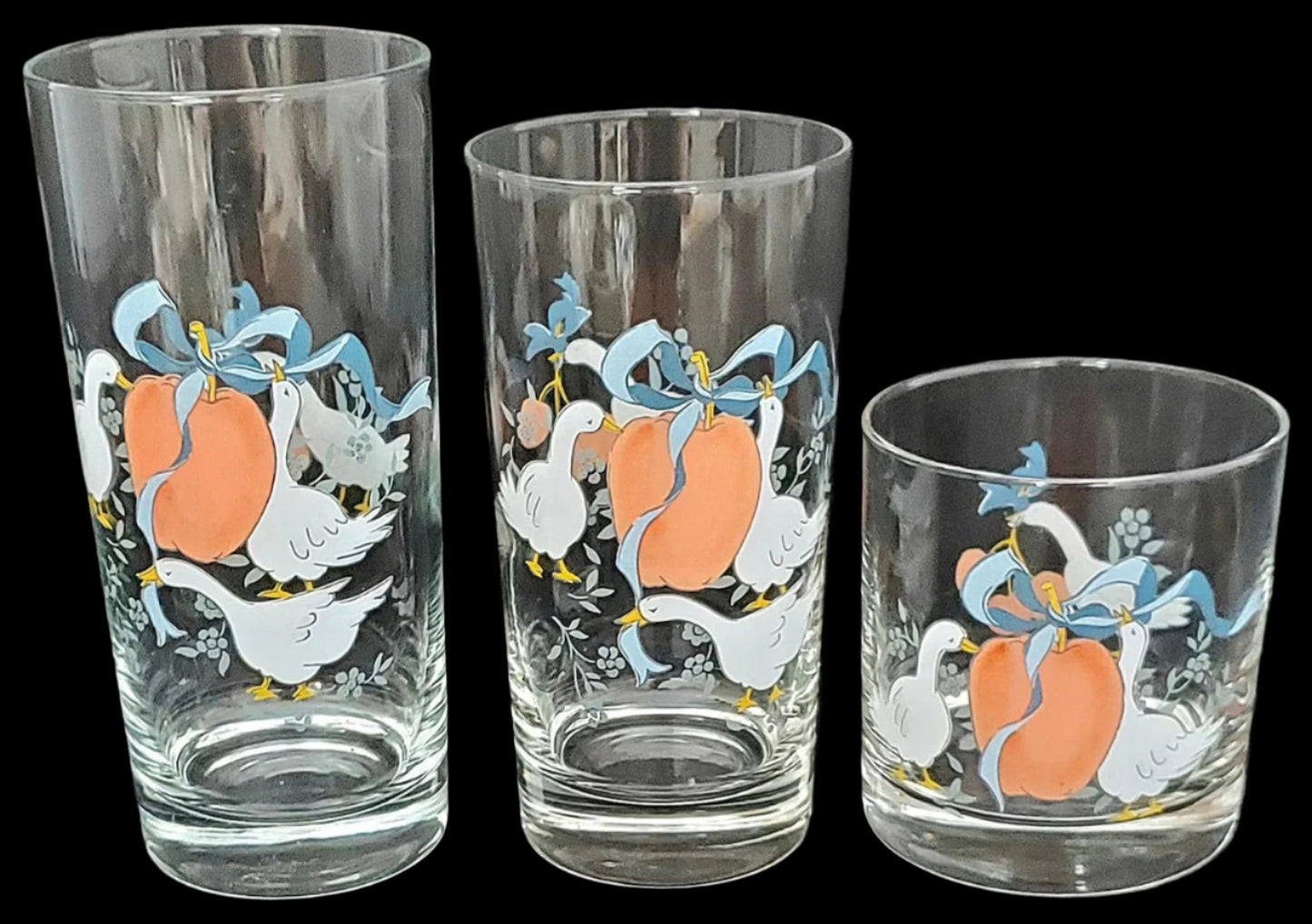 This listing is for one 8 oz Double Old-Fashioned Tumbler or juice glass, measuring 3 1/2" tall and 3 1/8" across at the mouth. The tumbler has two scenes on it: on one side, two geese frame a large apple with a blue ribbon tied into a bow. On the other side, a single goose dangles a spray of 3 red cherries from its beak. This glass is solid, with a heavy bottom. If you've ever had pets, you know the value of well-made glassware with a heavy bottom!