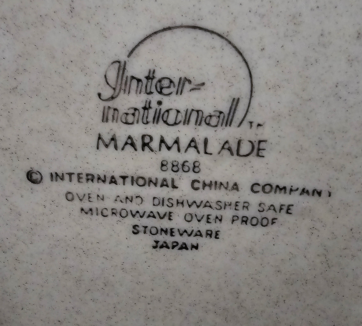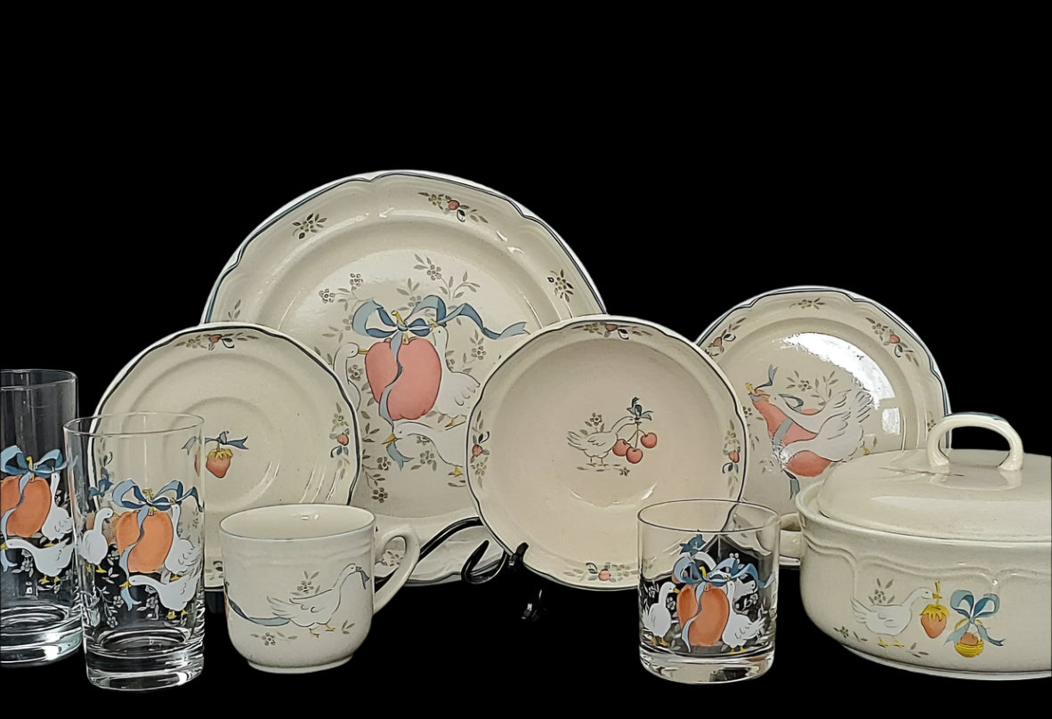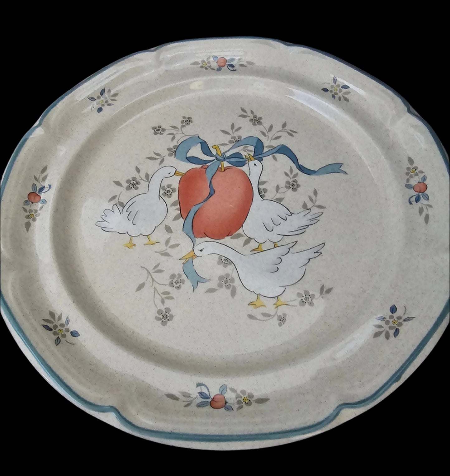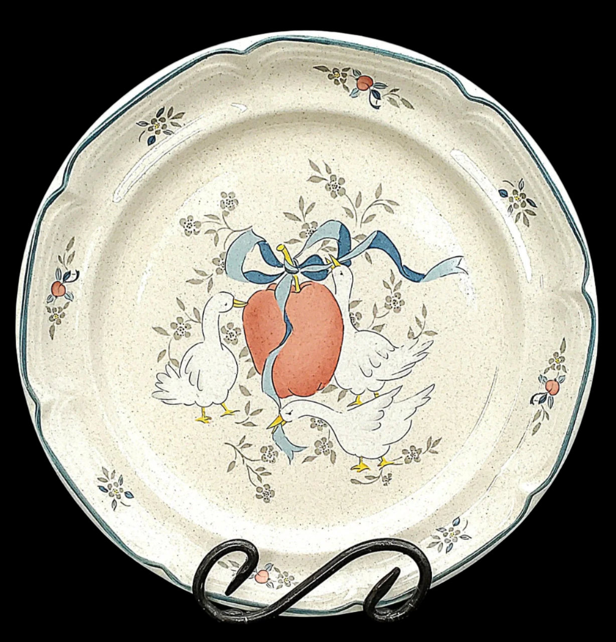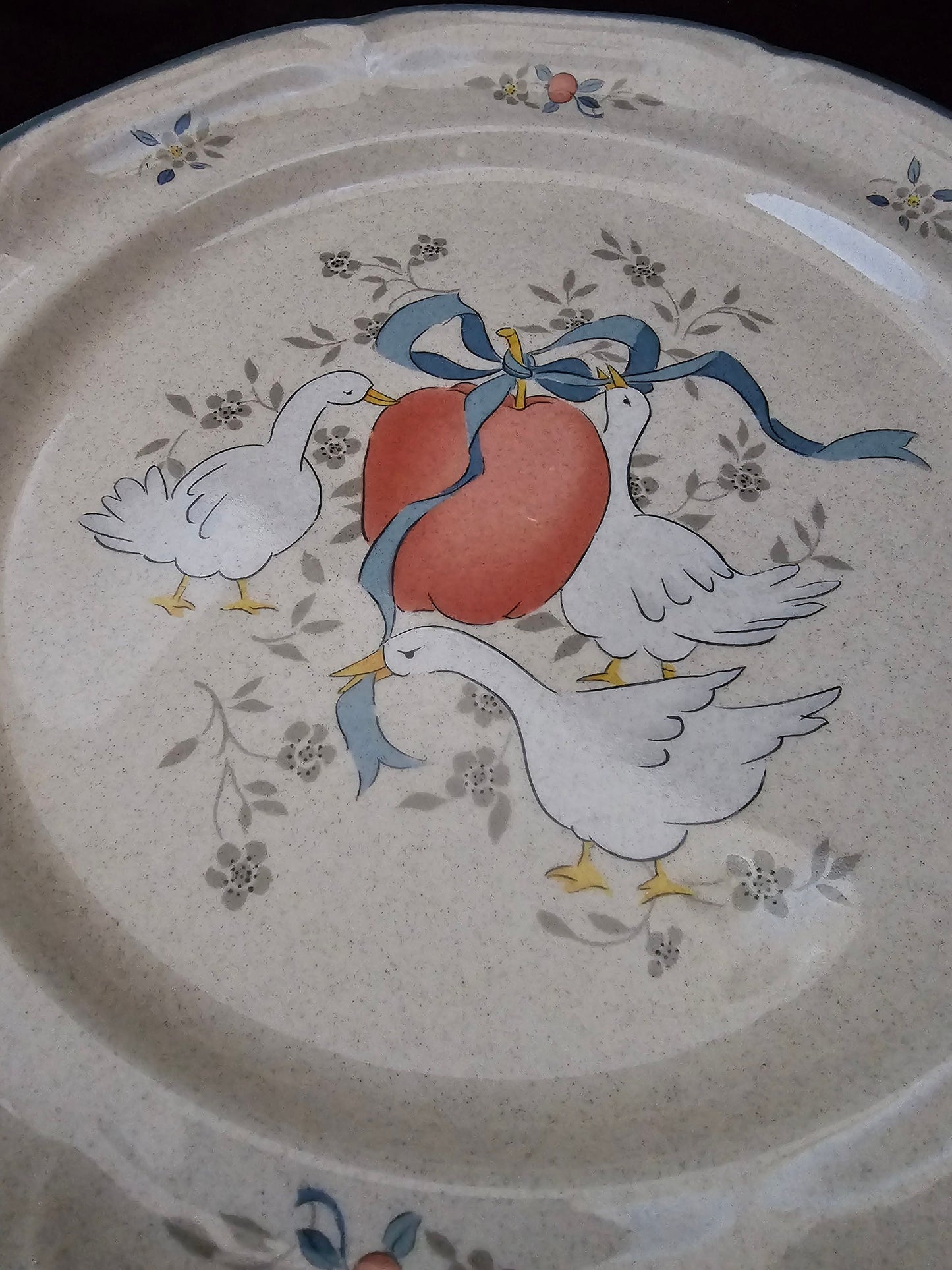 This charming and oh-so-adorable stoneware pattern from International Tableworks, Japan, perfectly captures the essence of the 1980s fascination with geese and country living. Say hello to "Marmalade," featuring a delightful speckled cream base color with medium blue edging. What makes this pattern truly charming is the quintessential 1980's white goose and fruit motif in different combinations on different dishes, with soothing pale red and blue accents.