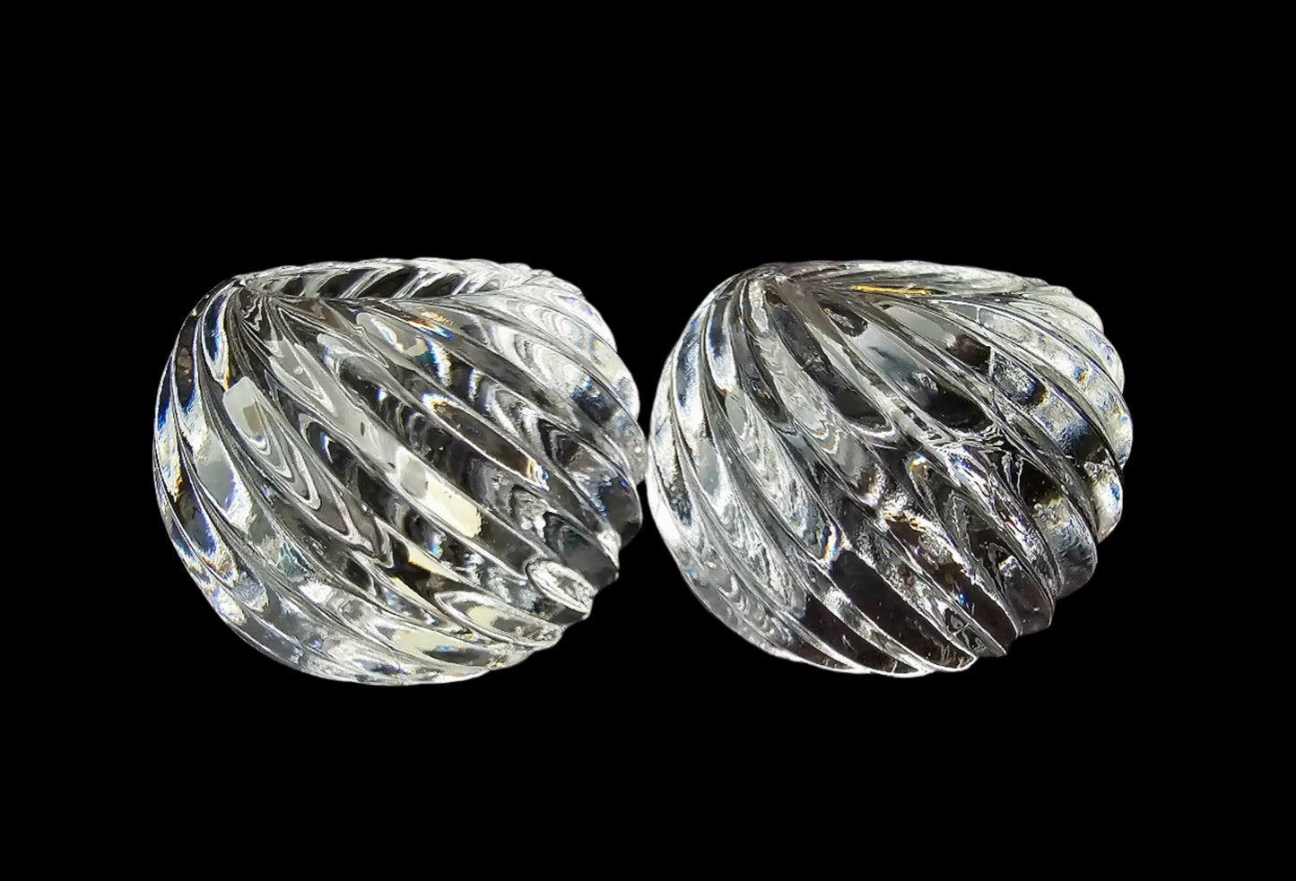 Made of heavy, thick glass or crystal, this pair of votive or tea light holders work with any decor. They are manufactured by Colonial Candle, Taiwan and measure approximately 2" high and 2 1/2" wide.