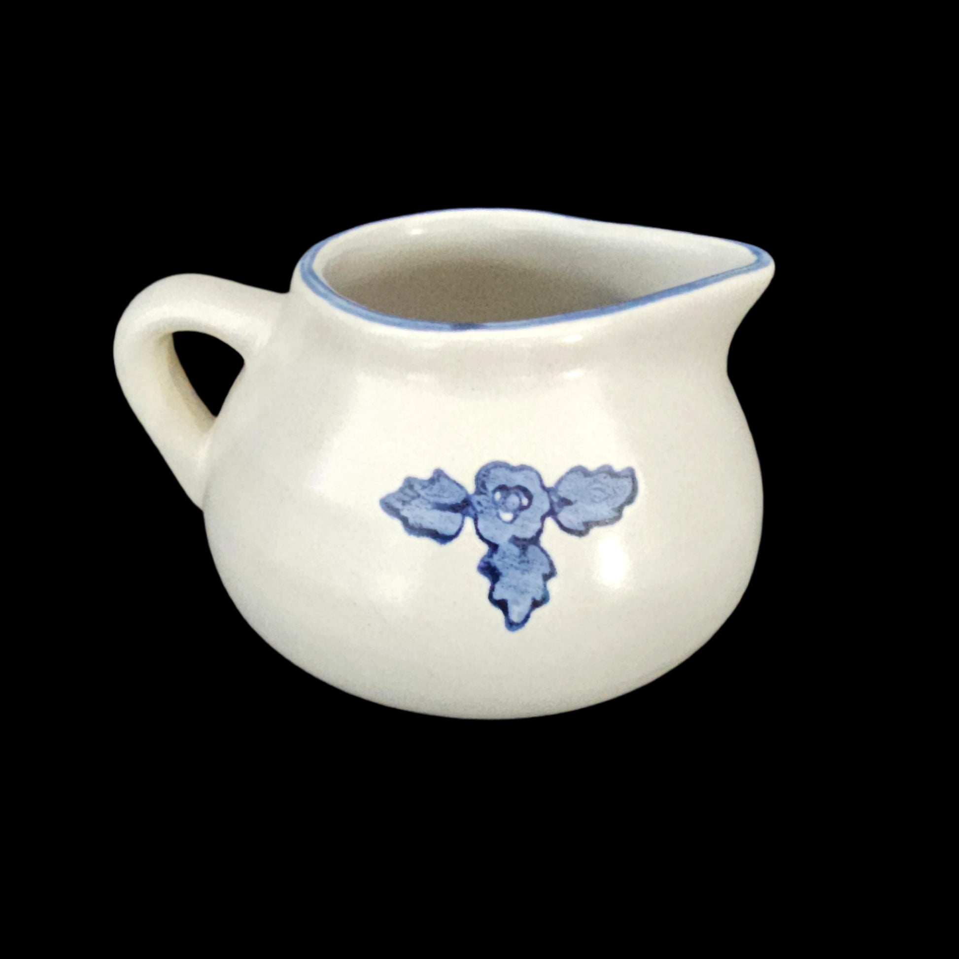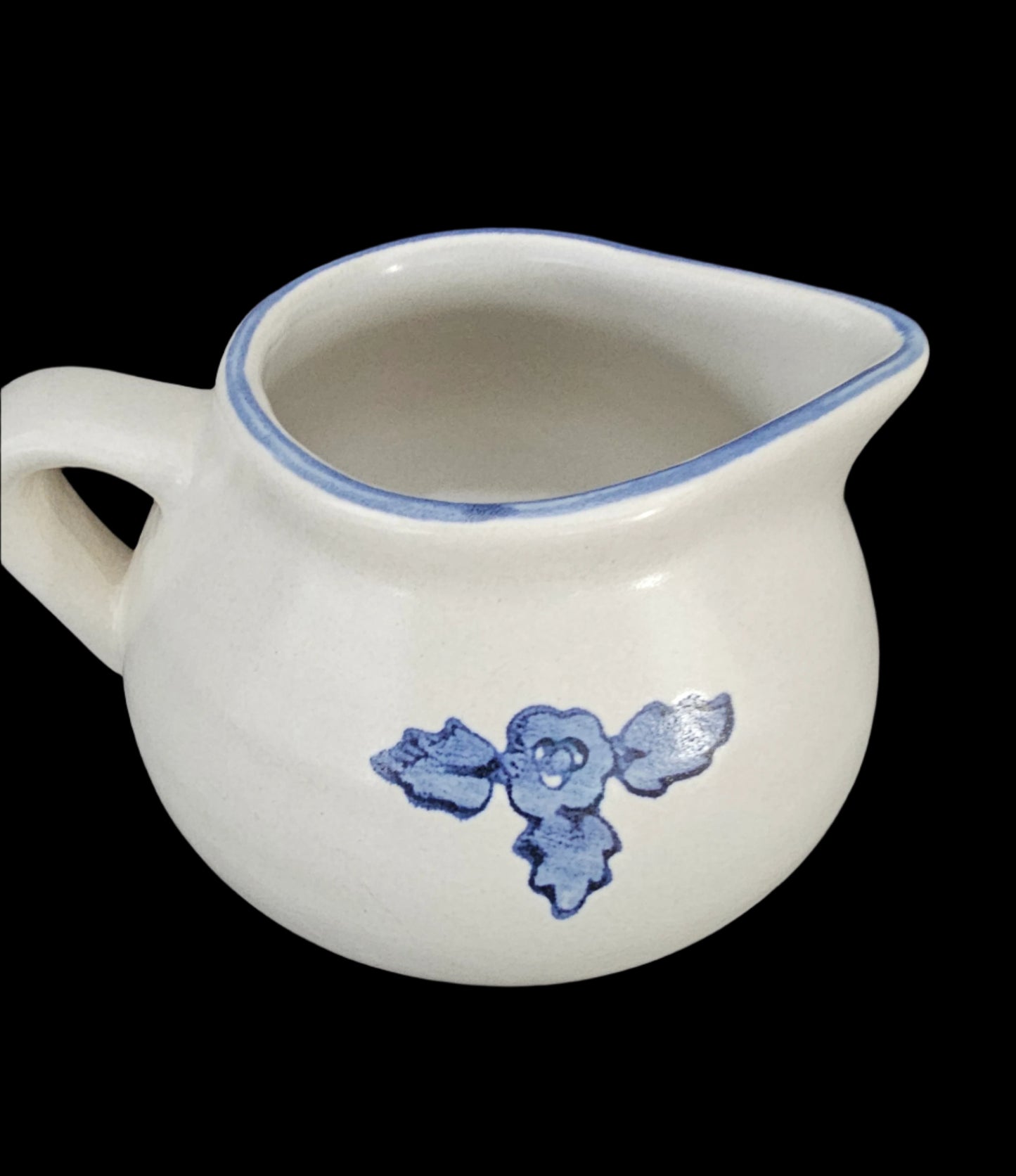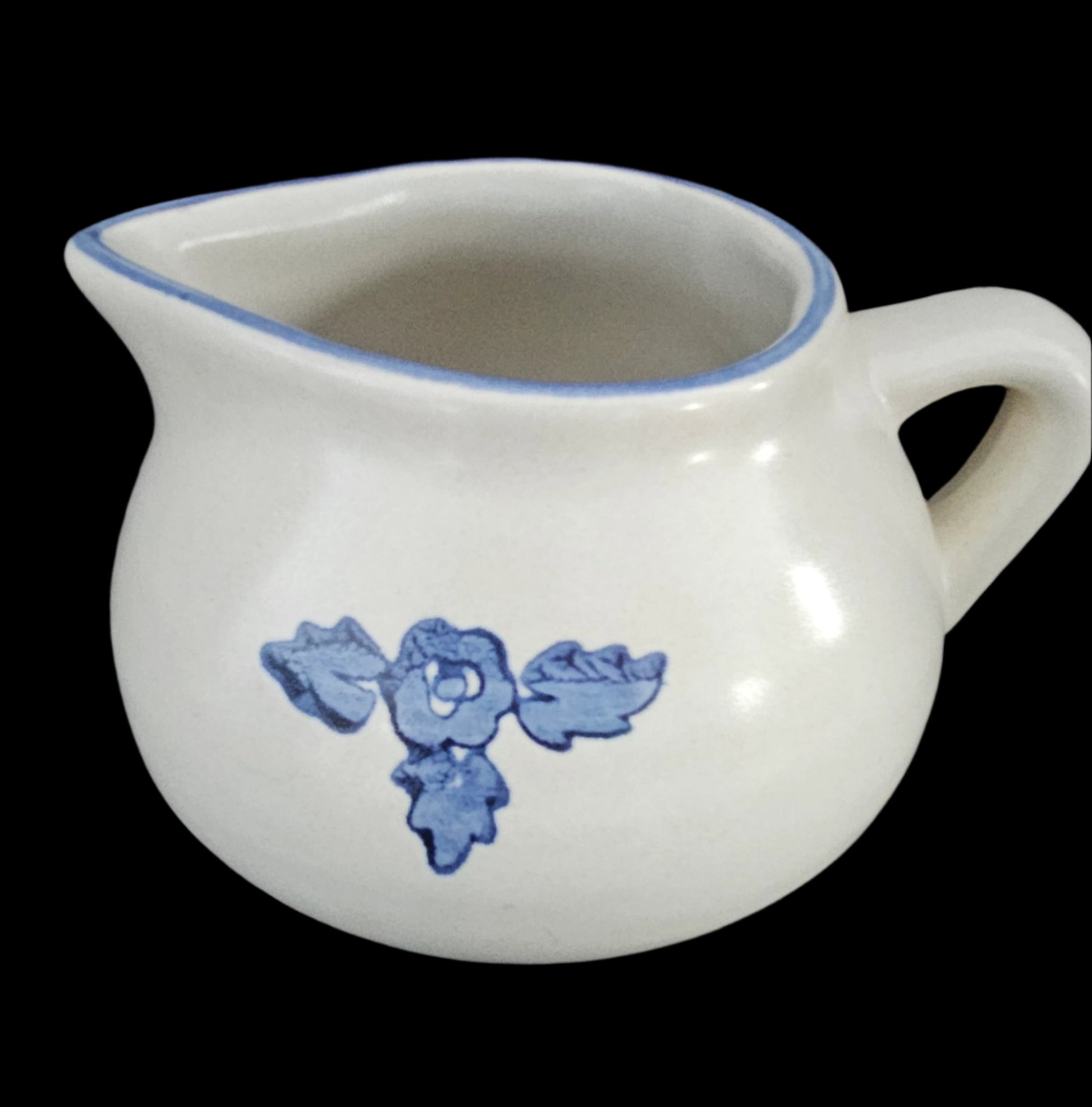 Yorktowne pattern by Pfaltzgraff - discontinued. This piece is chunky, with a white/off-white background, blue flower with three leaves, and a blue accent around the rim.