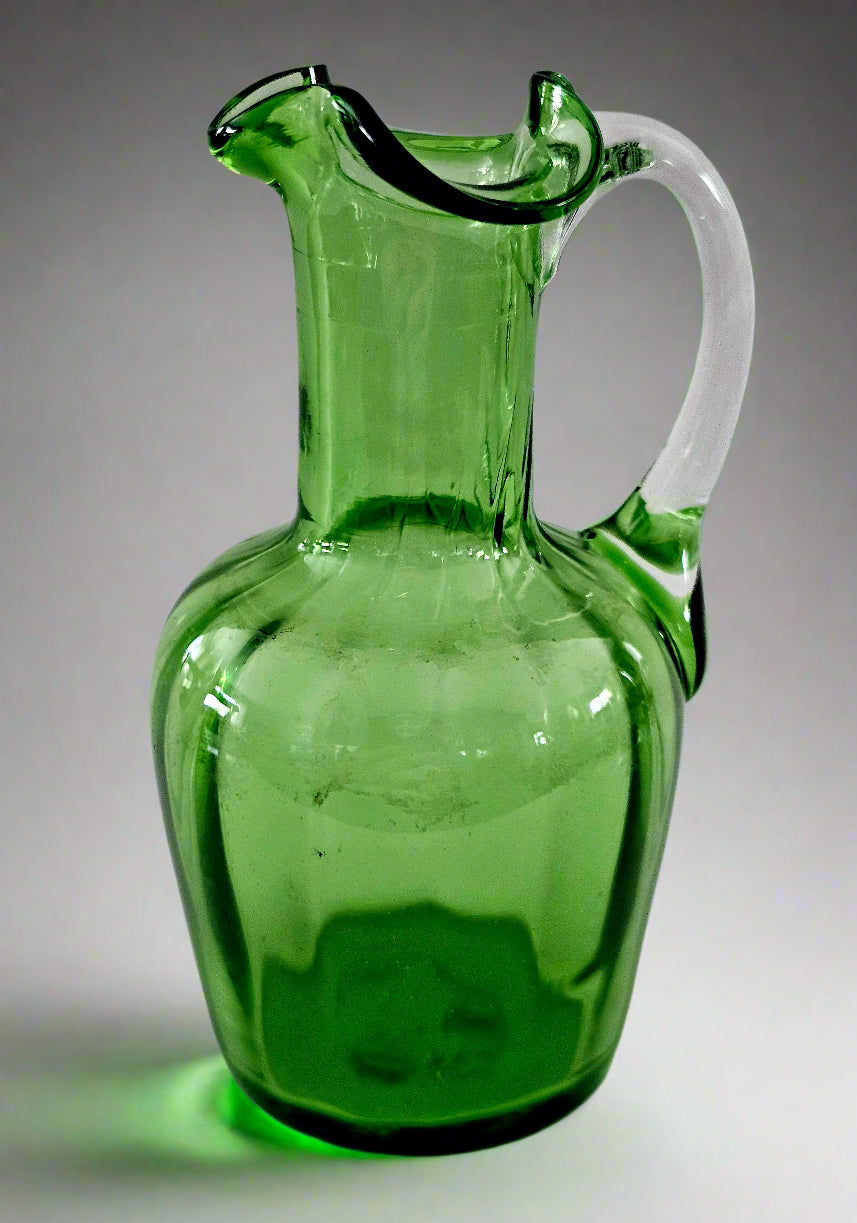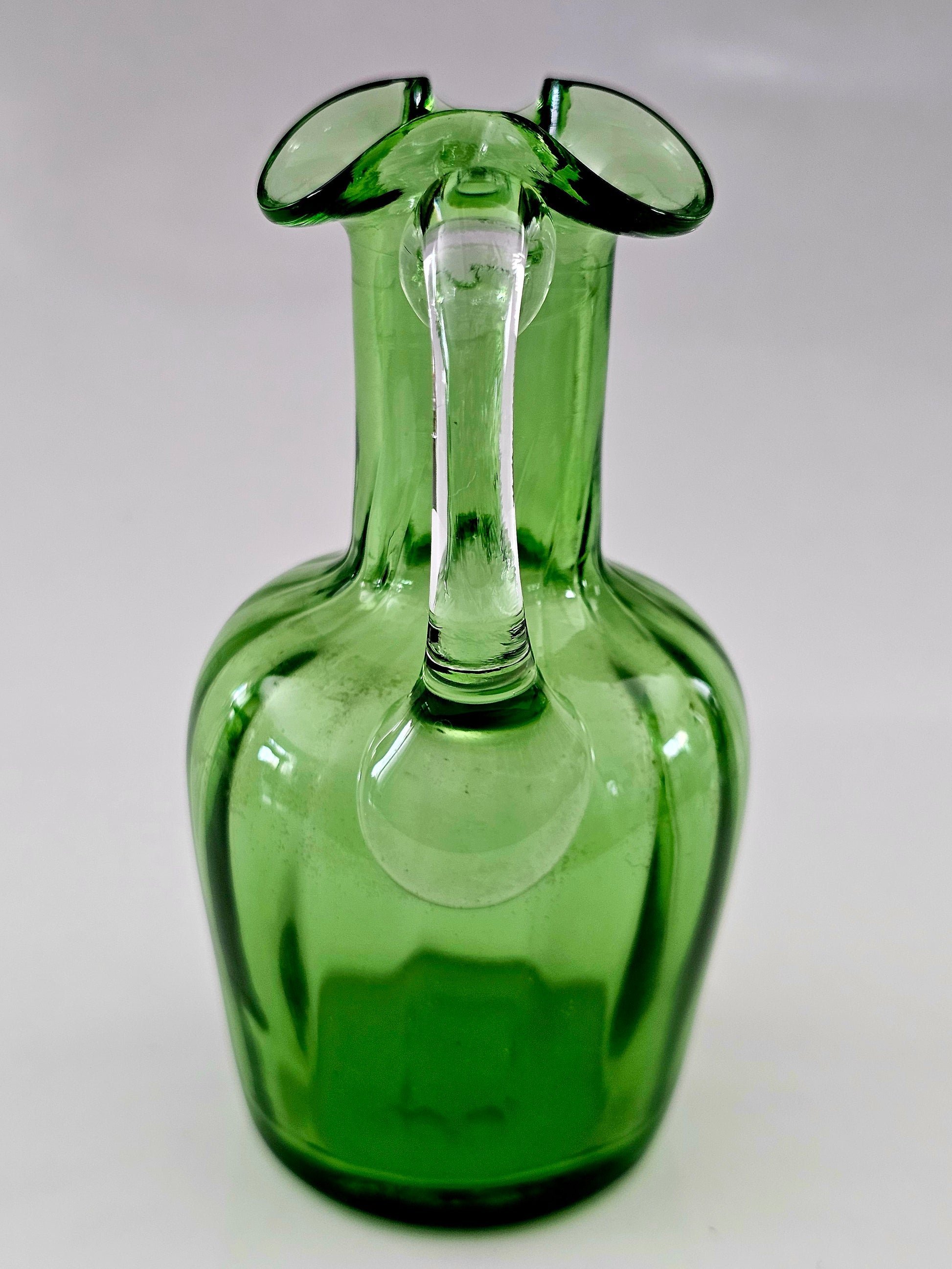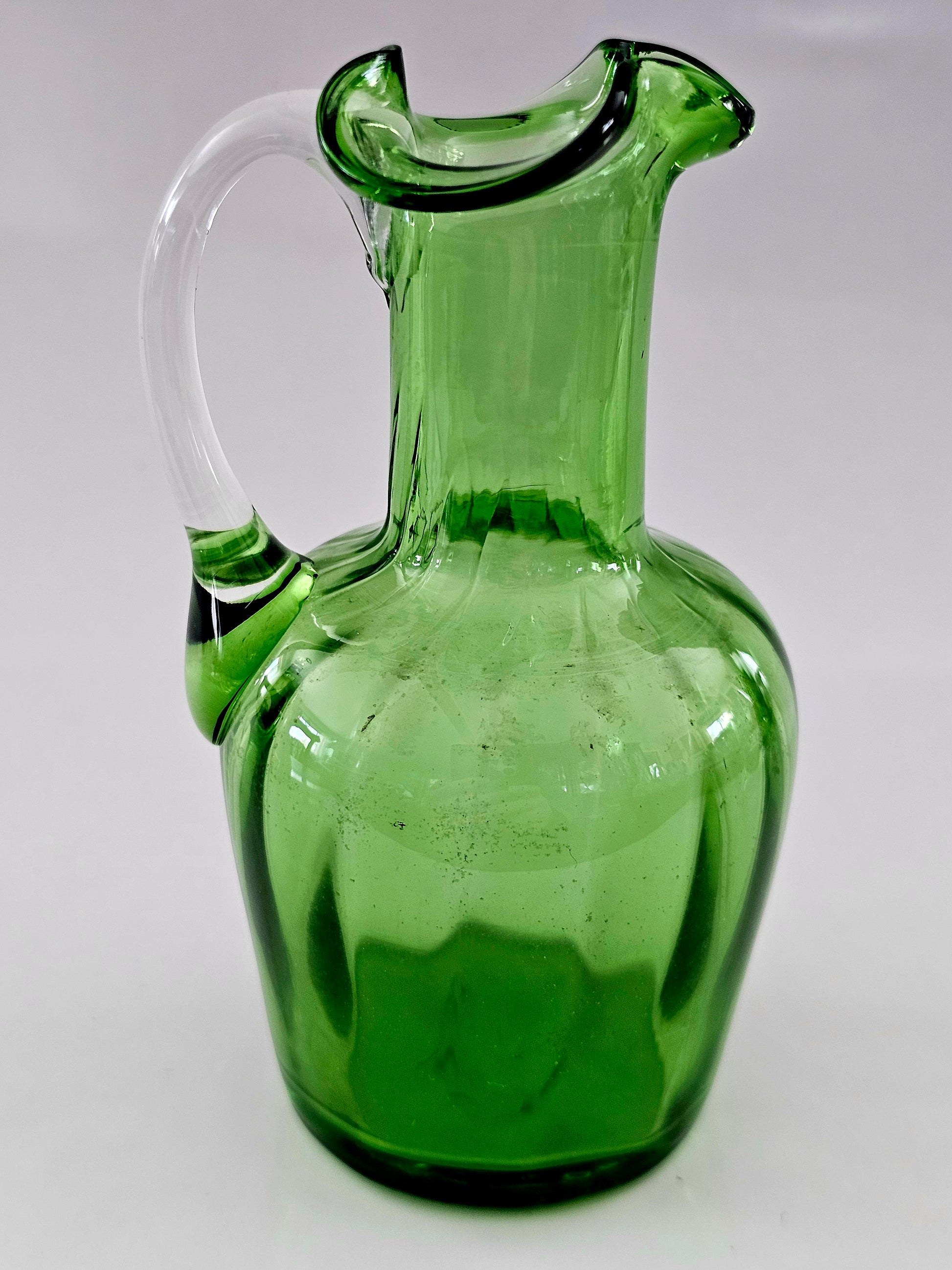 This little hand-blown vase is in the shape of a pitcher, with a clear glass handle. It could be used as a cruet, but would also work well as a bud vase for small flowers. It would also be lovely sitting in a window for light to filter through the lovely green glass.