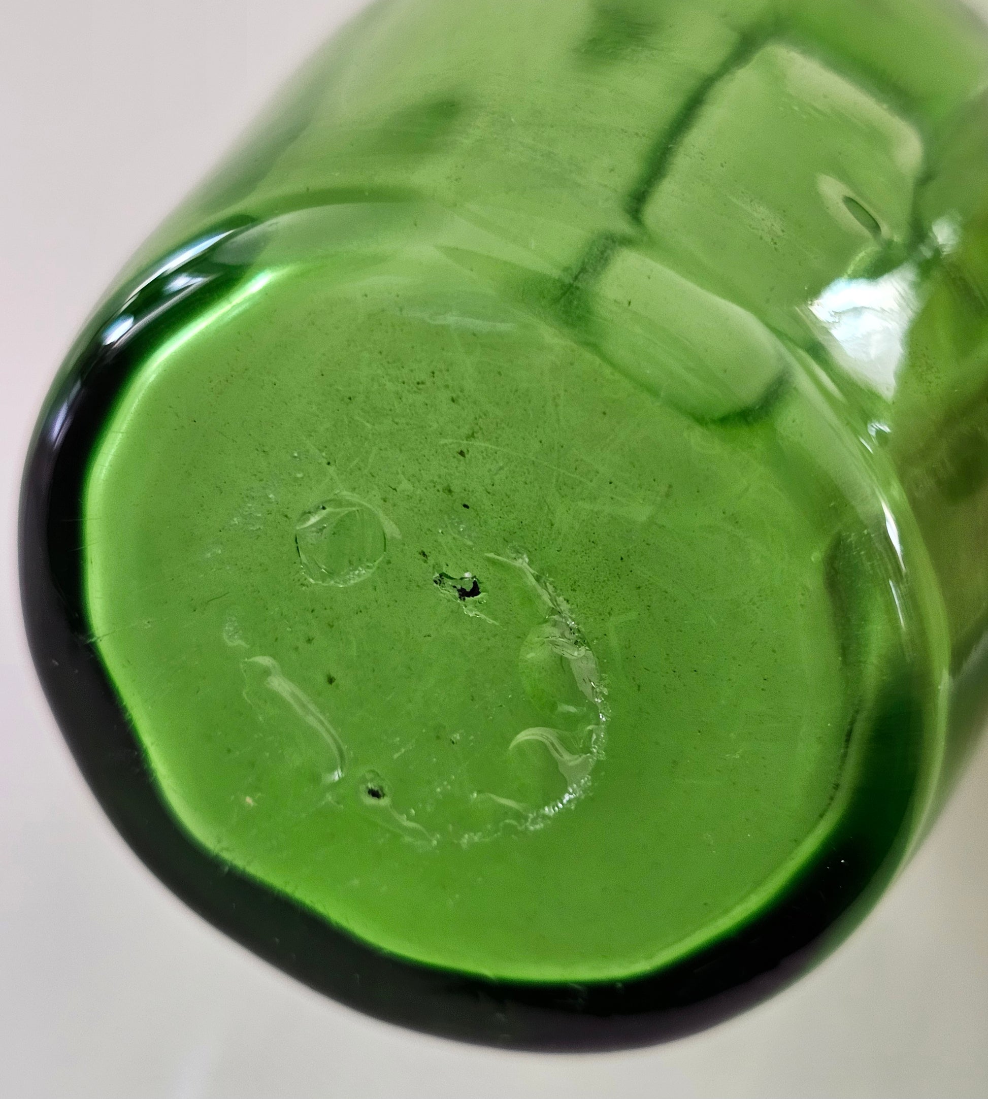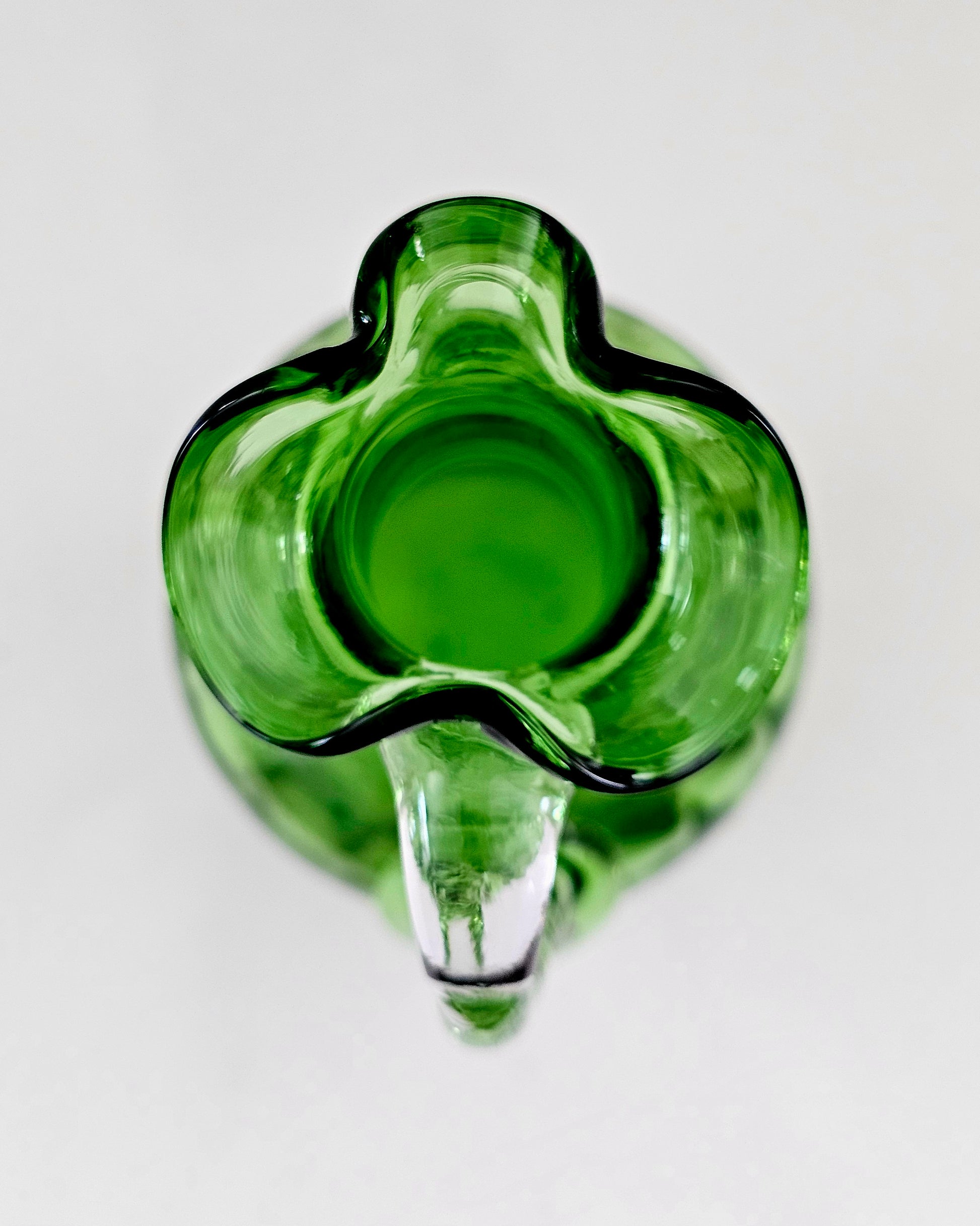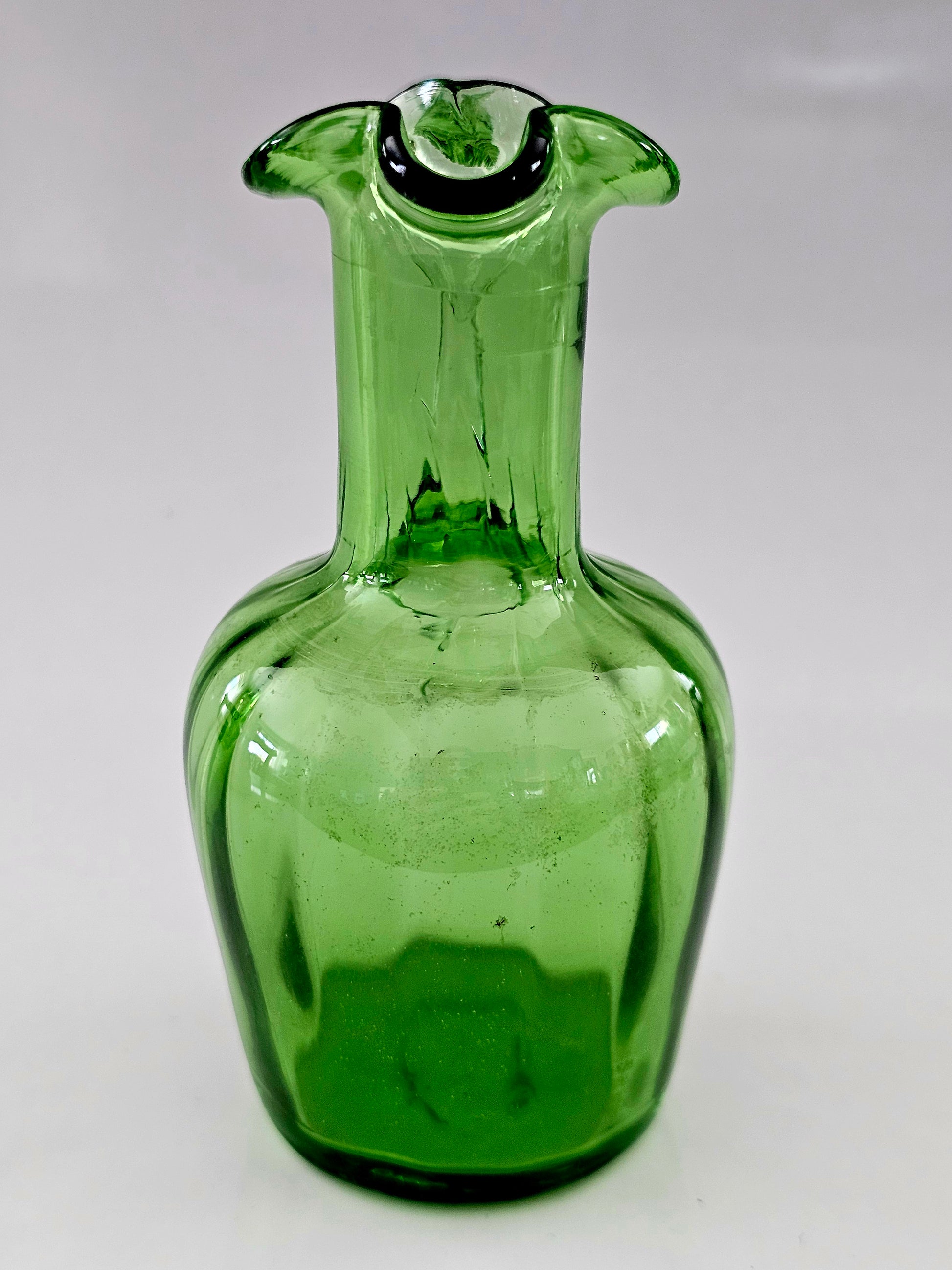 This little hand-blown vase is in the shape of a pitcher, with a clear glass handle. It could be used as a cruet, but would also work well as a bud vase for small flowers. It would also be lovely sitting in a window for light to filter through the lovely green glass.