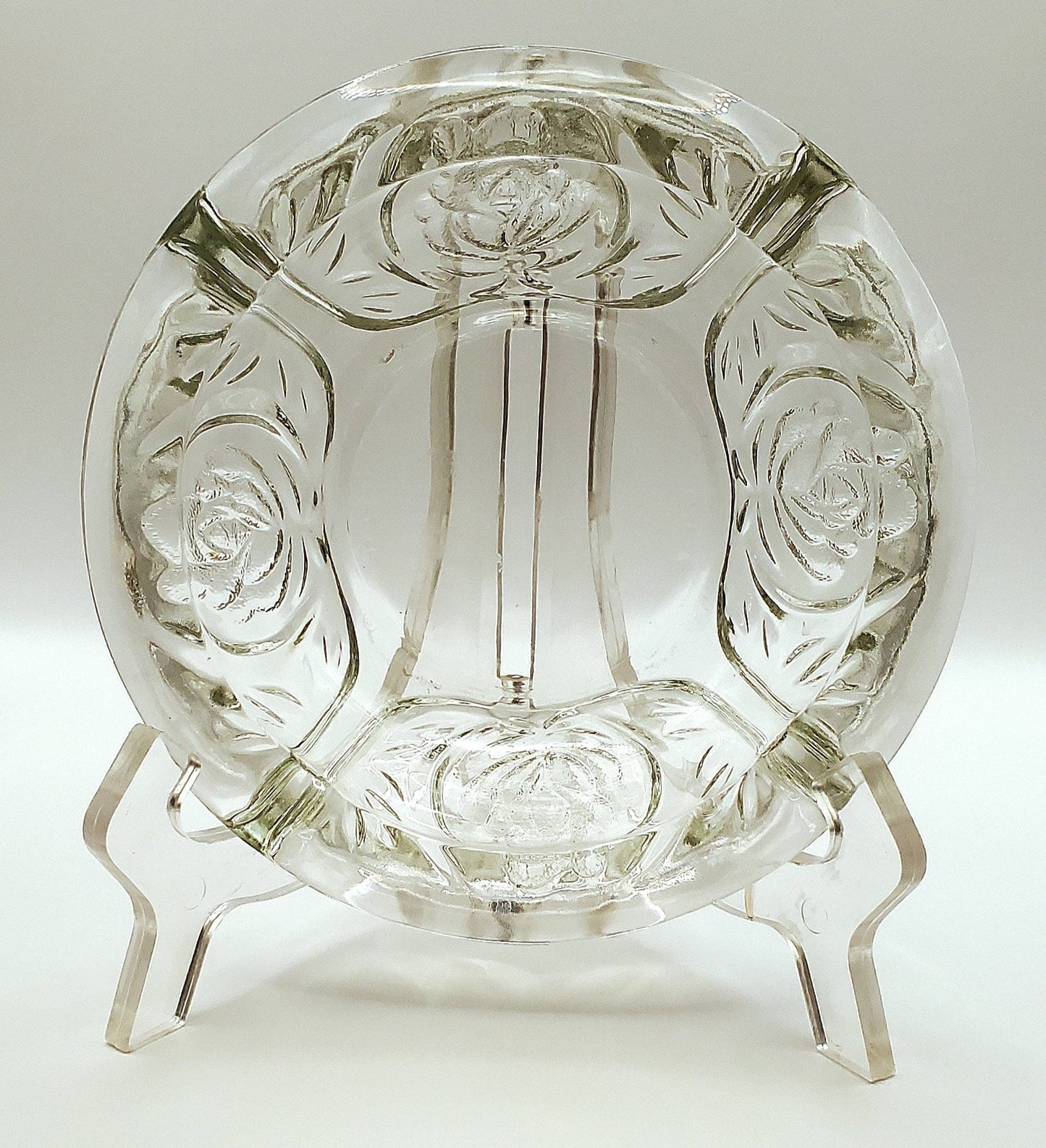 What style! This is a beautiful ashtray from KIG Indonesia. Pressed glass with roses on four sides.