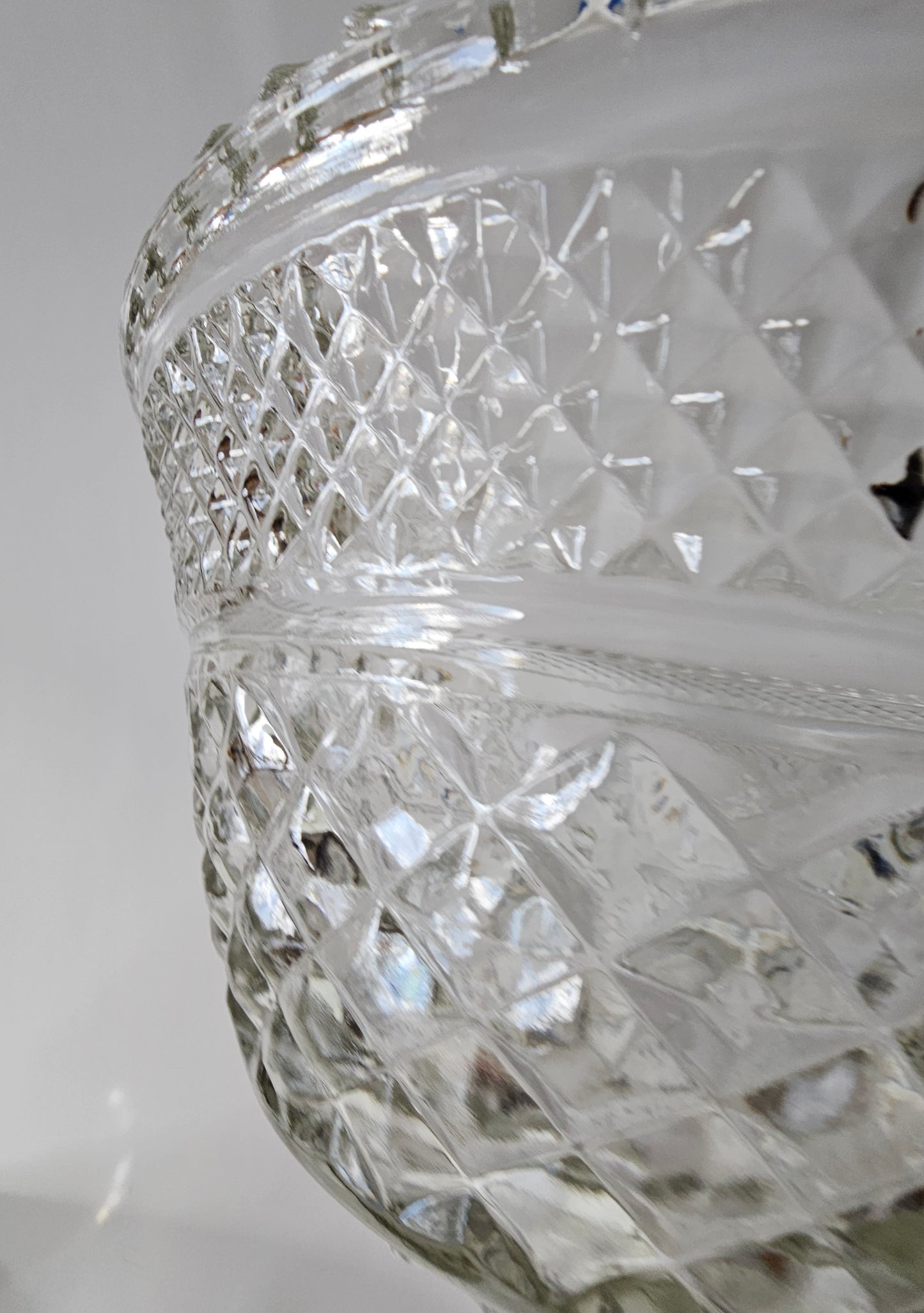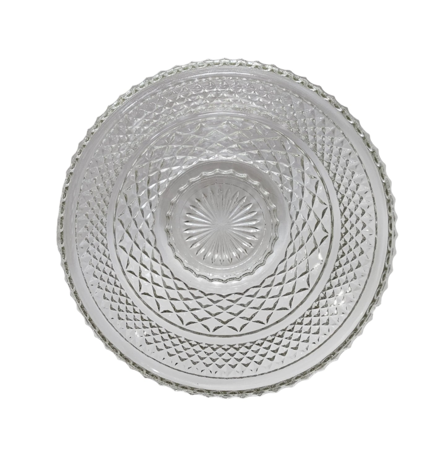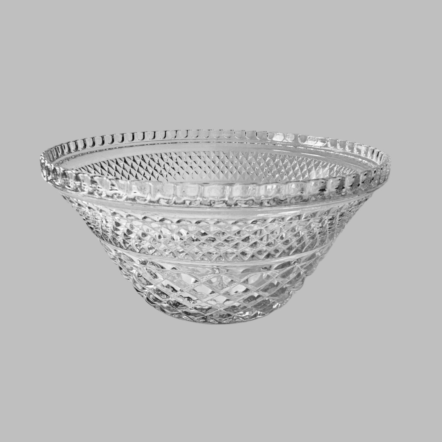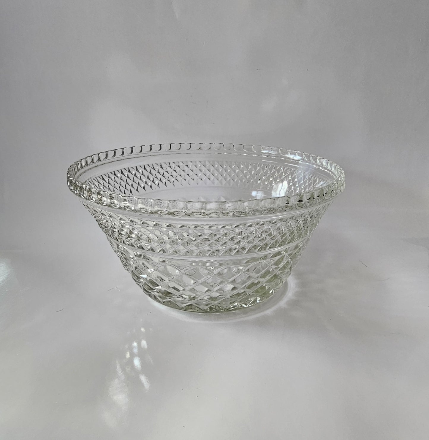This pressed glass bowl from Anchor Hocking is in the Wexford pattern, which is discontinued. It is actually the base for a punch bowl - it would be turned upside-down and the larger bowl set on top. Without the larger punch bowl, however, this becomes a lovely salad or fruit bowl! This bowl stands 5" tall and is 9 1/2" at the widest point.