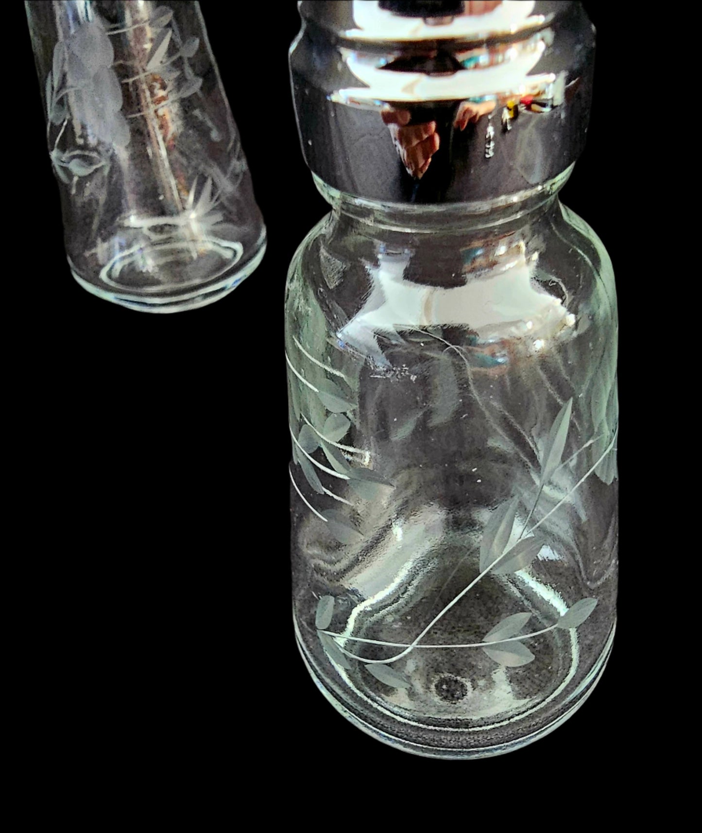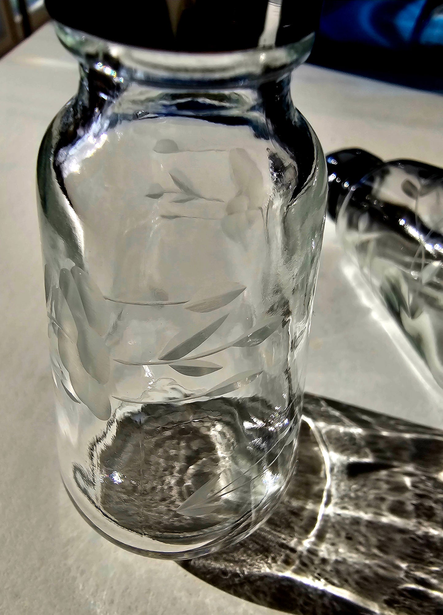 The Heritage pattern by Princess House is timeless: lead crystal with delicately etched flowers, stems, and leaves. The pattern has been discontinued.