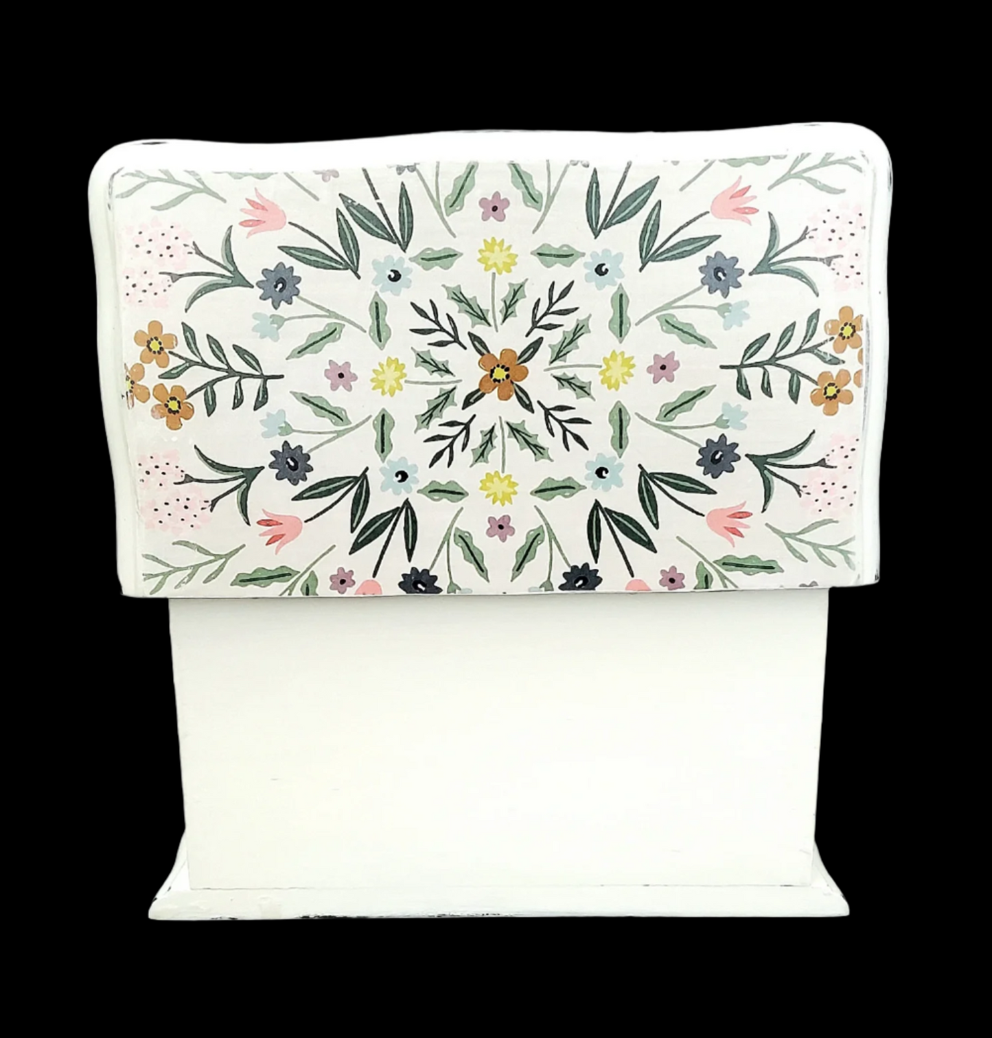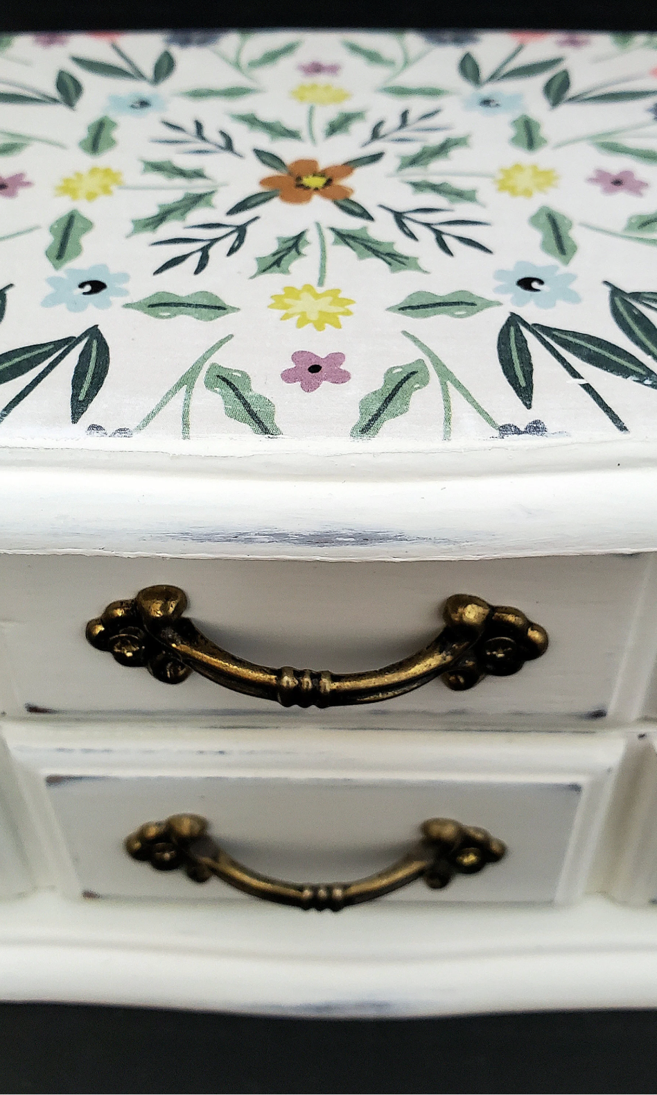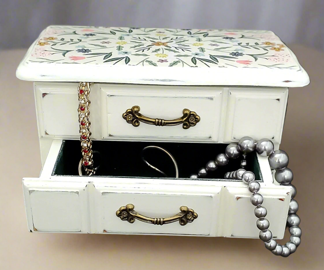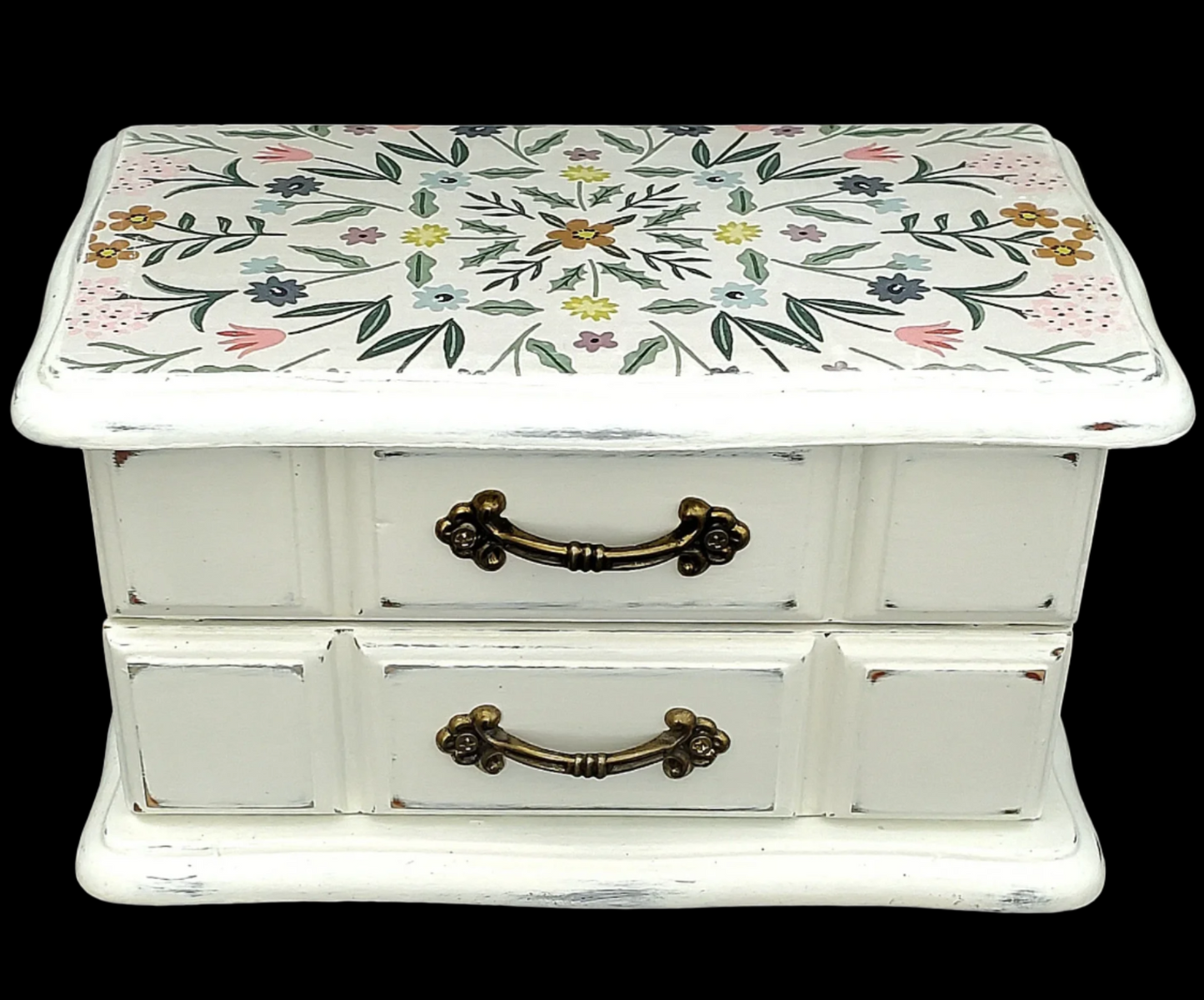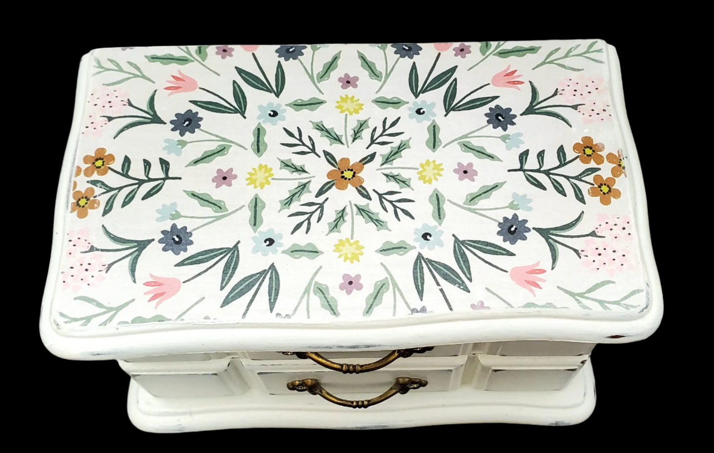 This little jewelry box has been given new life and is ready for a new home! It has a distressed off-white finish with geometric floral decoupage on the lid in shades of light blue, greens, yellows, oranges and pinks. It has been finished it with several layers of sealant, so this finish will wear well with normal use.