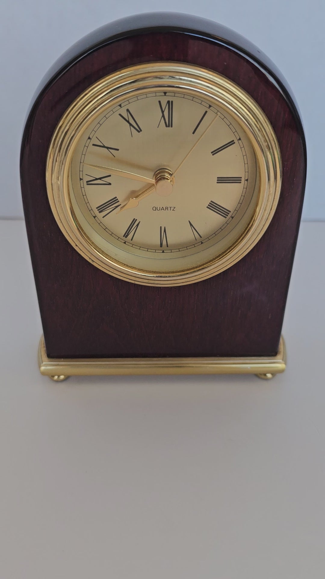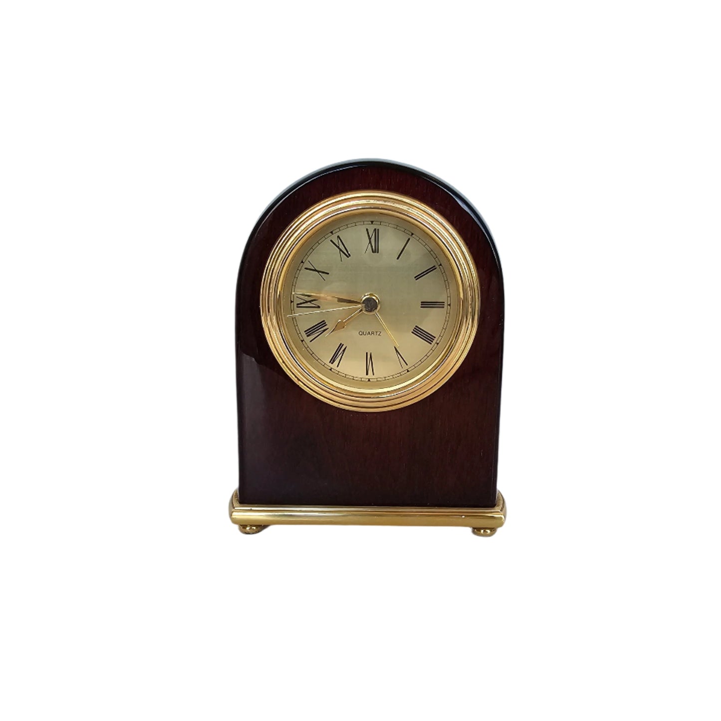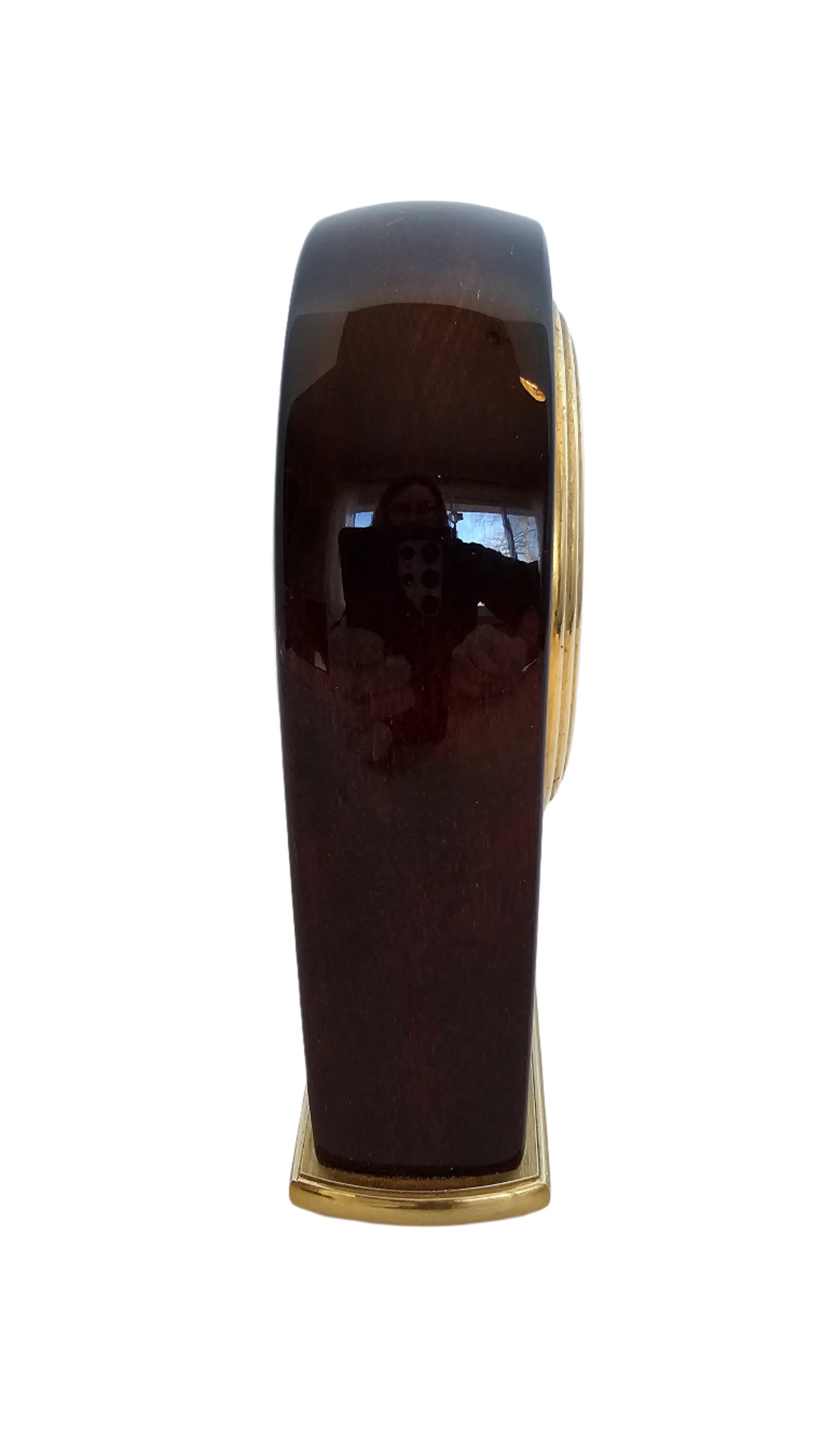 This clock does it all - analog and with a second hand, it looks elegant and chic in glossy red wood with brass face and accents. Use as a desk clock with a reminder to get some "me time," or as an elegant bedside piece. This clock uses a standard battery, which cannot be included due to postal regulations.