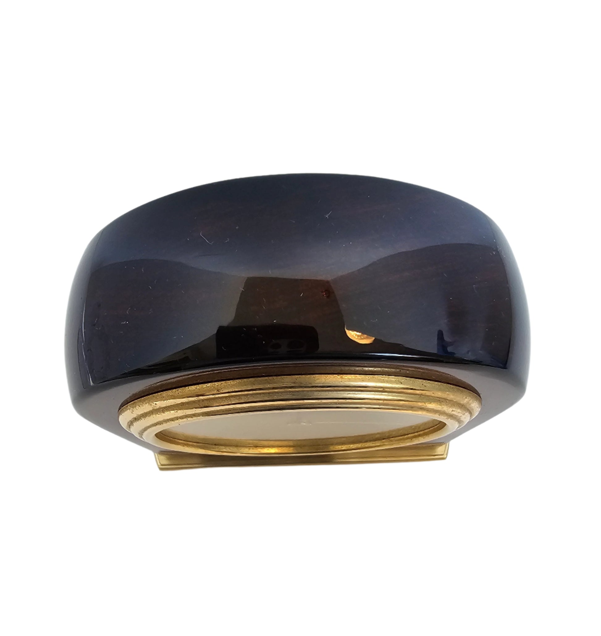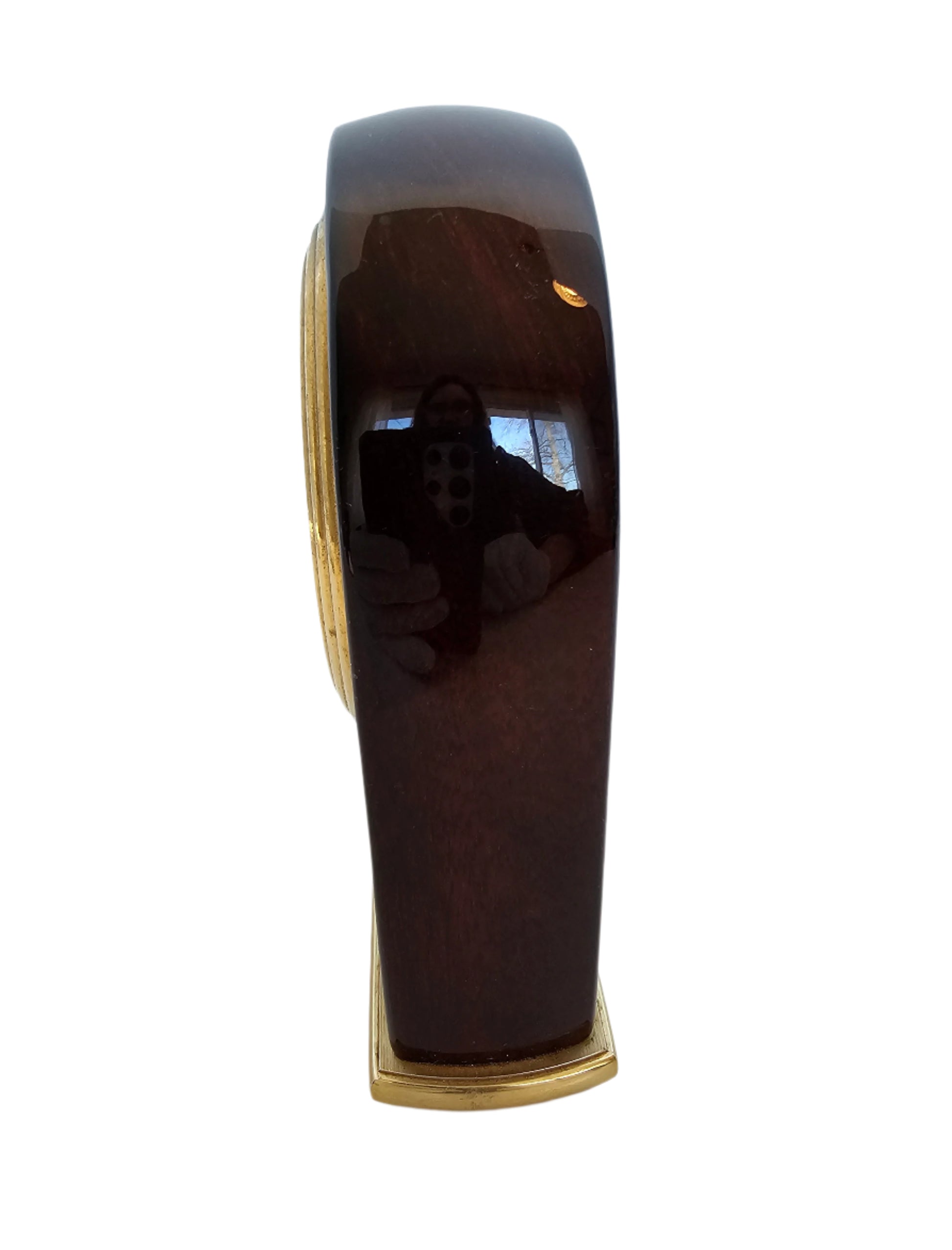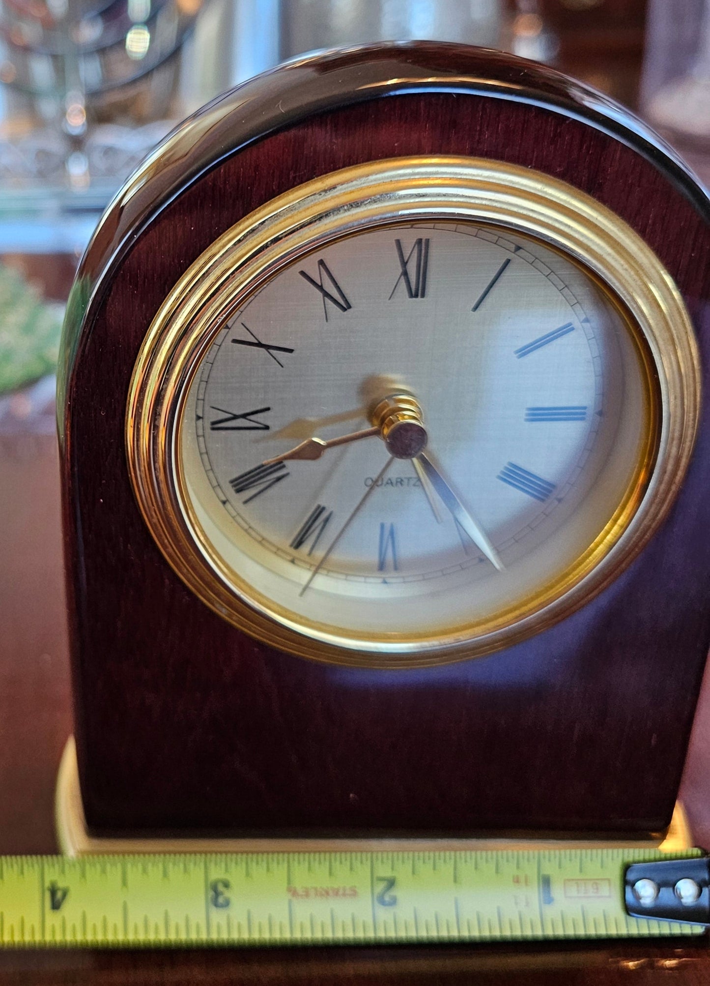 This clock does it all - analog and with a second hand, it looks elegant and chic in glossy red wood with brass face and accents. Use as a desk clock with a reminder to get some "me time," or as an elegant bedside piece. This clock uses a standard battery, which cannot be included due to postal regulations.
