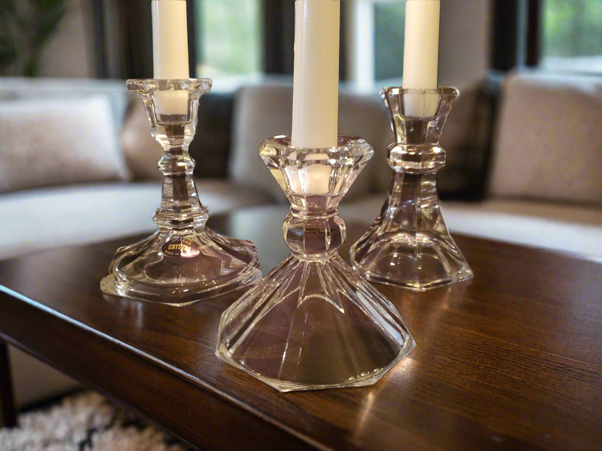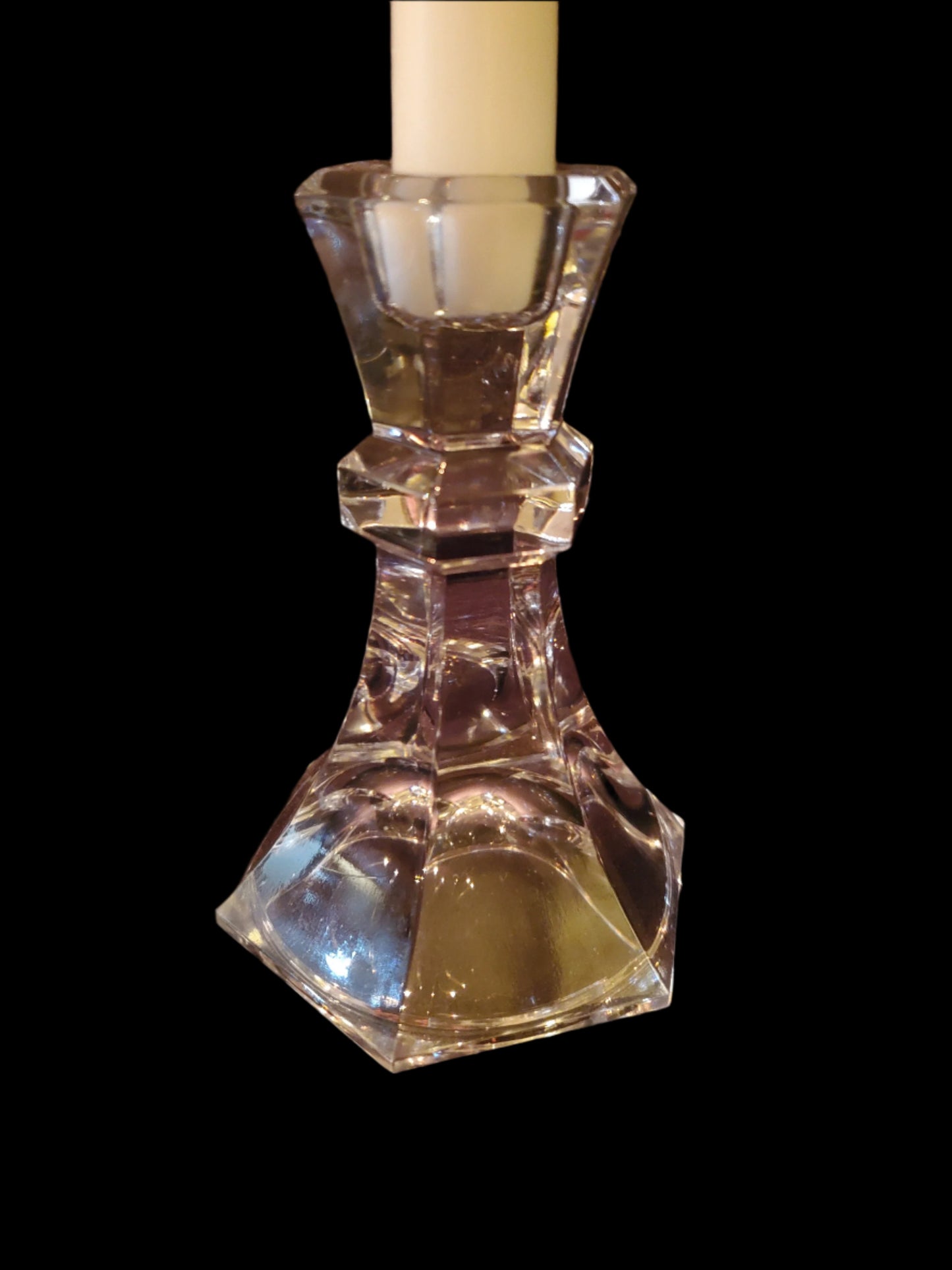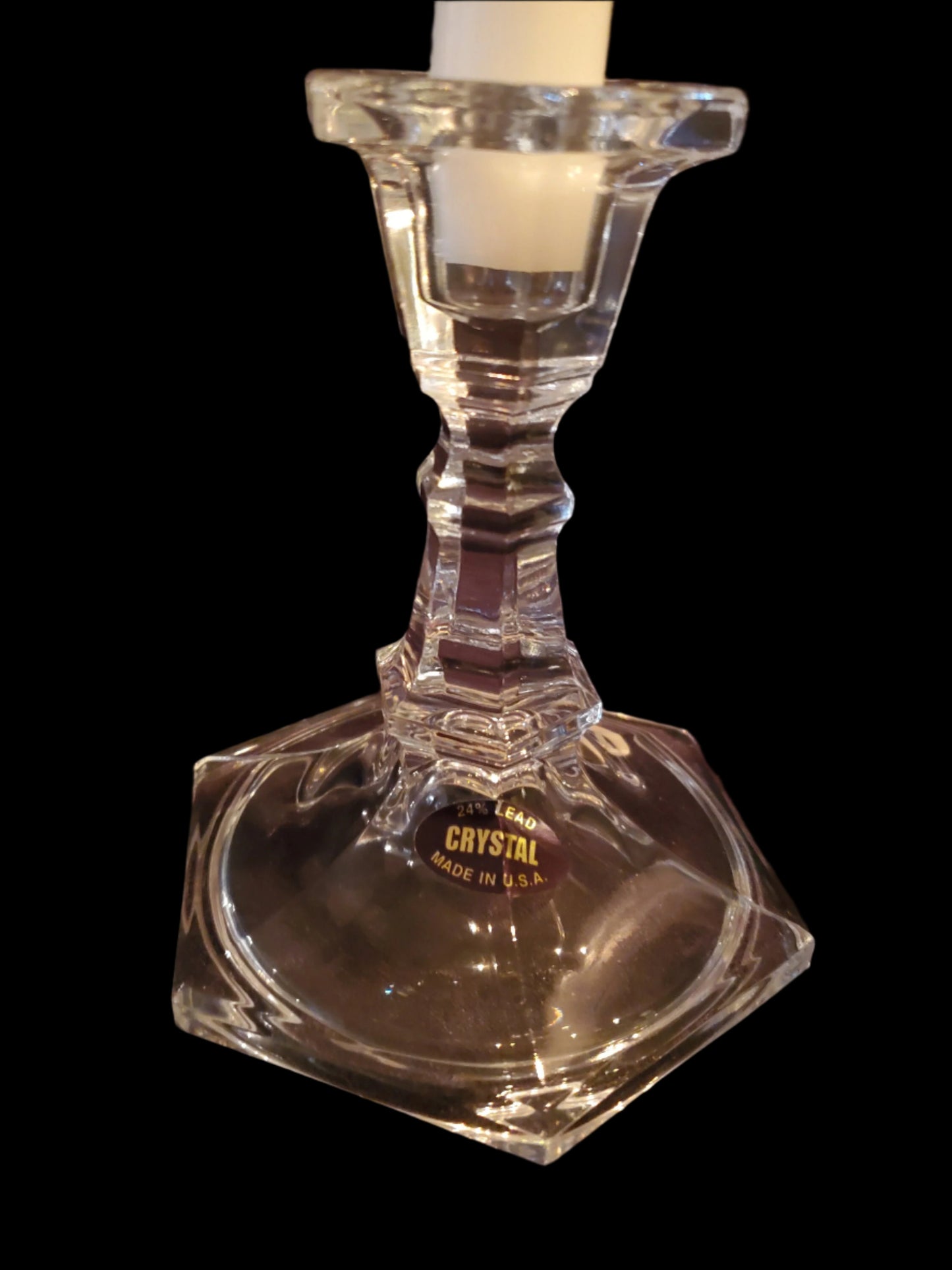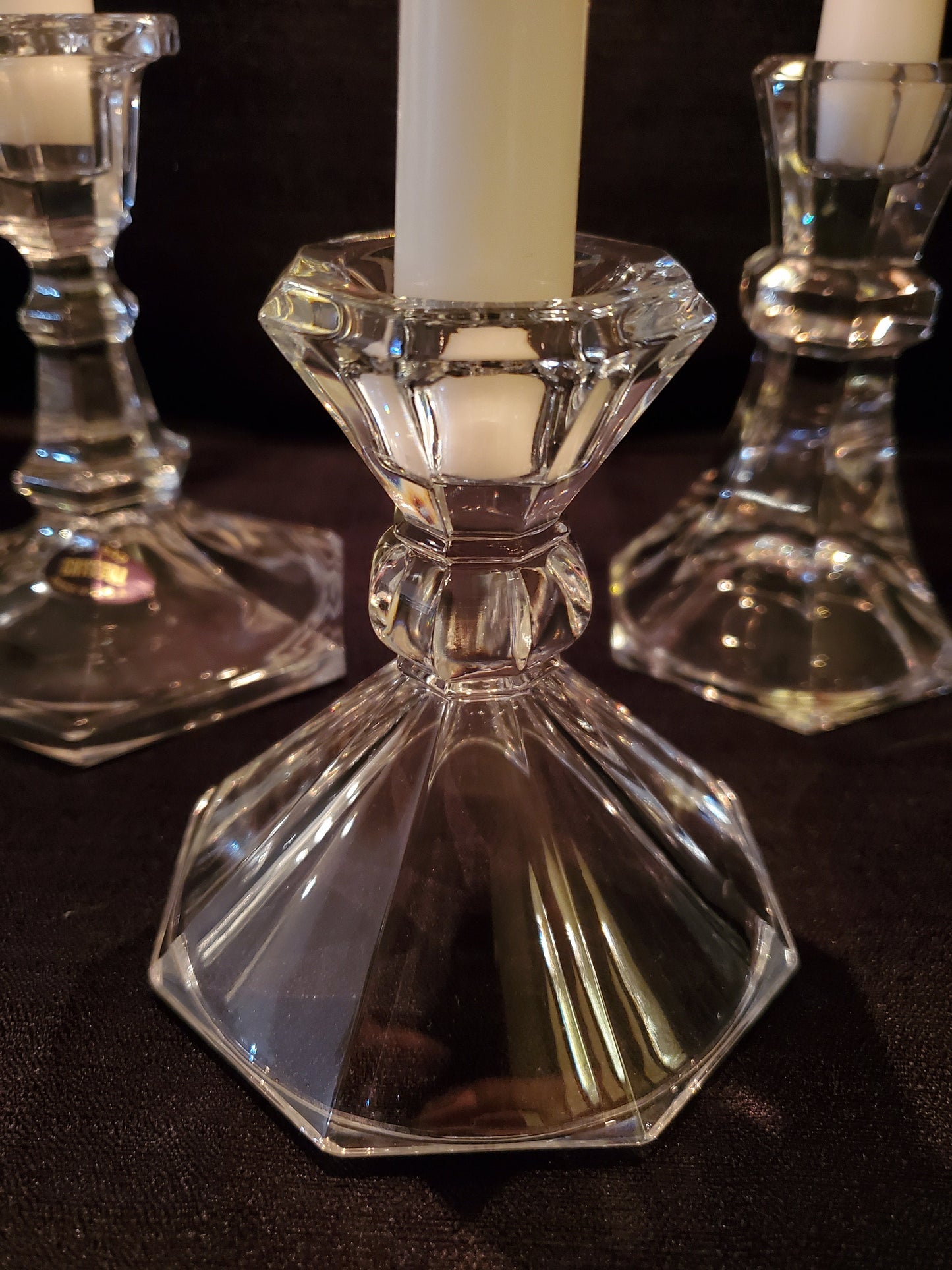 Lenox: More of a traditional/universal look, this pair by Lenox has a gorgeous stem that refracts the light beautifully. They stand 5" high and are 4 1/2" wide at the base. They have the 24% lead crystal stickers still on them.