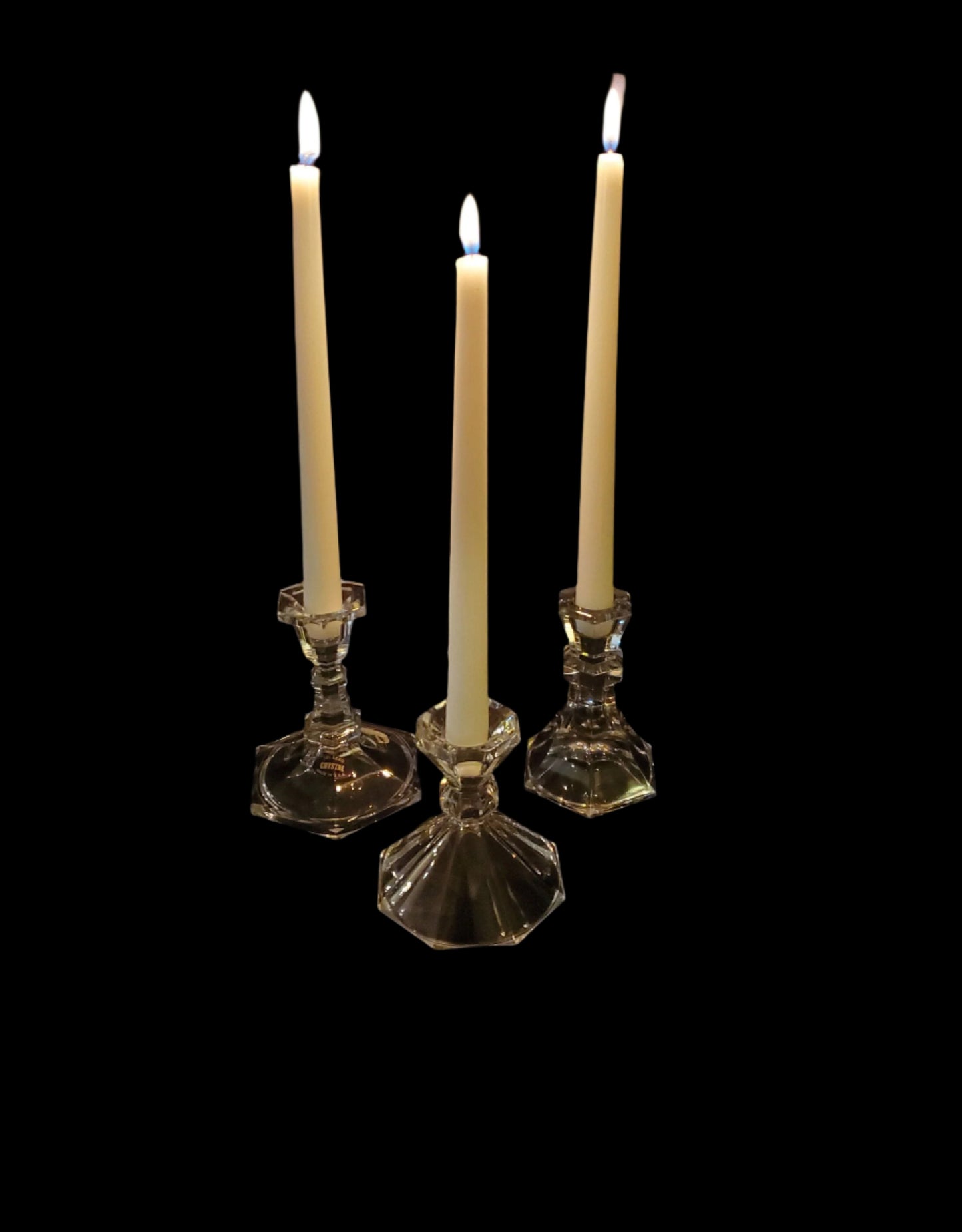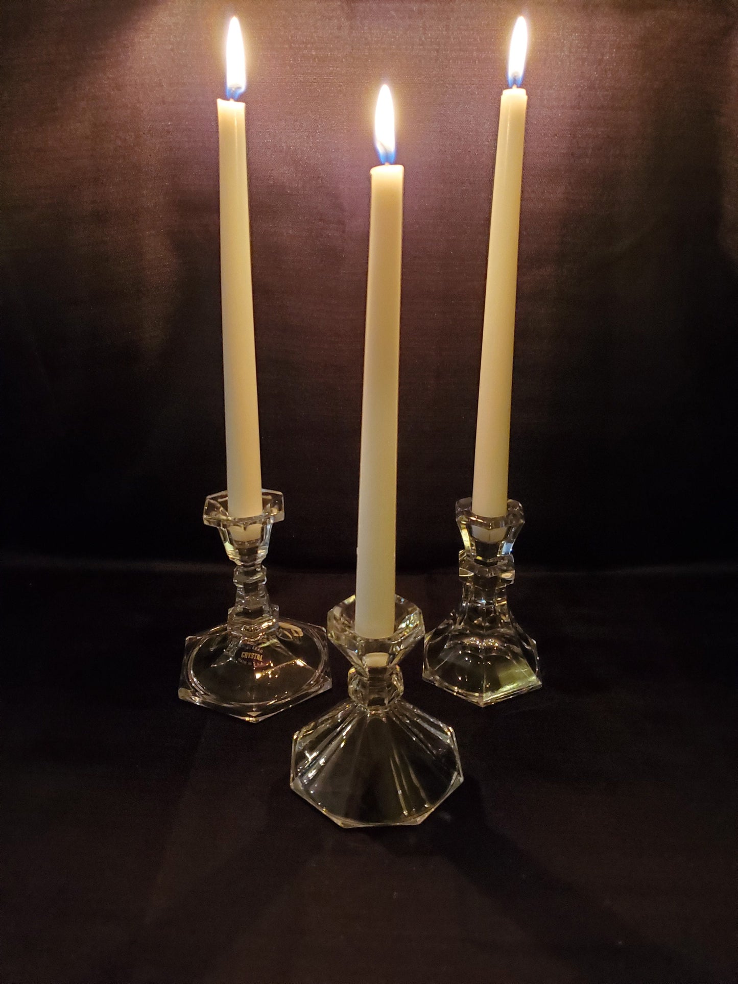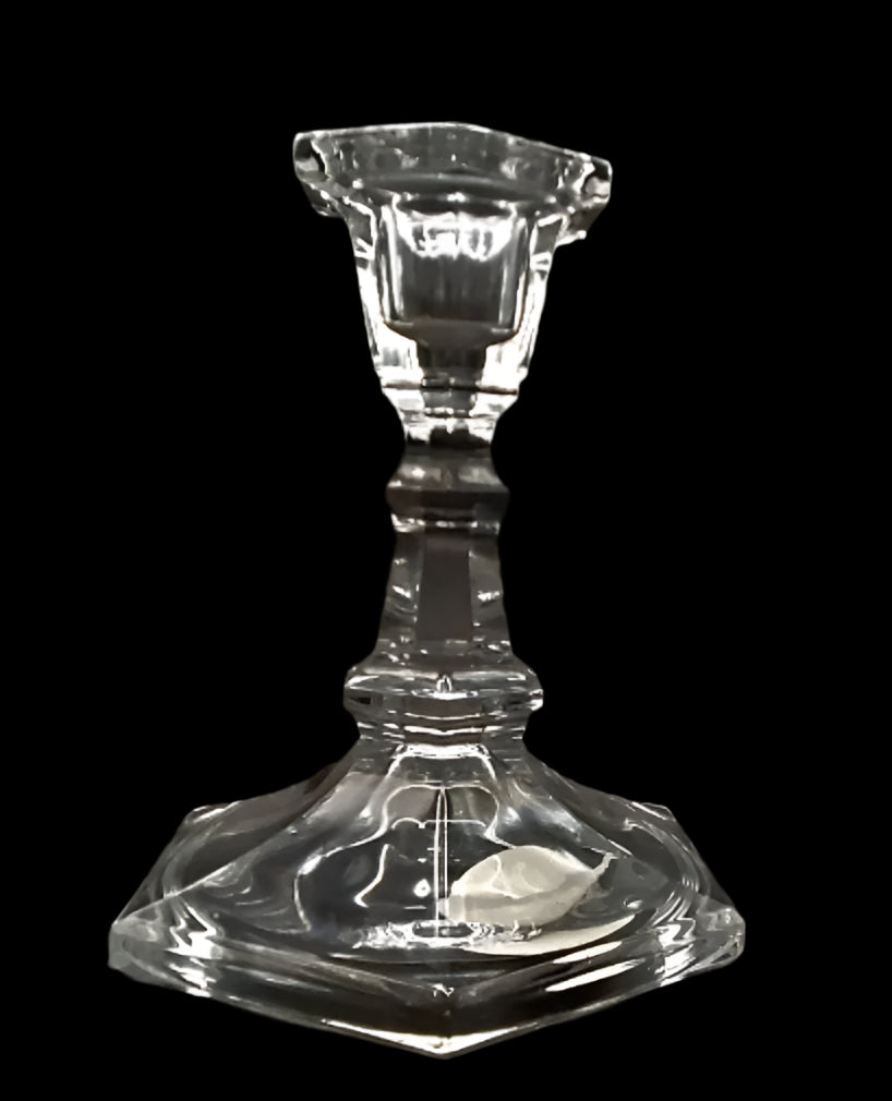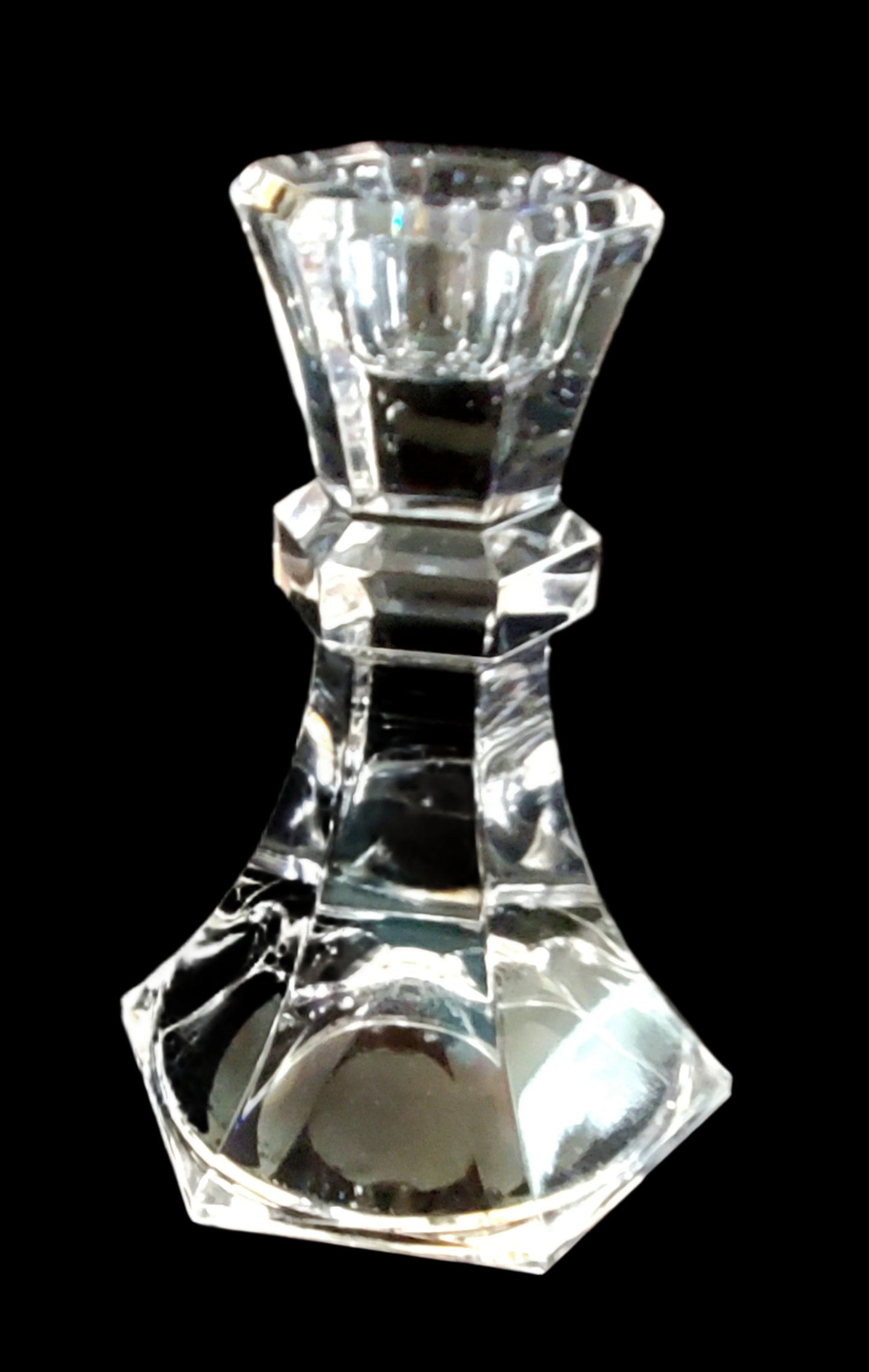 Lenox: More of a traditional/universal look, this pair by Lenox has a gorgeous stem that refracts the light beautifully. They stand 5" high and are 4 1/2" wide at the base. They have the 24% lead crystal stickers still on them.