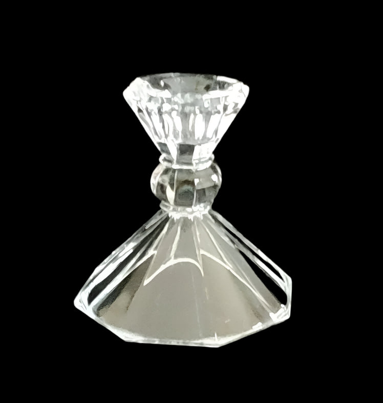 Towle: with more than 24% lead crystal, they are more clear, more brilliant, and more sparkling than crystal with a lower lead percentage. These measure 4 1/2" tall and the base is 3 1/2" at its widest point. They have an Art Deco vibe to them.